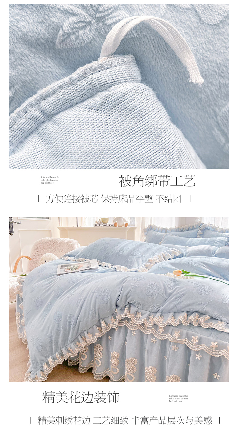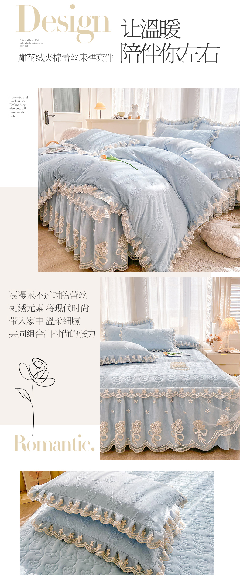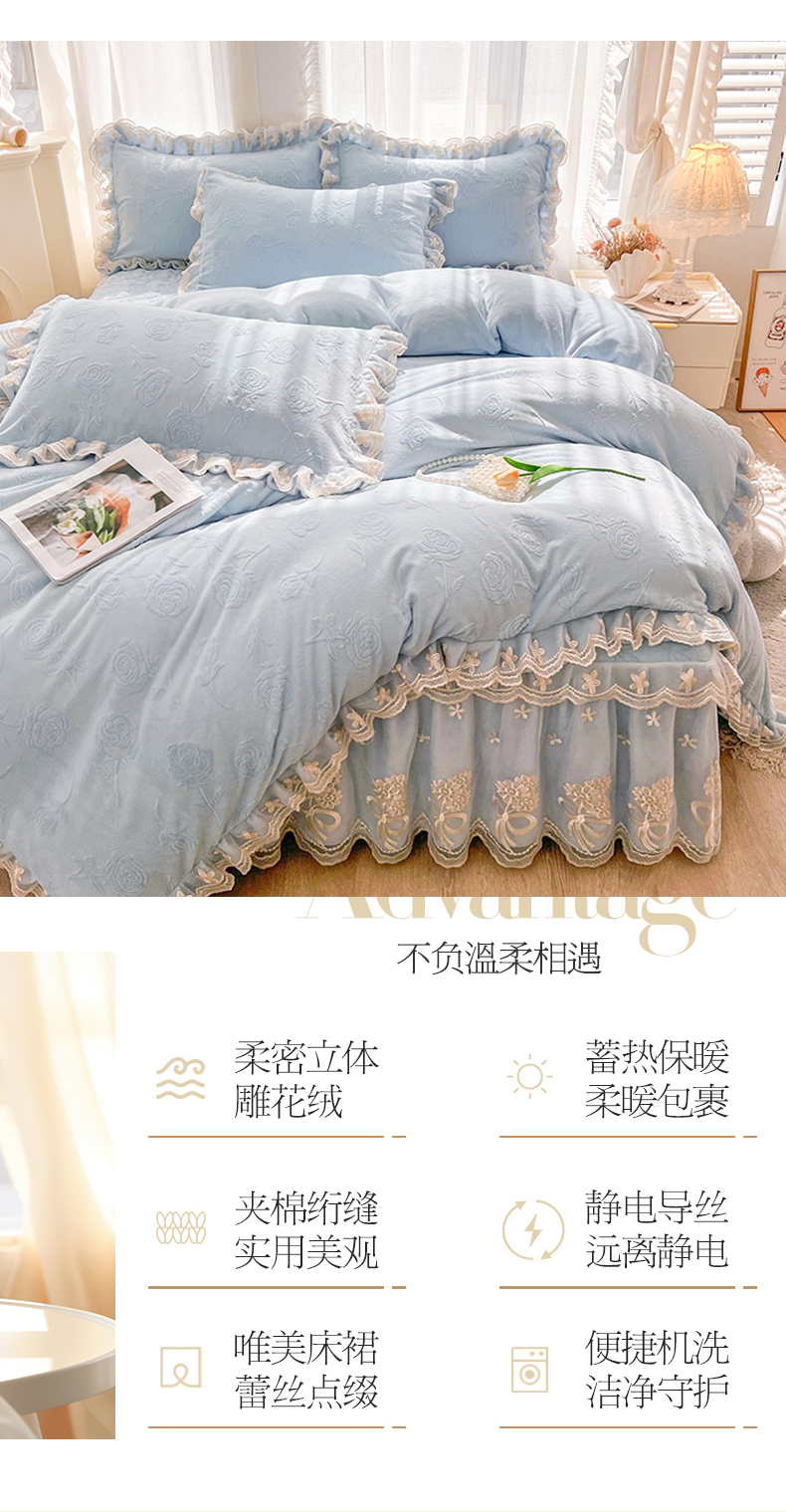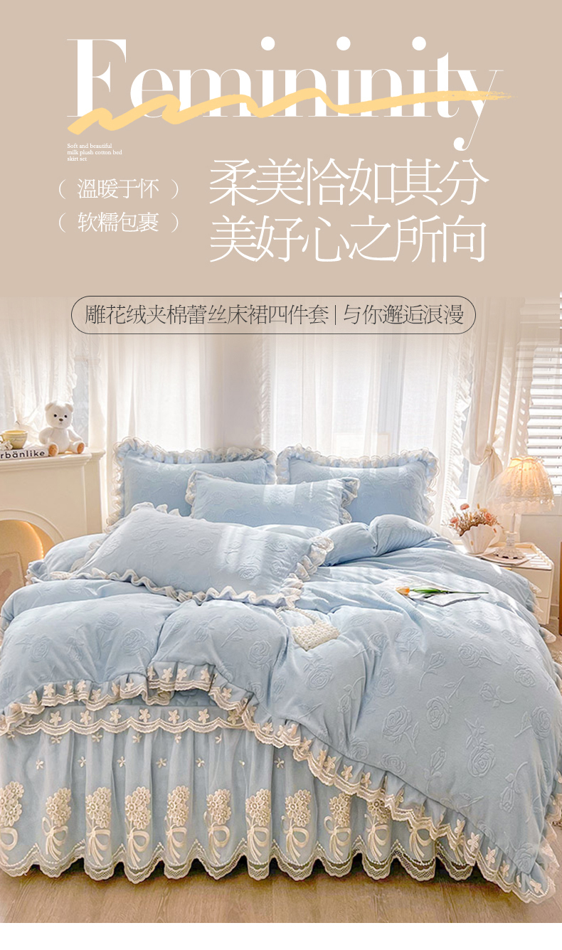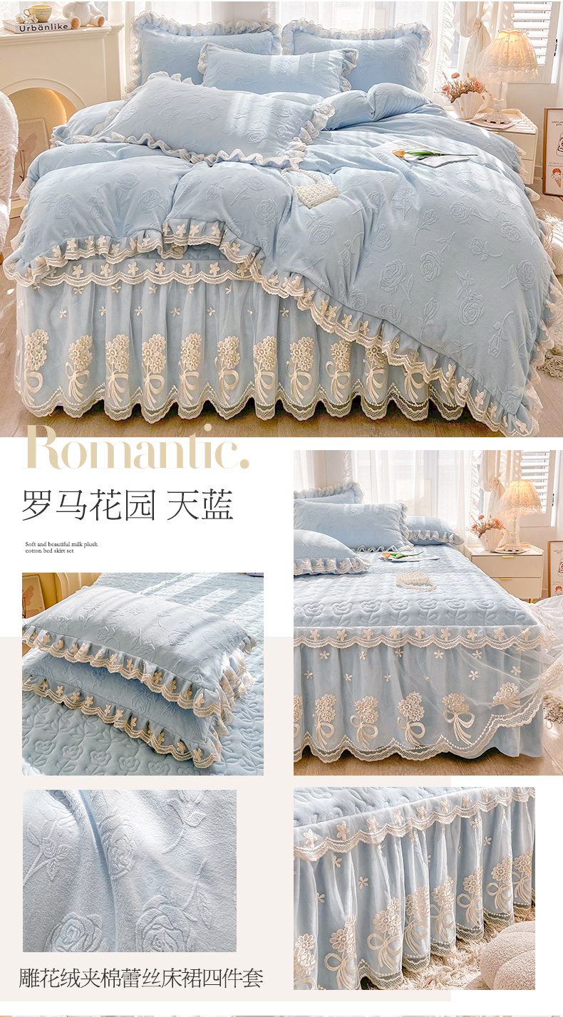 当前位置: 91家纺网 > 商品网购 > 床品套件 > 四件套 > 牛奶绒四件套 > 虹星家纺 2024新款雕花夹棉蕾丝牛奶绒床裙四件套-罗马花园 罗马花园 天蓝