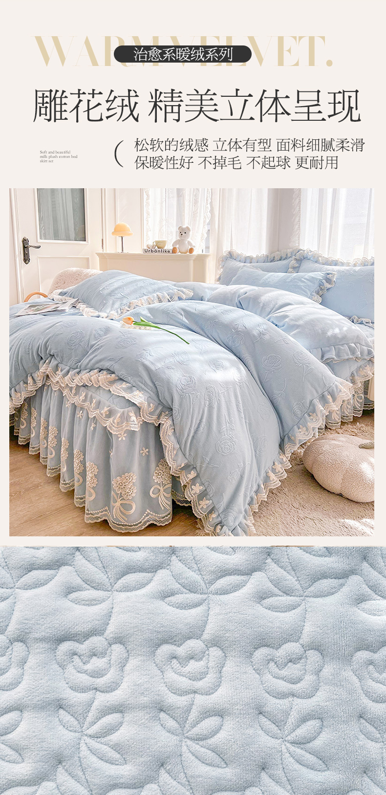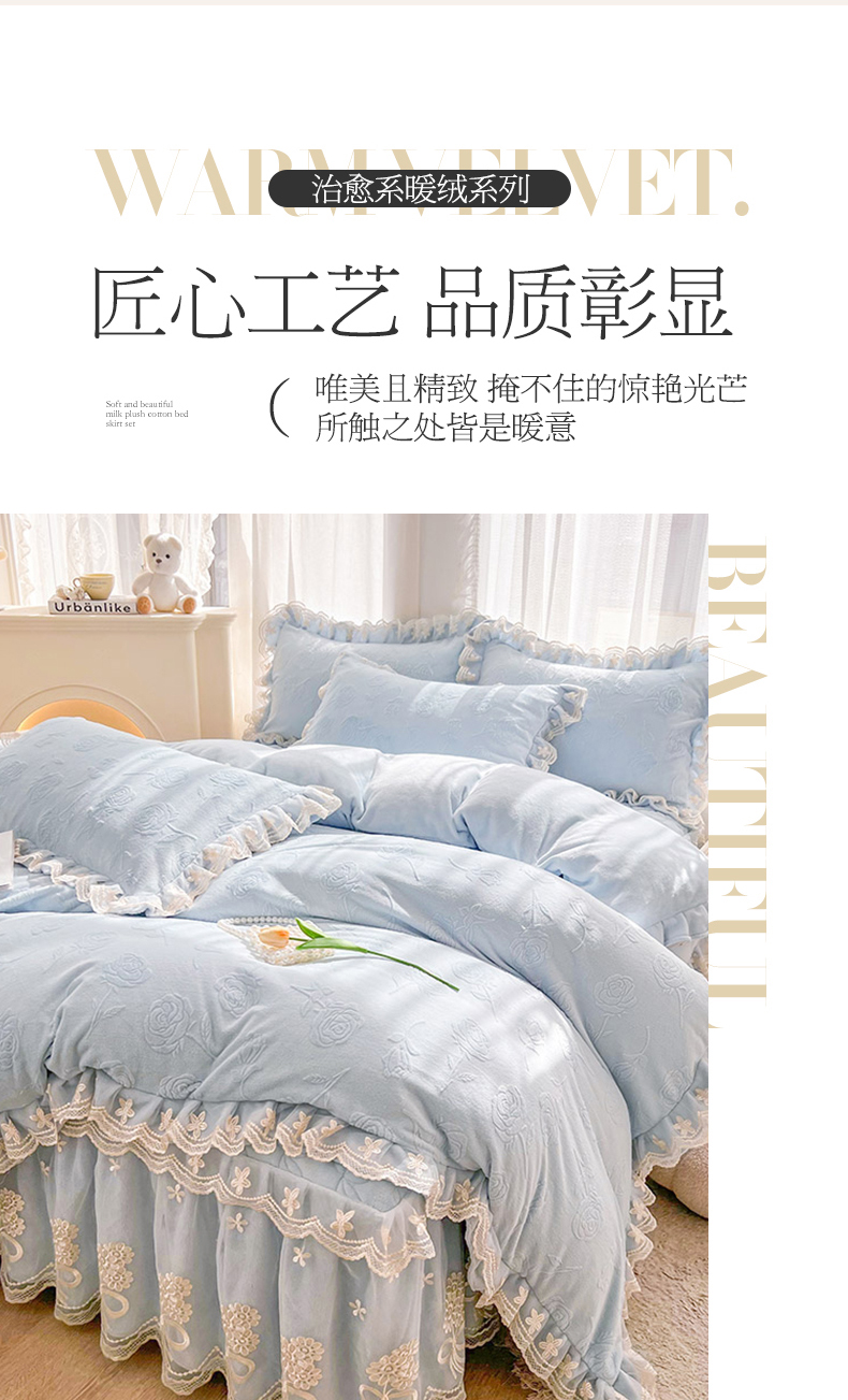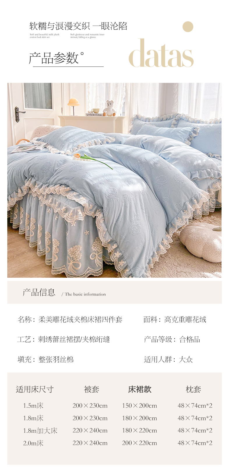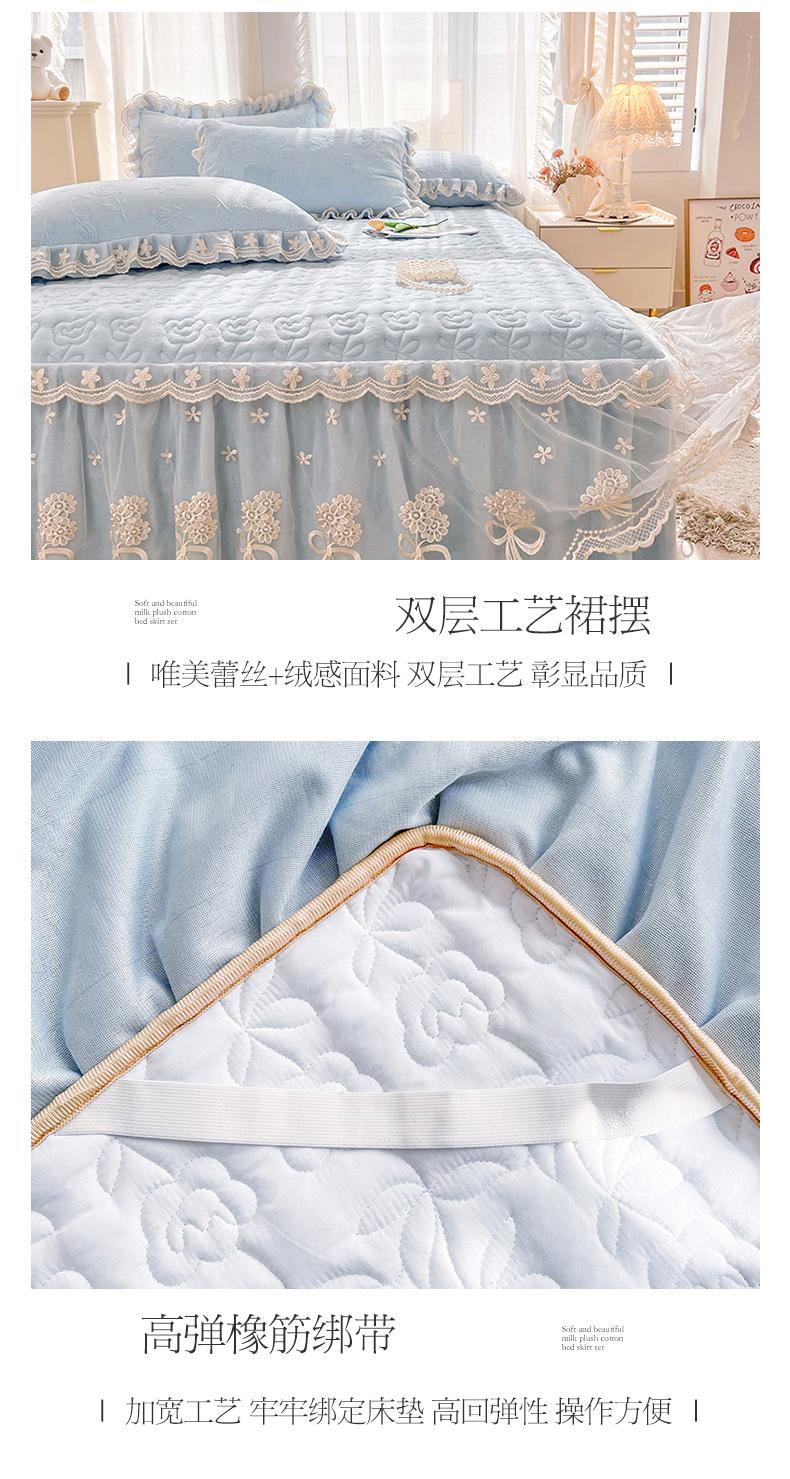 当前位置: 91家纺网 > 商品网购 > 床品套件 > 四件套 > 牛奶绒四件套 > 虹星家纺 2024新款雕花夹棉蕾丝牛奶绒床裙四件套-罗马花园 罗马花园 天蓝
