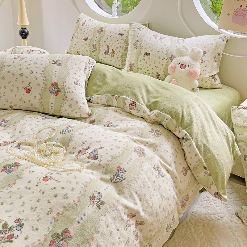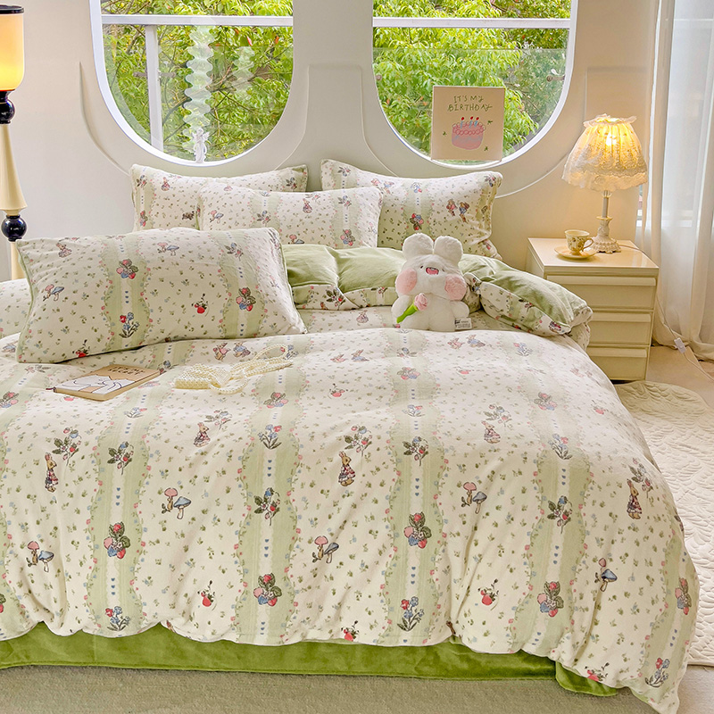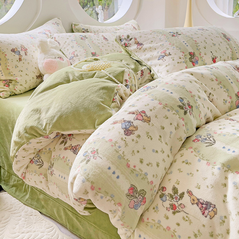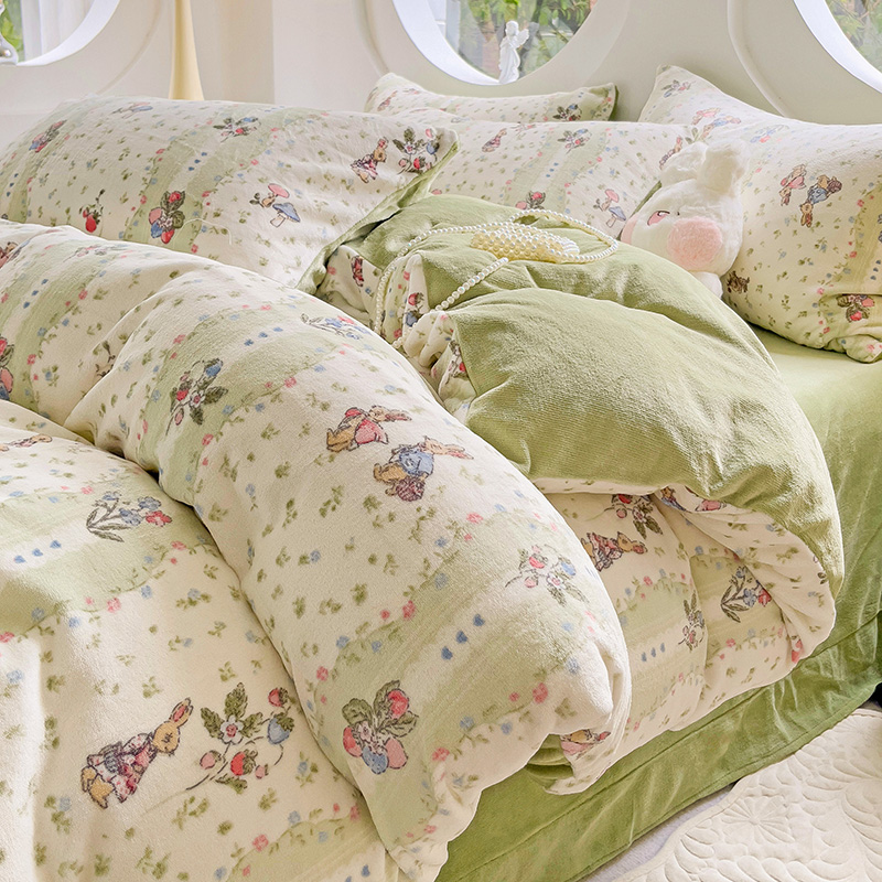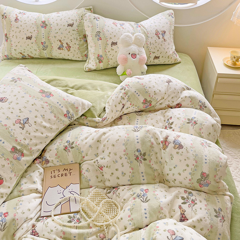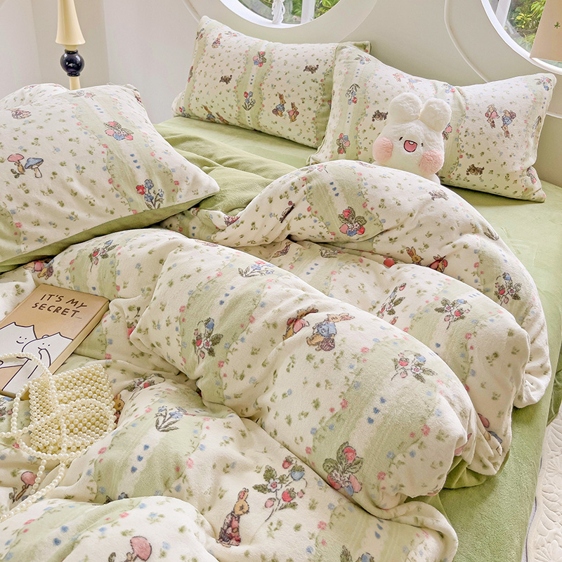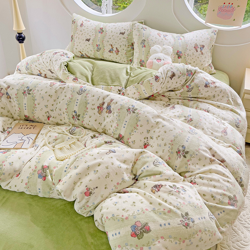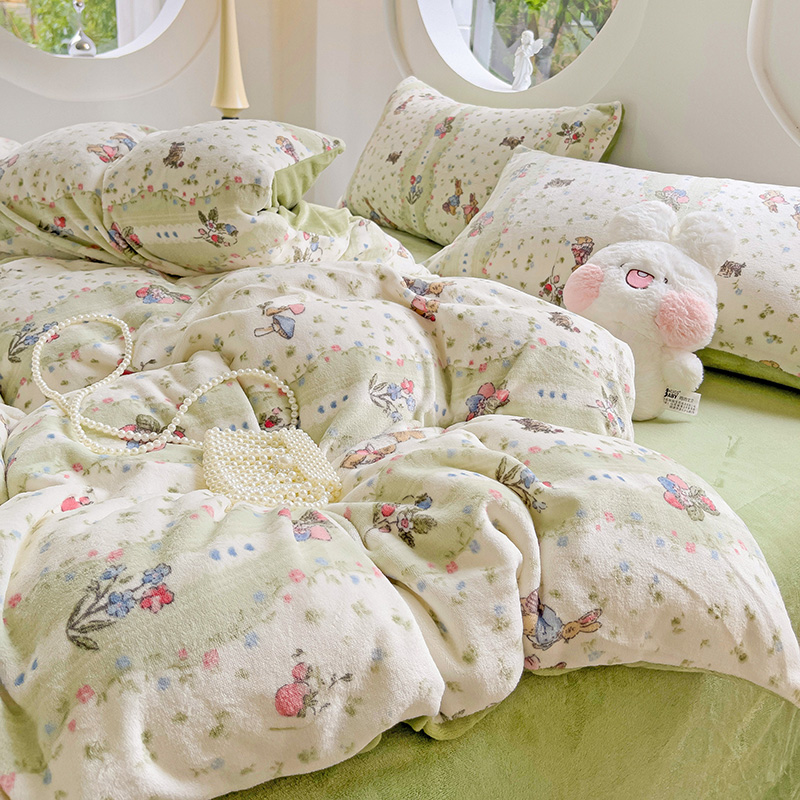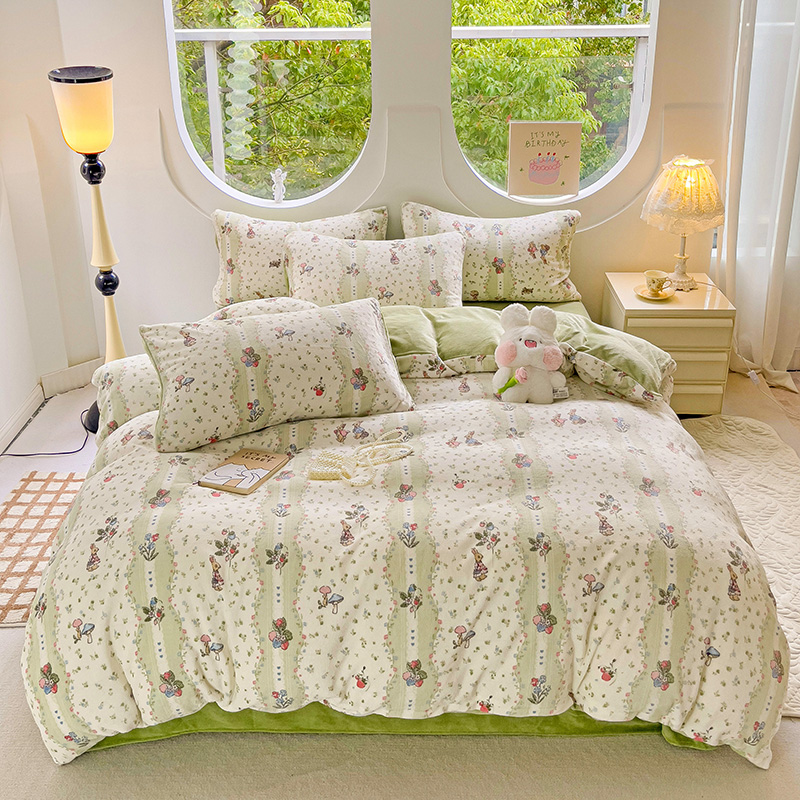 玉海棠家纺 2024新款6.5斤牛奶绒四件套 花开花兔绿