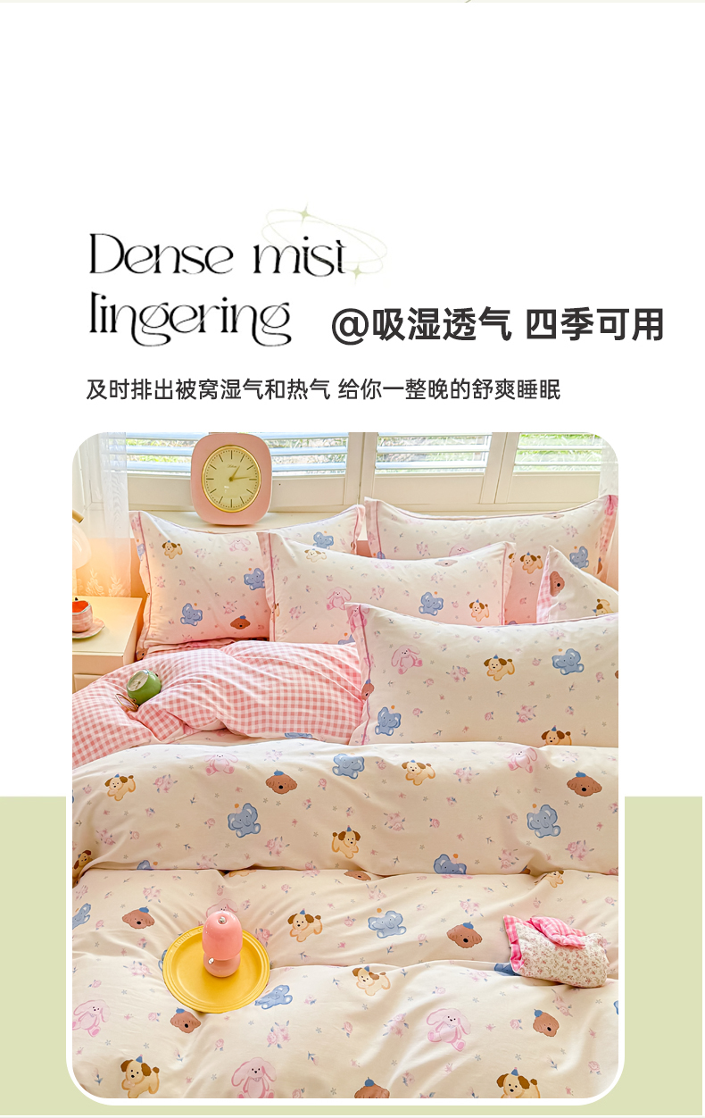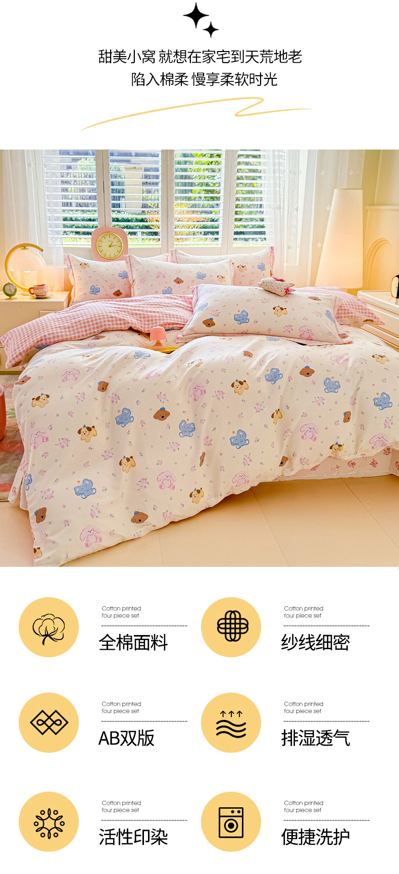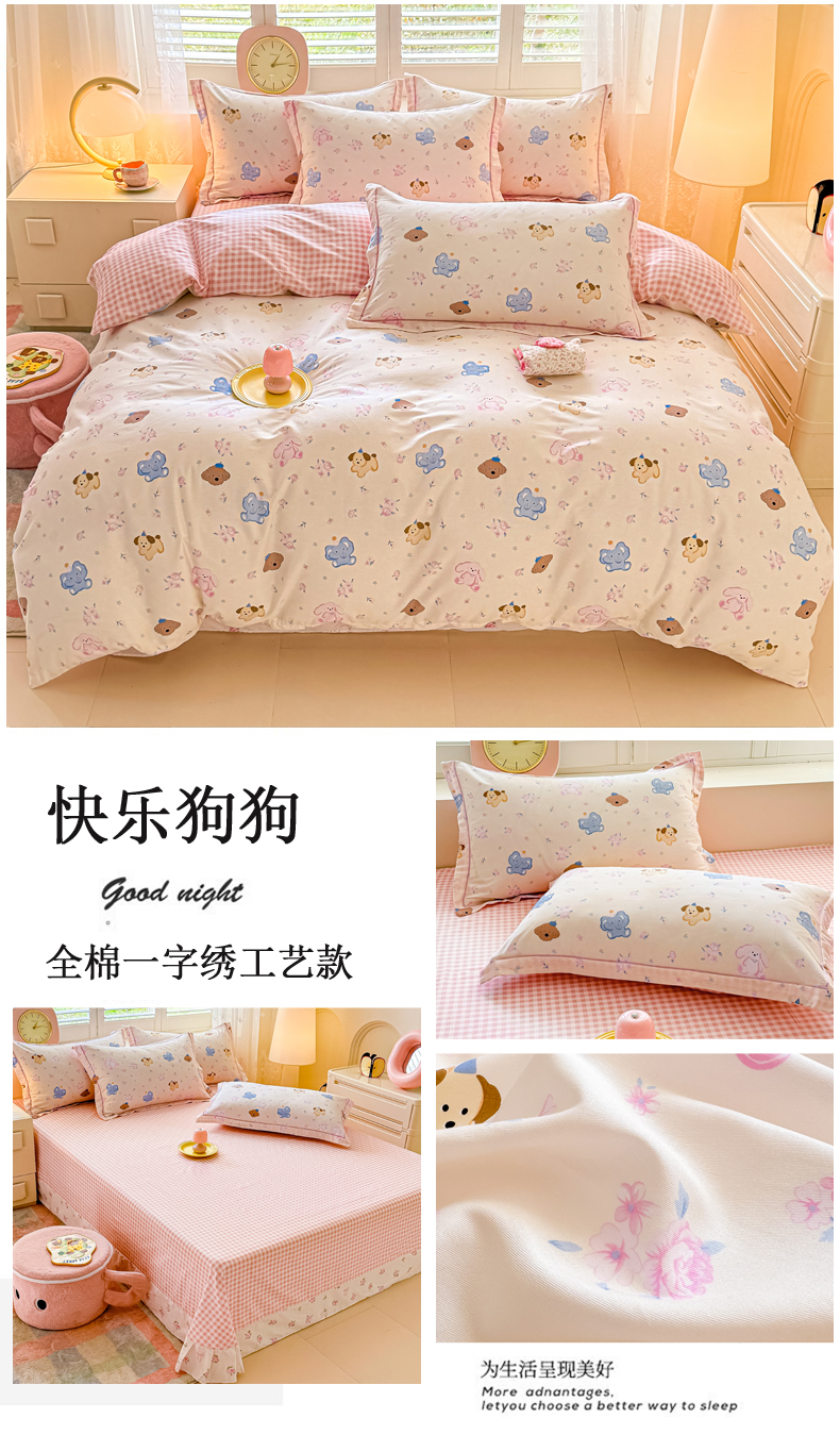 商品名称:洺兰家居 2025年新款全棉A类全喷气印花小清新床单床裙款四件套学生三件套 快乐狗狗