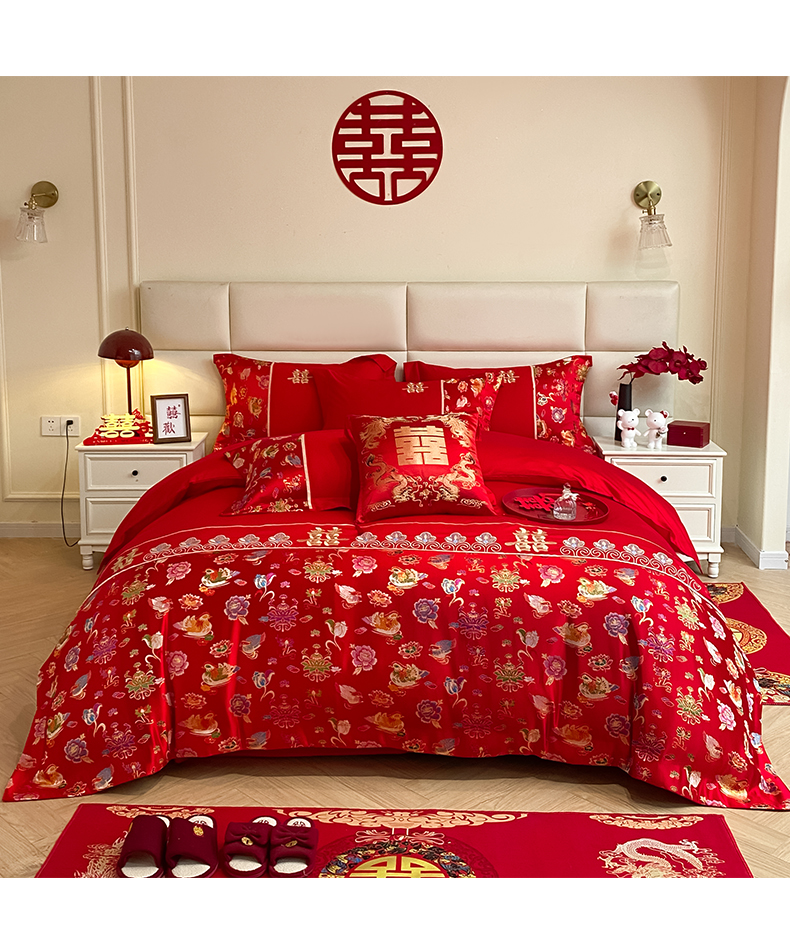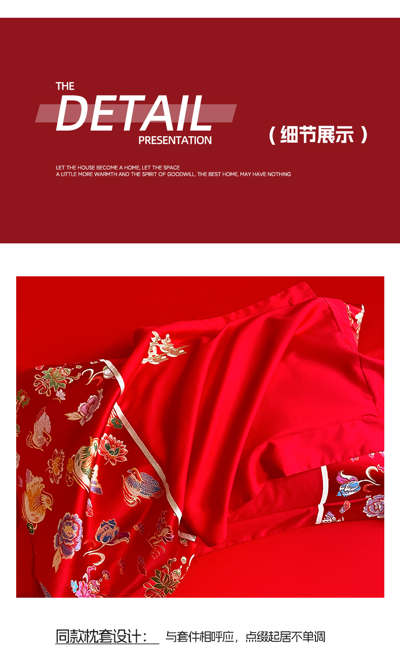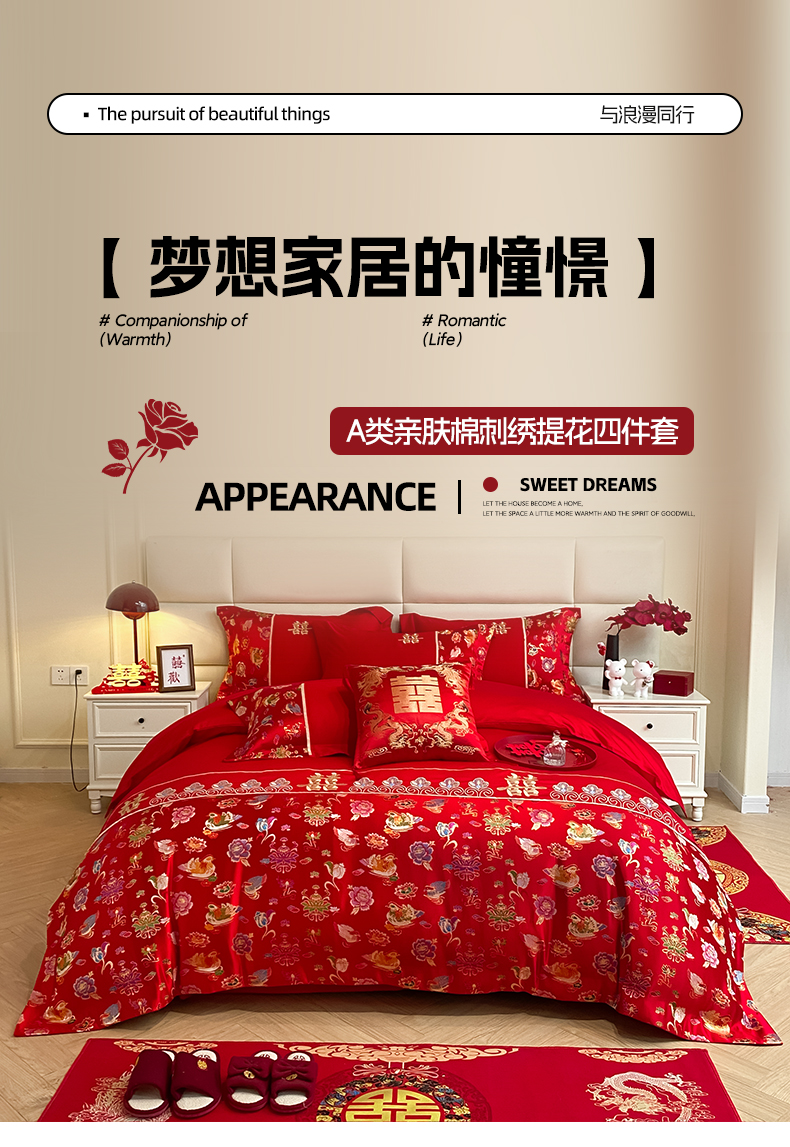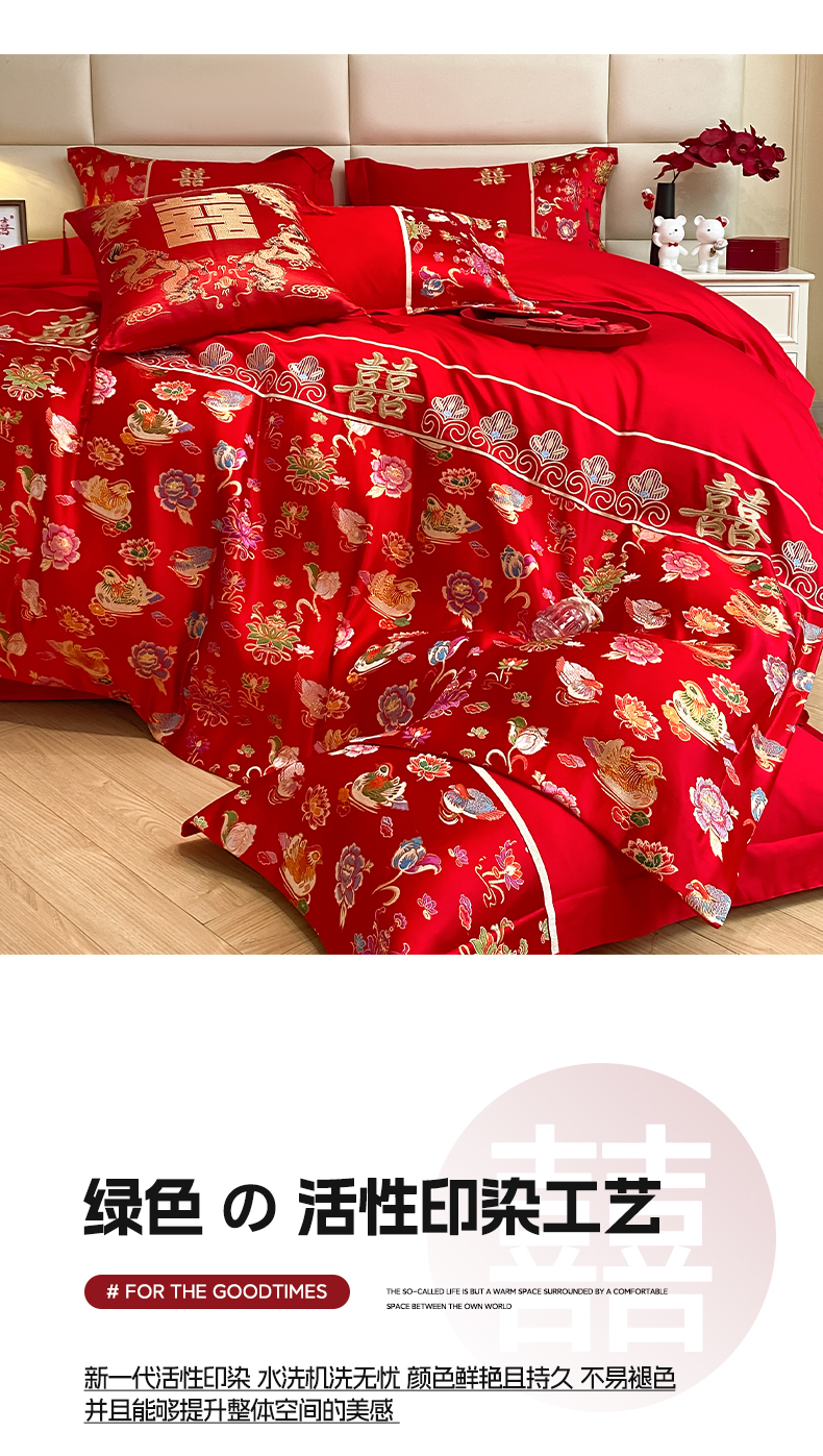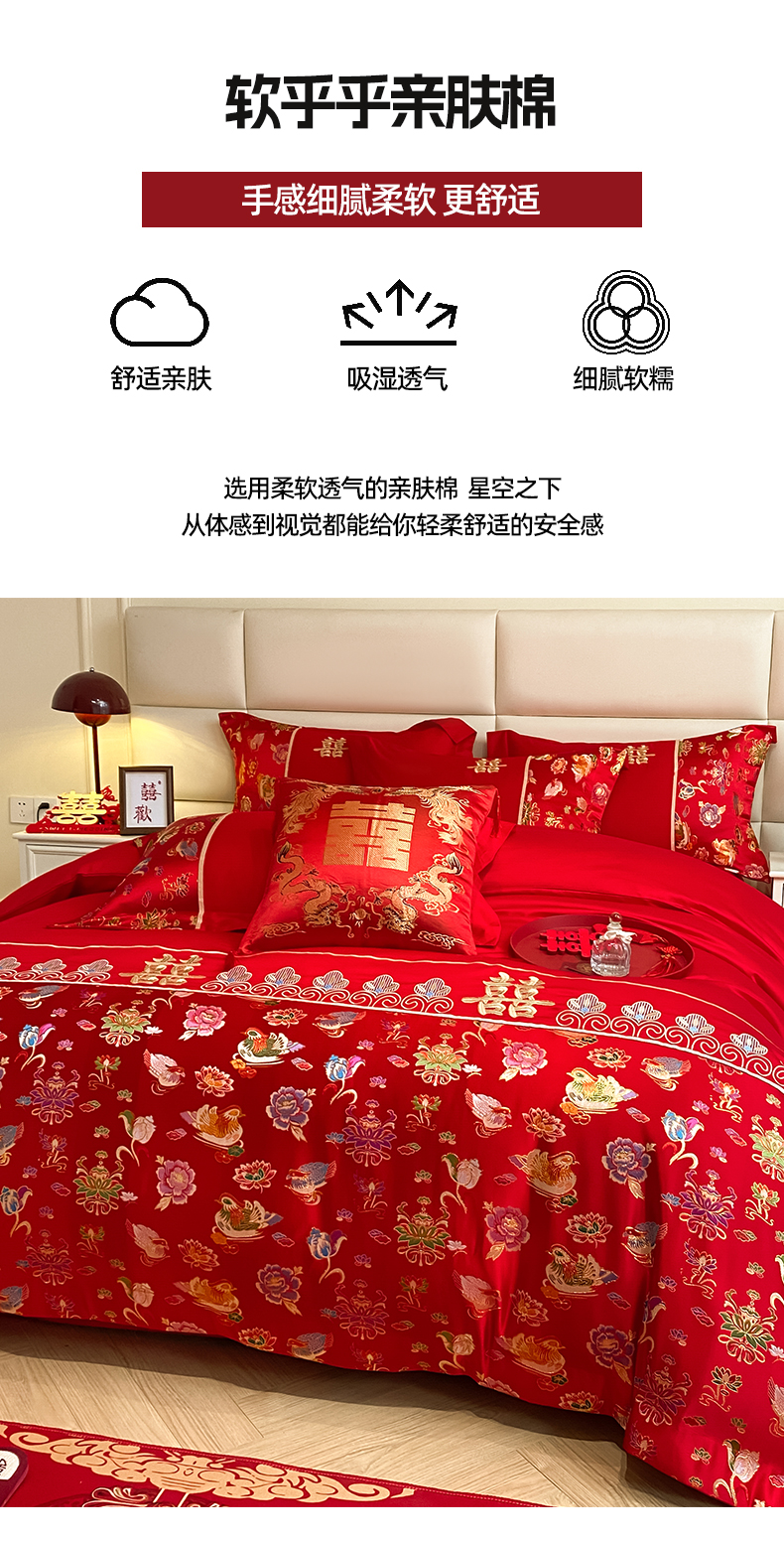 当前位置: 91家纺网 > 商品网购 > 床品套件 > 四件套 > 婚庆四件套 > 帝王家纺 2024新款A类亲肤棉刺绣锦缎提花婚庆四件套 鸳俦凤侣