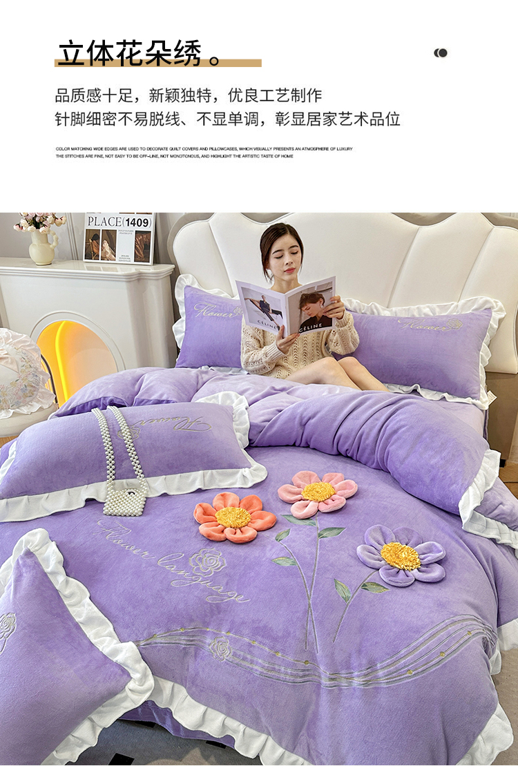 9斤高端韩版少女心法式公主风贴布绣花牛奶绒四件套小清新绒兔毛绒法莱绒床盖被套丝绒兔毛绒法莱绒床盖被套 锦上添花-梦幻紫