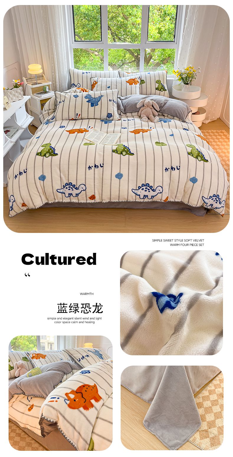 当前位置: 91家纺网 > 商品网购 > 床品套件 > 四件套 > 牛奶绒四件套 > (买家秀 爆款不断货)A类母婴级双面牛奶绒四件套三角针珊瑚绒雪花绒四件套高克重卡通牛奶绒四件套花卉 蓝绿恐龙
