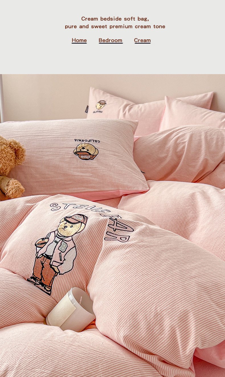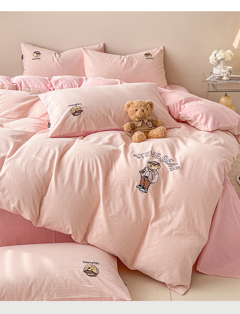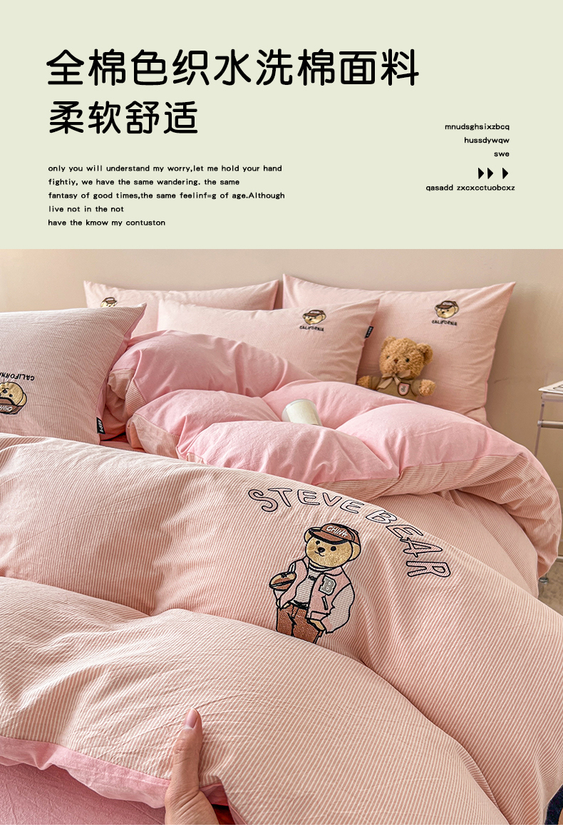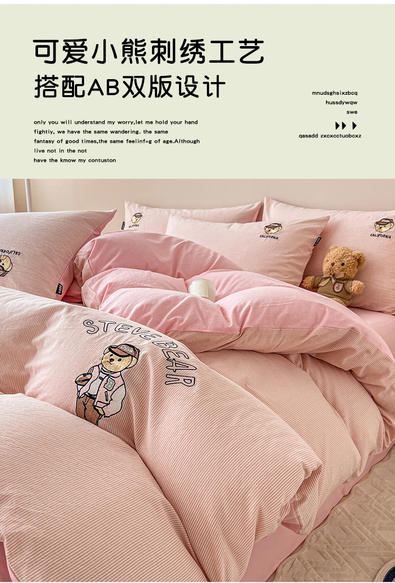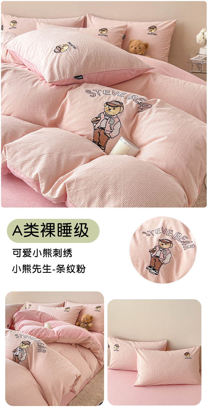 当前位置: 91家纺网 > 商品网购 > 床品套件 > 四件套 > 水洗棉四件套 > 2025新款A类全棉色织水洗棉可爱小熊刺绣四件套 小熊先生-条纹粉