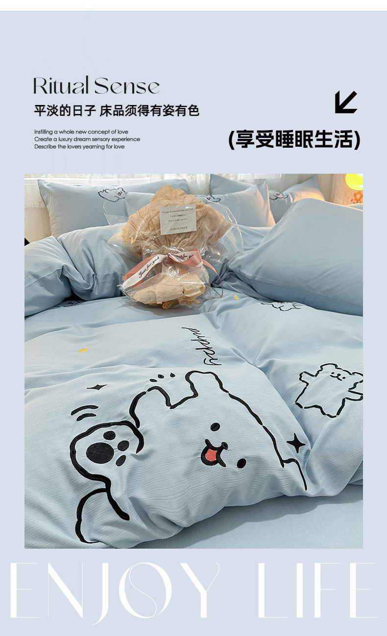 当前位置: 91家纺网 > 商品网购 > 床品套件 > 四件套 > 小竺棉四件套 > 多乐家纺 2025新款超柔加厚有氧提花针织小竺棉绣花四件套(提供买家秀) 小白-蓝蓝