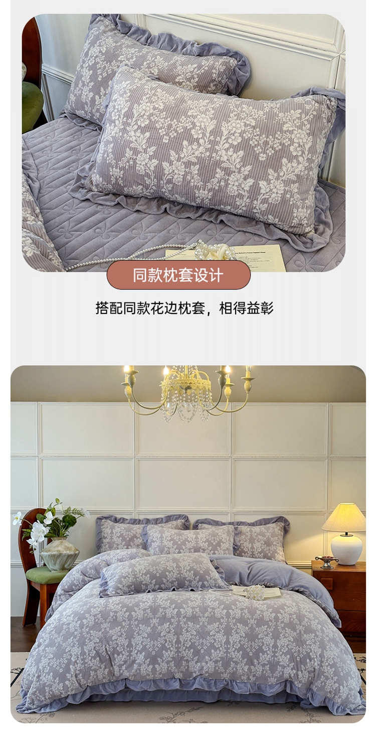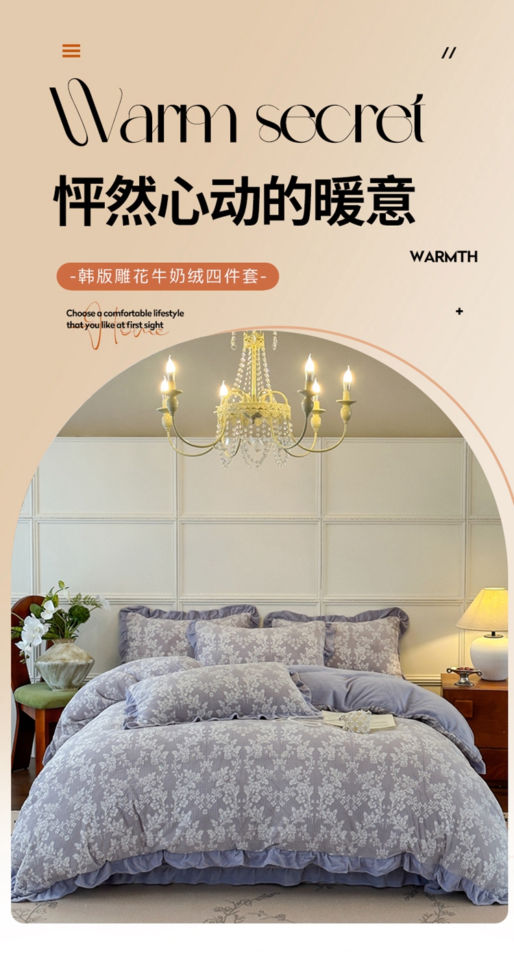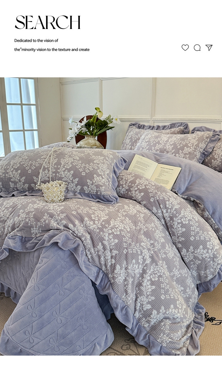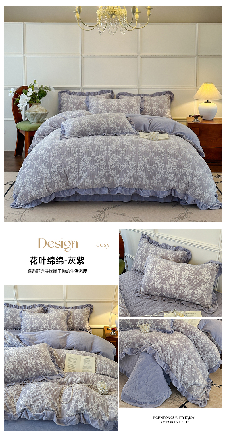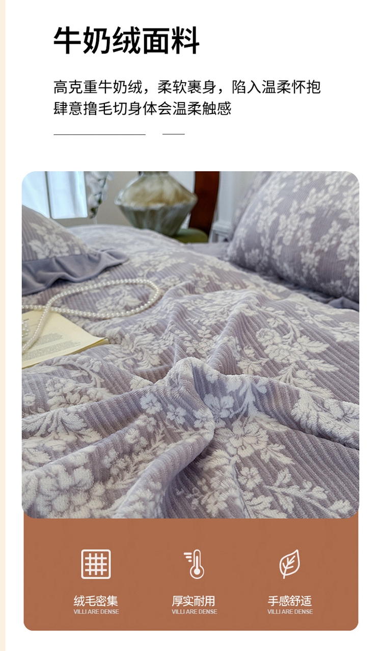 当前位置: 91家纺网 > 商品网购 > 床品套件 > 四件套 > 牛奶绒四件套 > (买家秀爆款不断货)A类母婴级牛奶雕花绒四件套珊瑚绒四件套雪花绒四件套韩版公主风雕花牛奶绒床盖四件套 花叶绵绵-灰紫