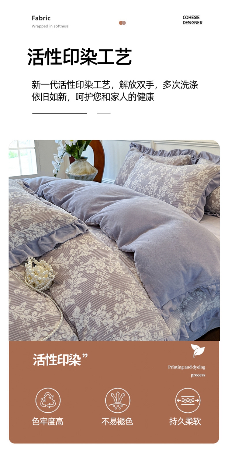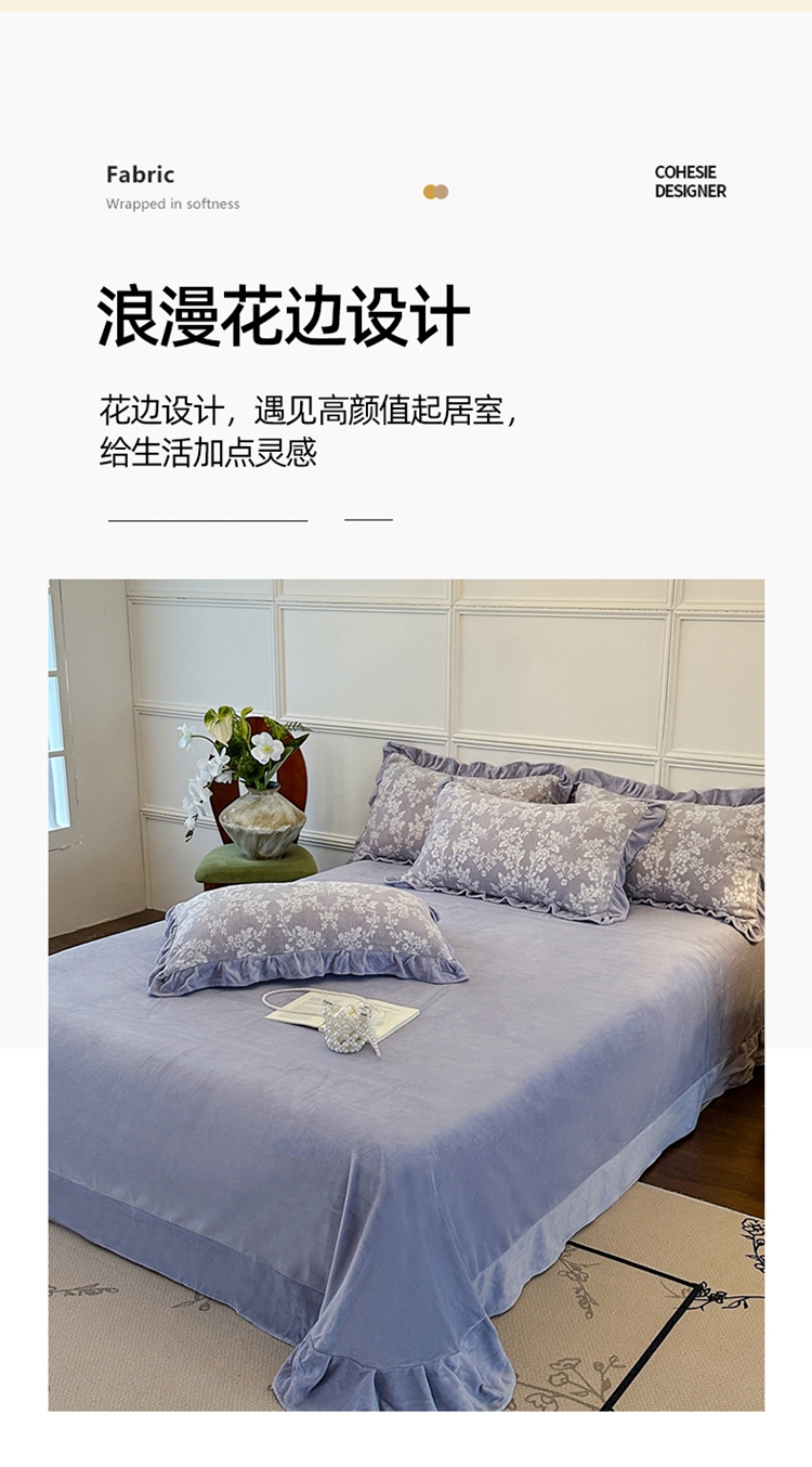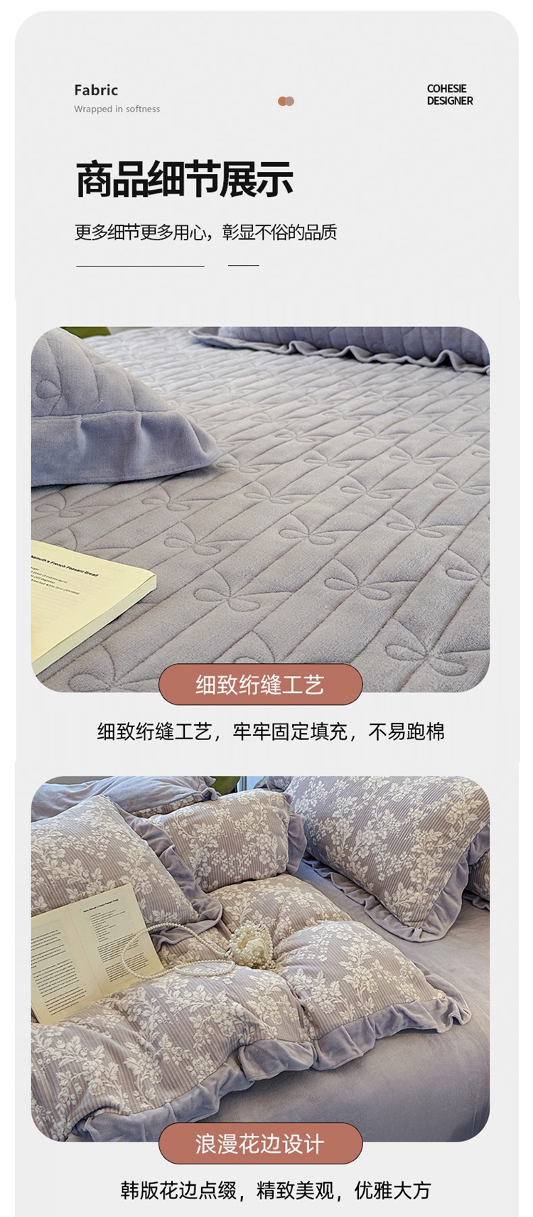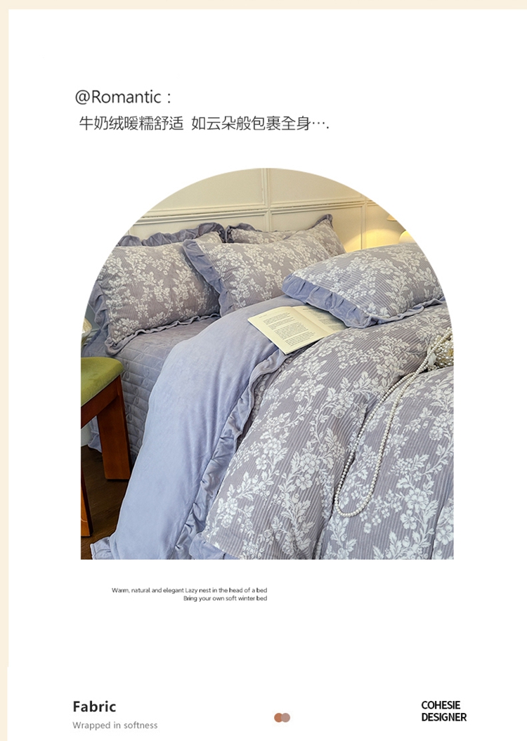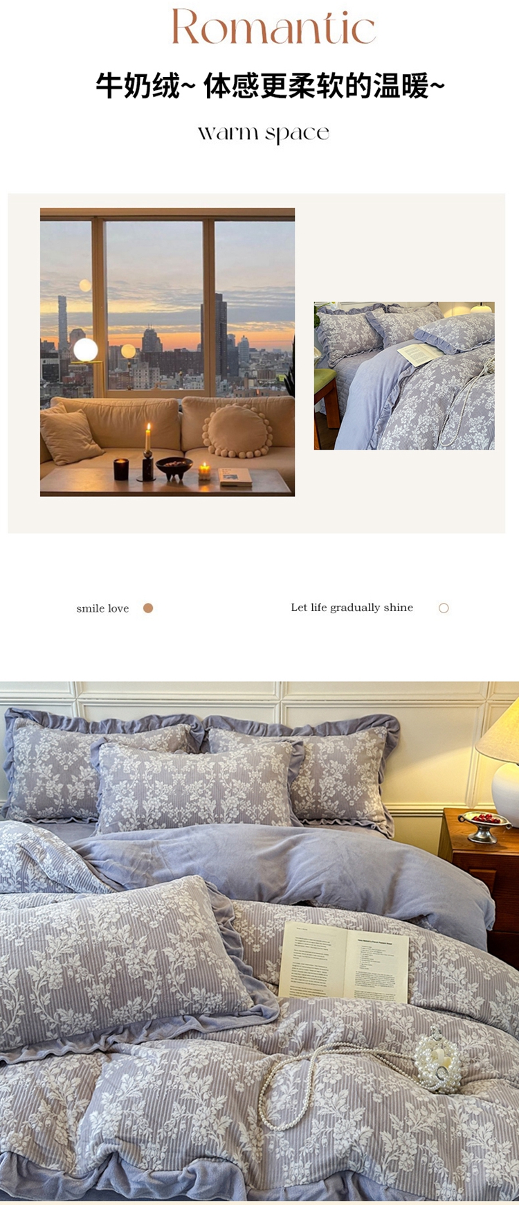 当前位置: 91家纺网 > 商品网购 > 床品套件 > 四件套 > 牛奶绒四件套 > (买家秀爆款不断货)A类母婴级牛奶雕花绒四件套珊瑚绒四件套雪花绒四件套韩版公主风雕花牛奶绒床盖四件套 花叶绵绵-灰紫