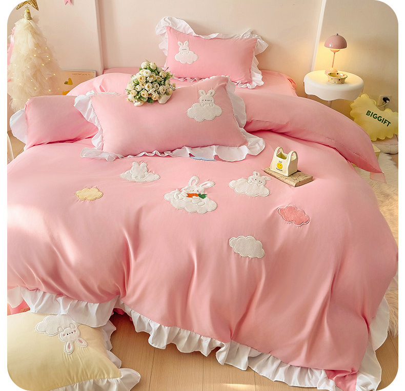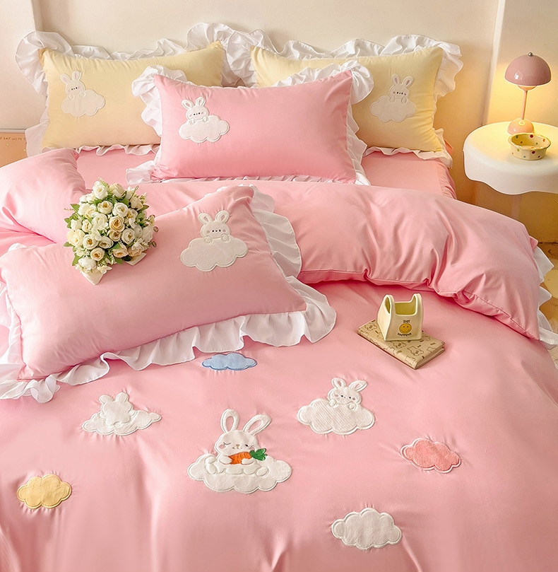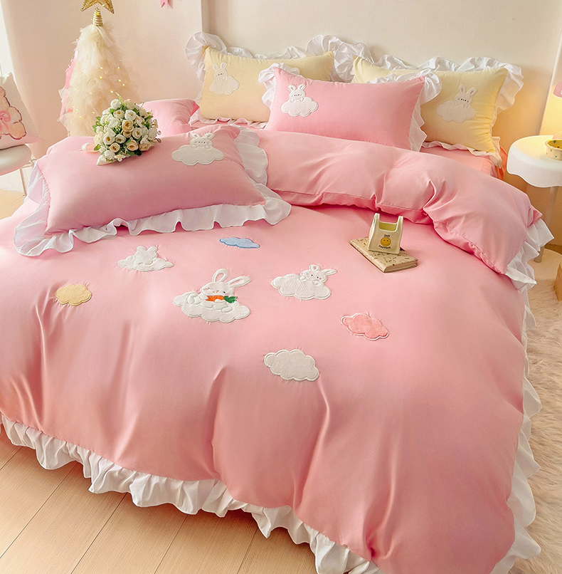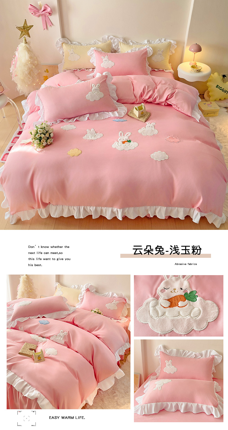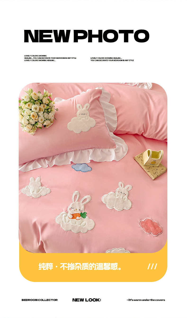 当前位置: 91家纺网 > 商品网购 > 床品套件 > 四件套 > 水洗棉四件套 > 慕语家纺 2025新款韩版水洗磨毛棉卡通贴布绣四件套-云朵兔 云朵兔-浅玉粉