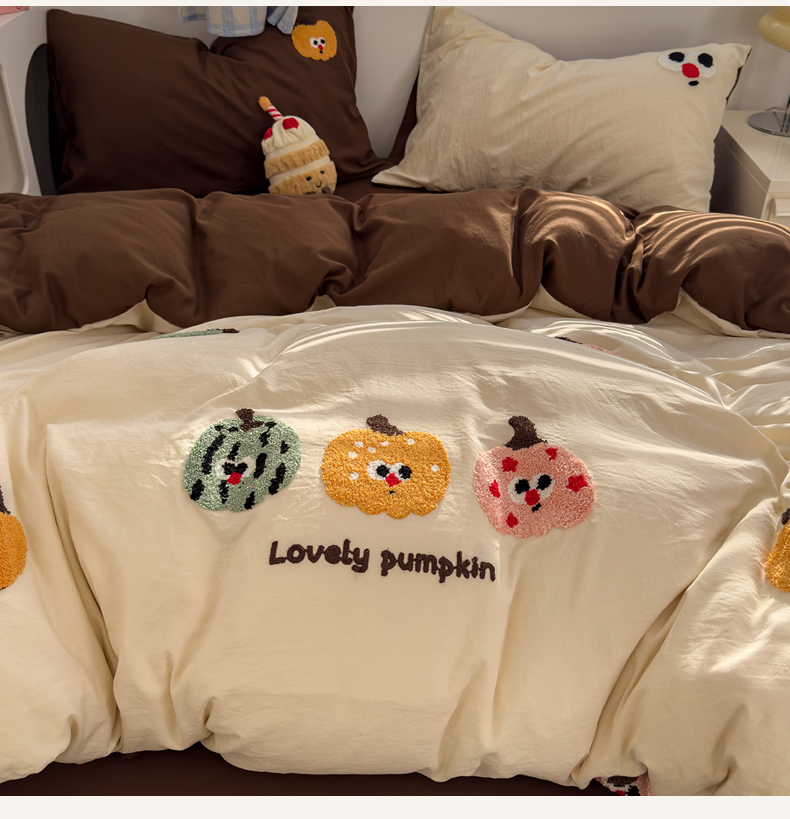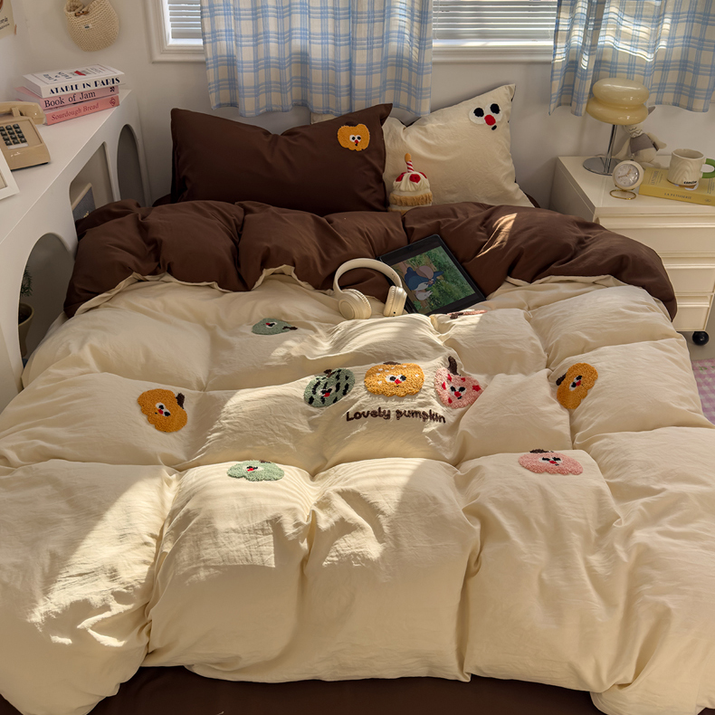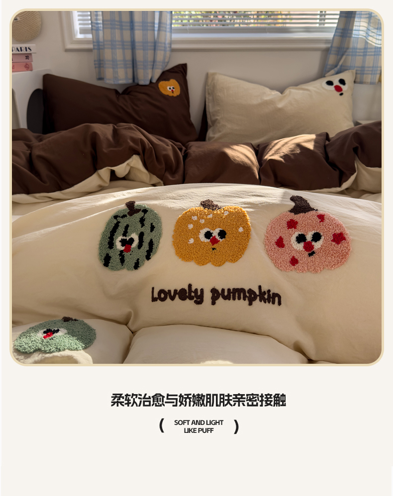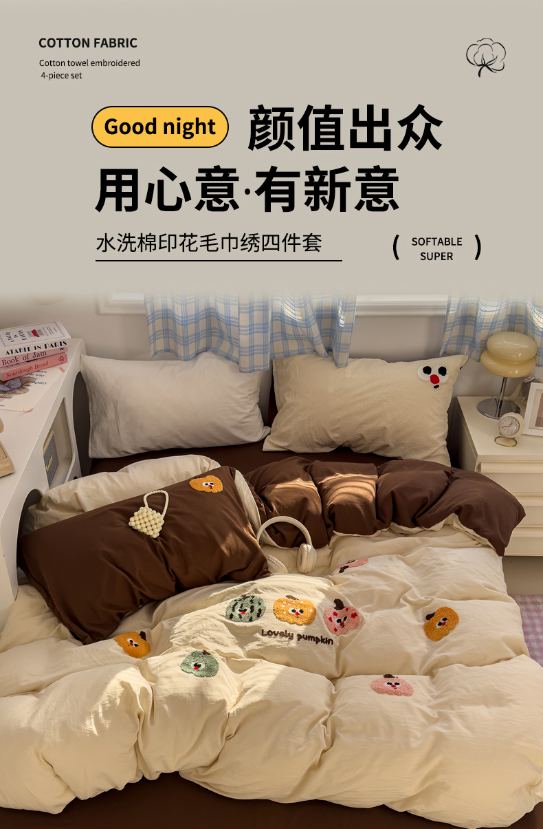当前位置: 91家纺网 > 商品网购 > 床品套件 > 四件套 > 水洗棉四件套 > 优兰朵 2025新款亲肤卡通水洗棉毛巾绣学生床品四件套 大眼南瓜奶咖