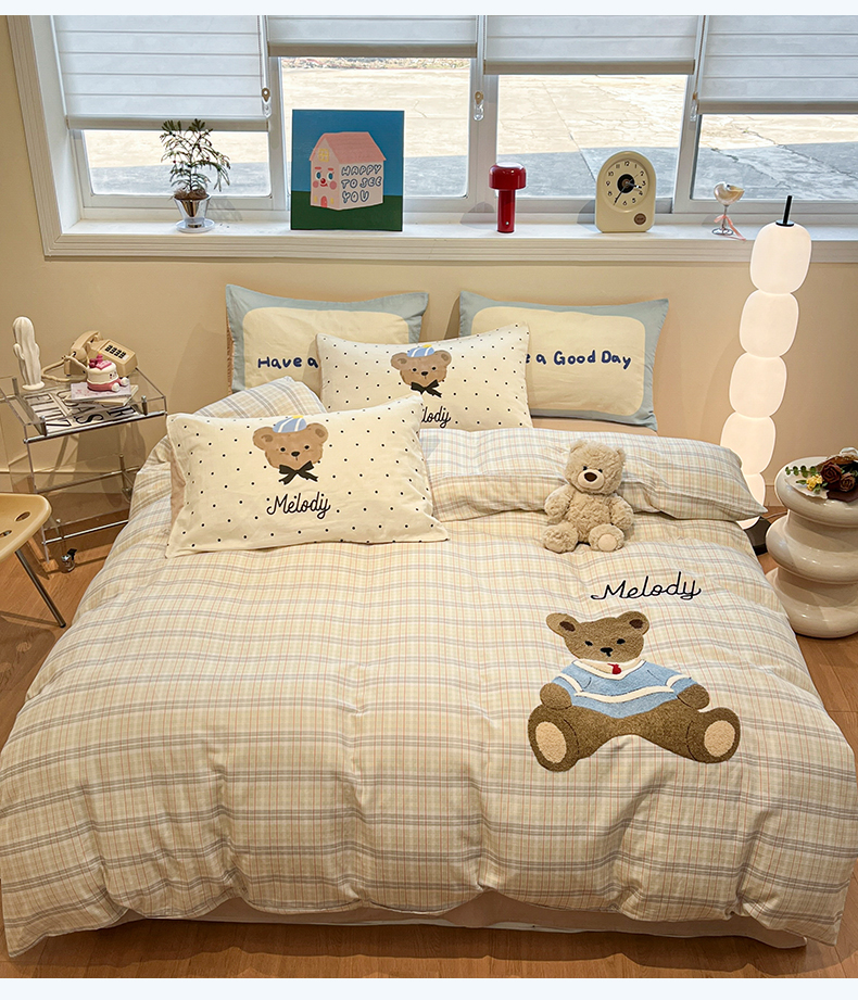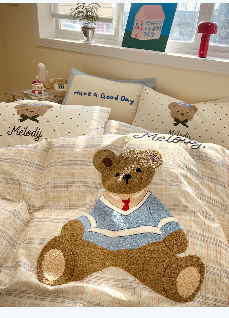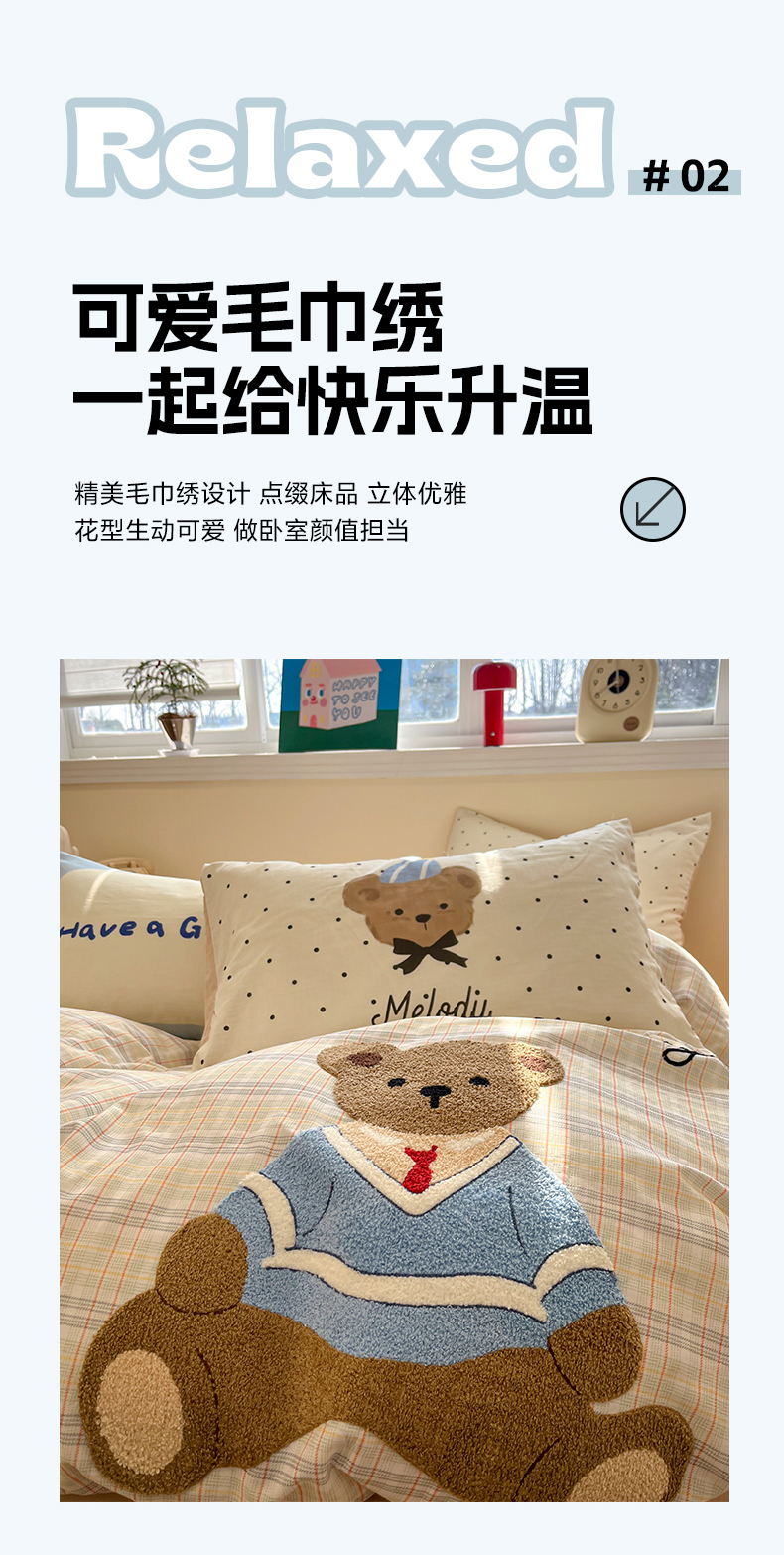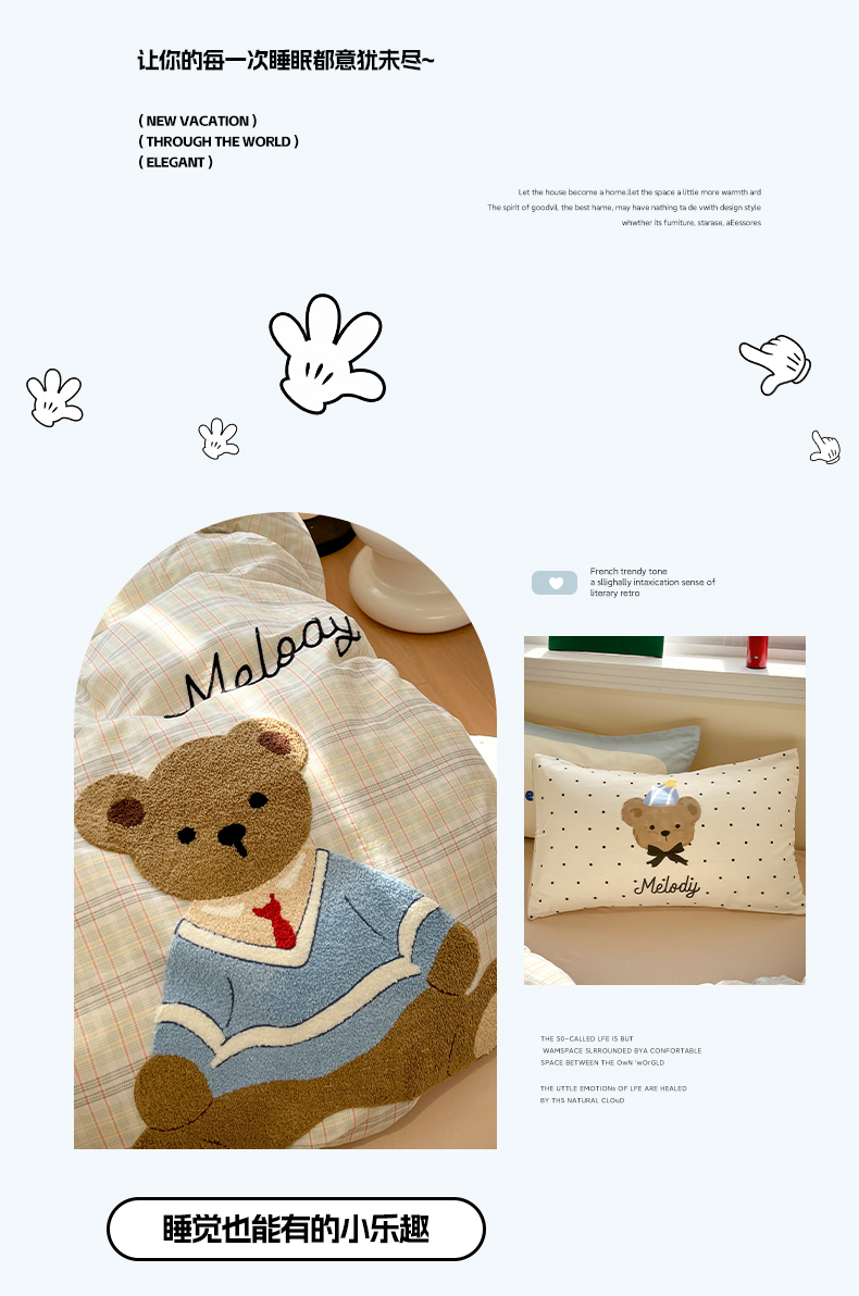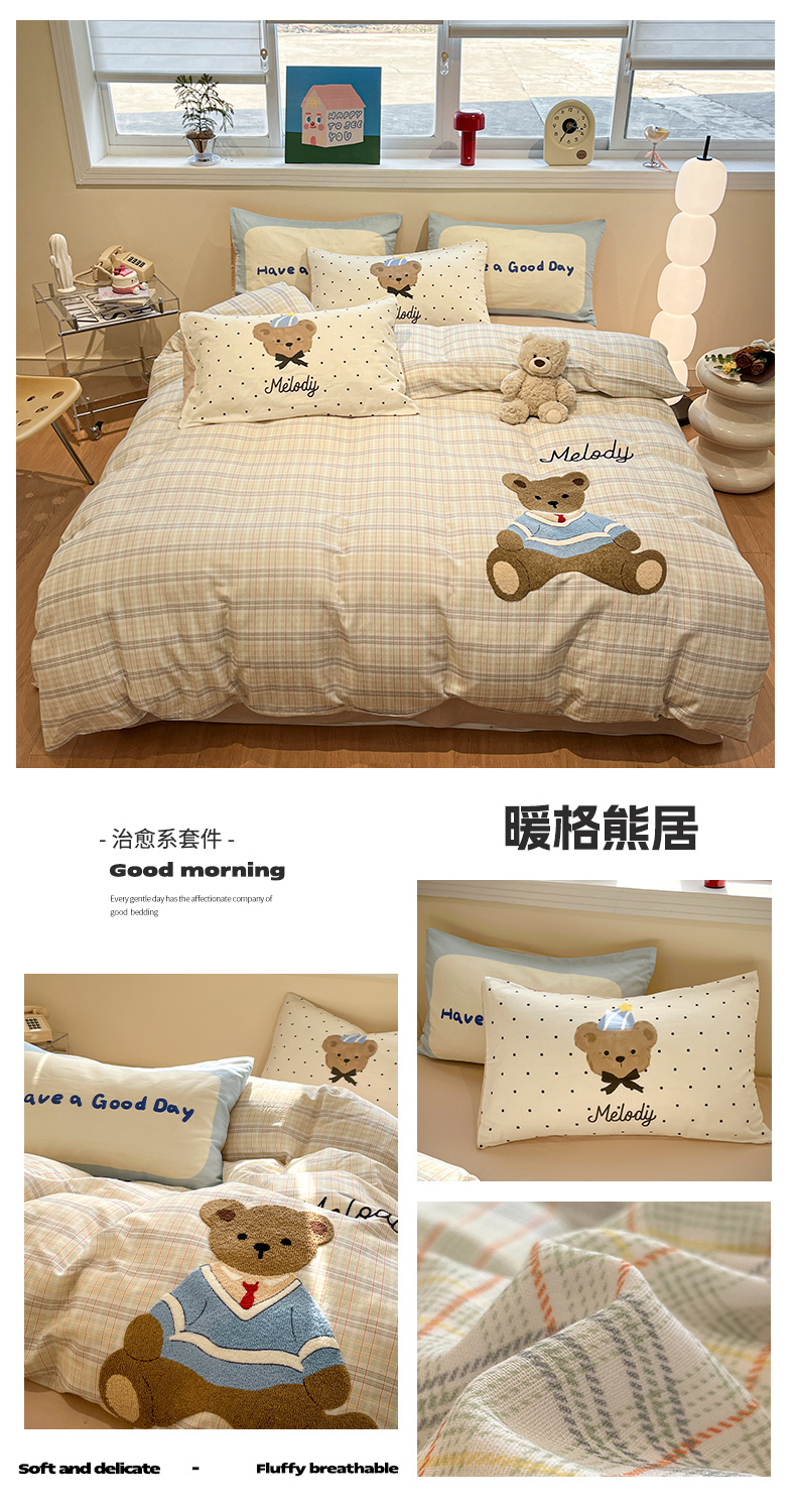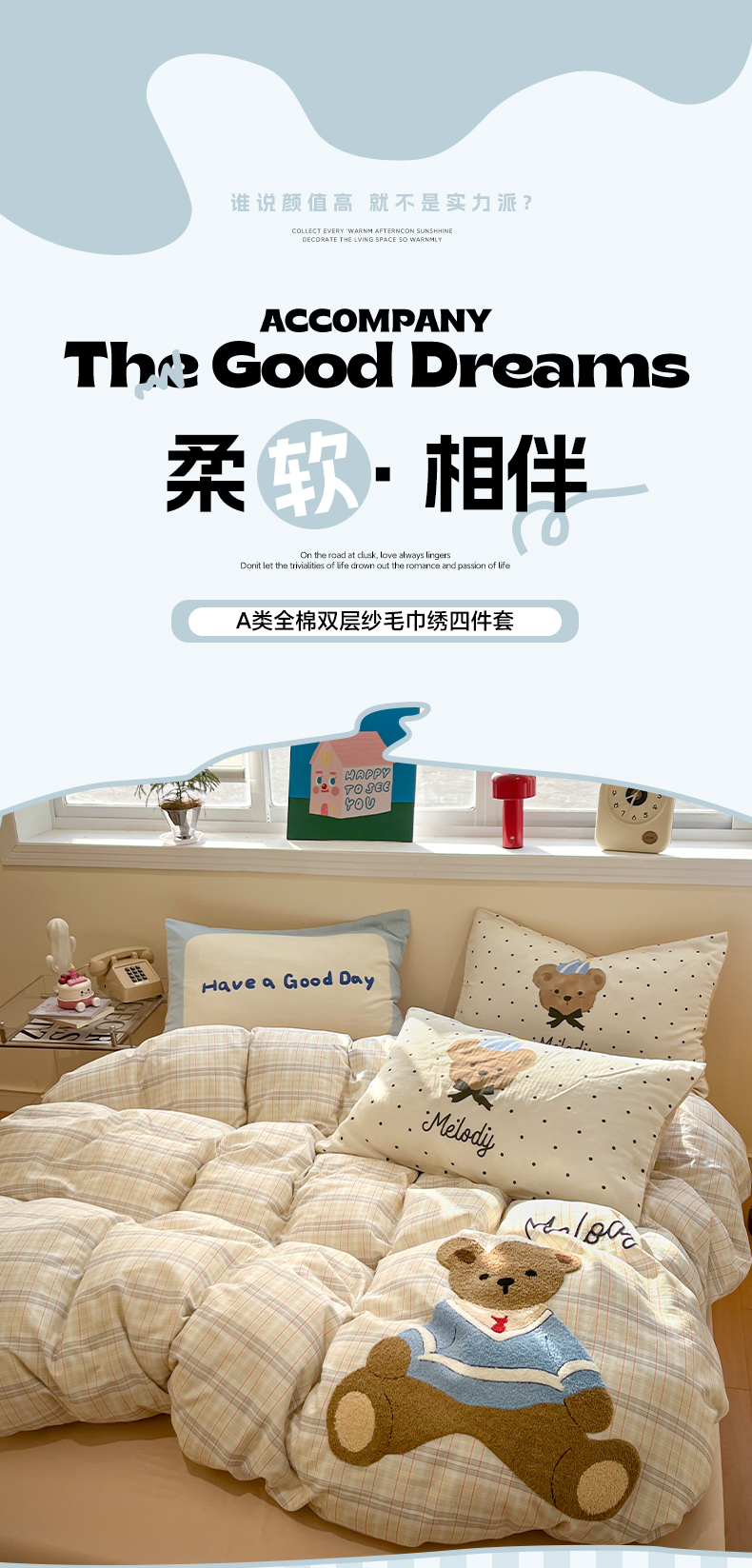 当前位置: 91家纺网 > 商品网购 > 床品套件 > 四件套 > 其它四件套 > 蓝邻家纺 2025年新款全棉双层纱毛巾绣四件套系列 暖格熊居