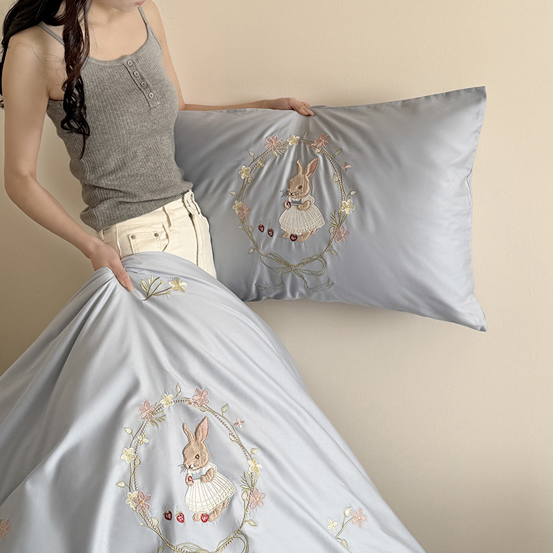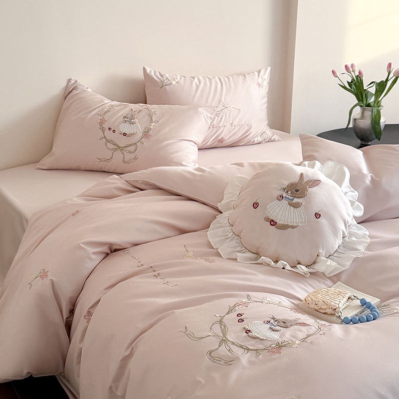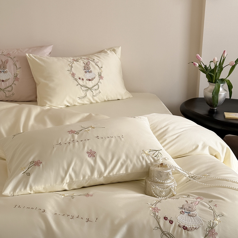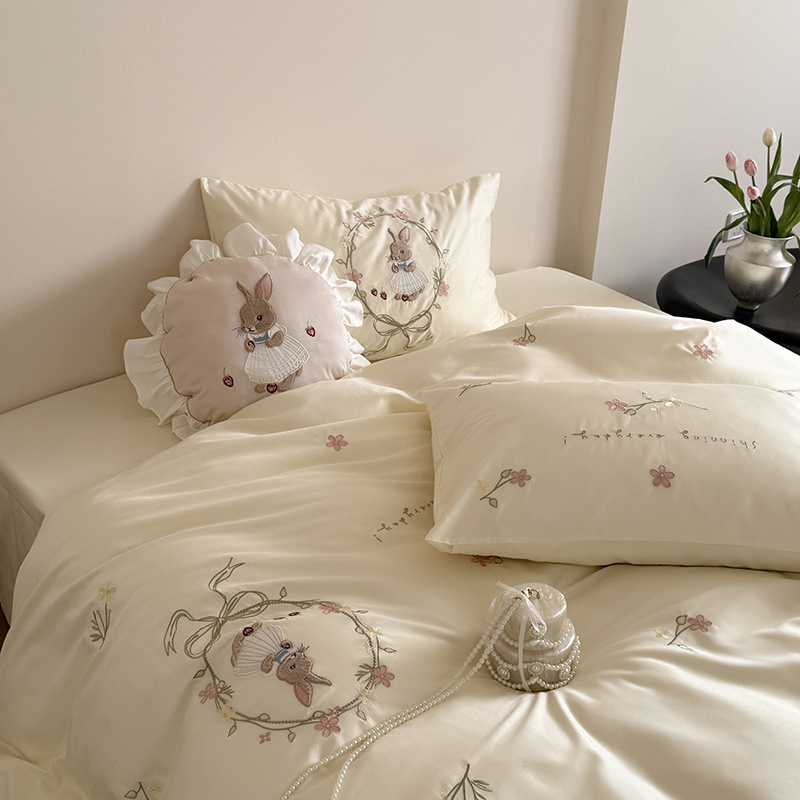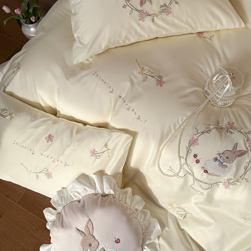 商品名称:鹿班家居 2025春夏款100S长绒棉刺绣四件套-萌兔花园场景一【标准会员-20】 萌兔花园-奶油色
