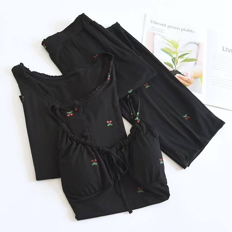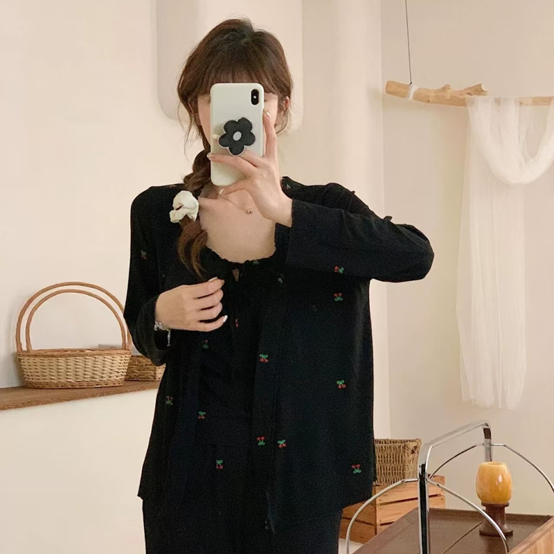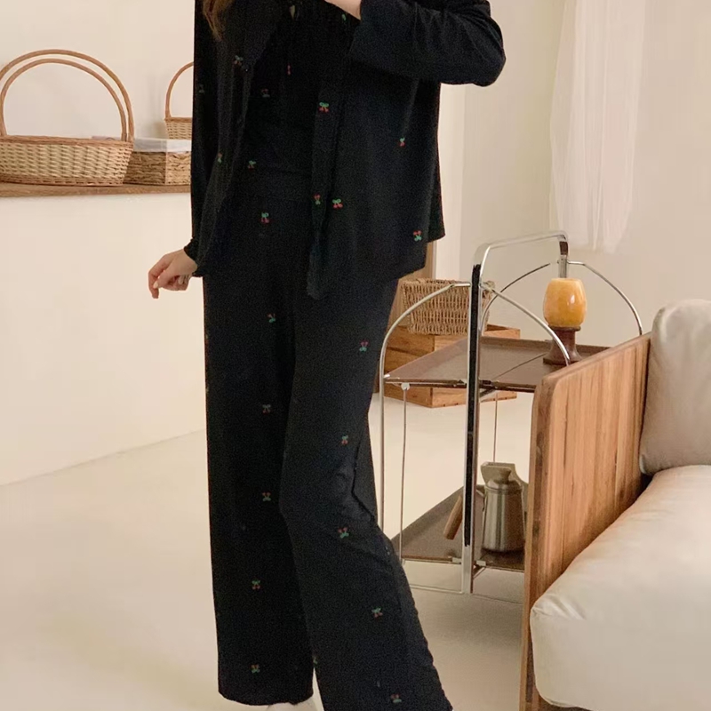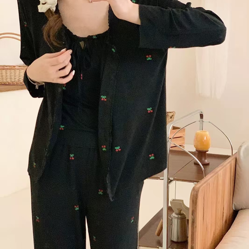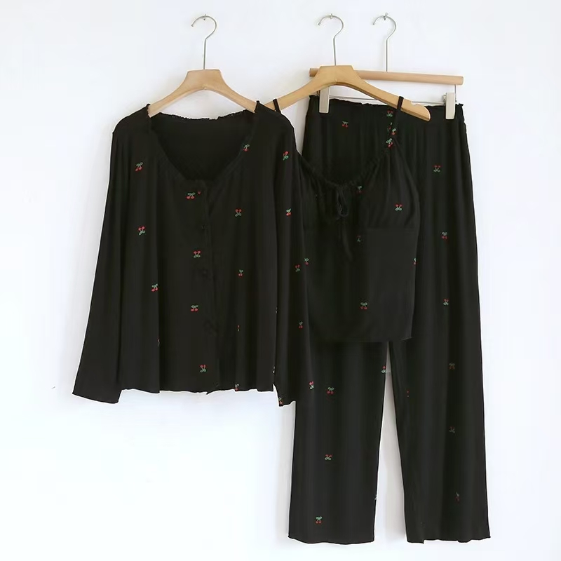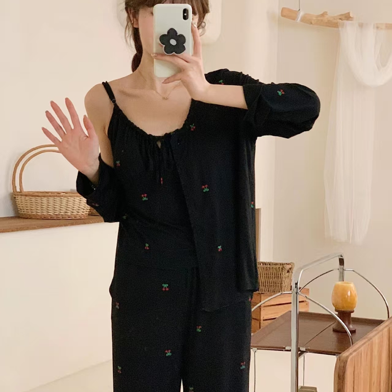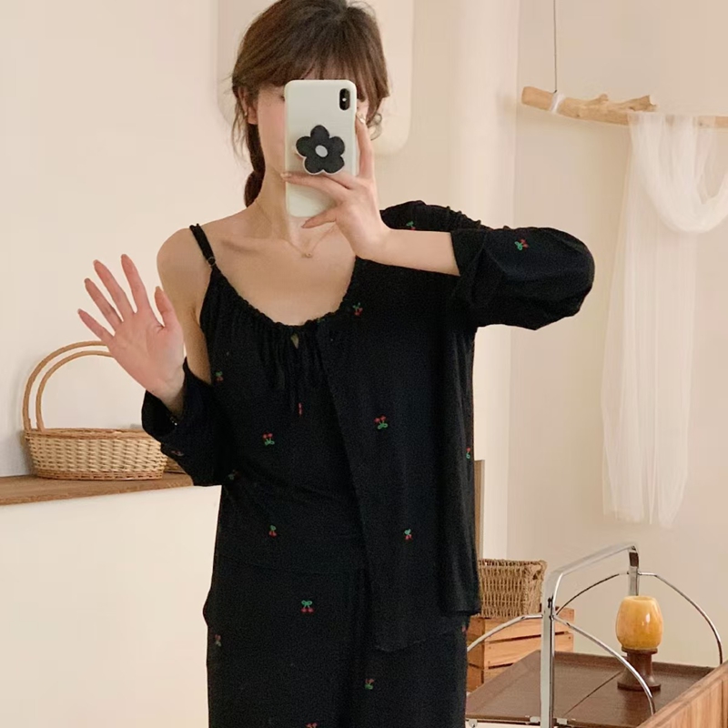 洛兰沙家居馆【只代发】【只代发】2025新款外贸欧美风淑女风莫代尔睡衣女春夏秋开衫短袖吊带三件套长裤家居服 三件套黑色