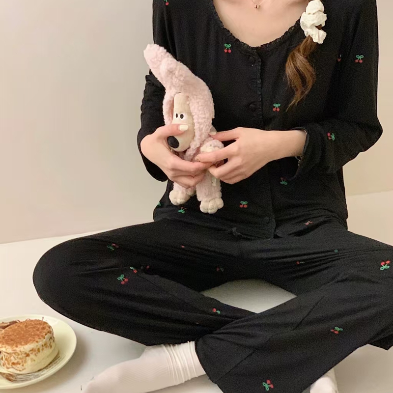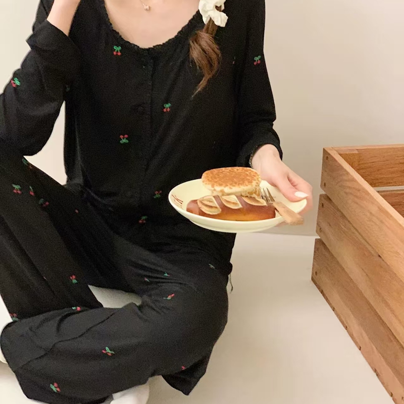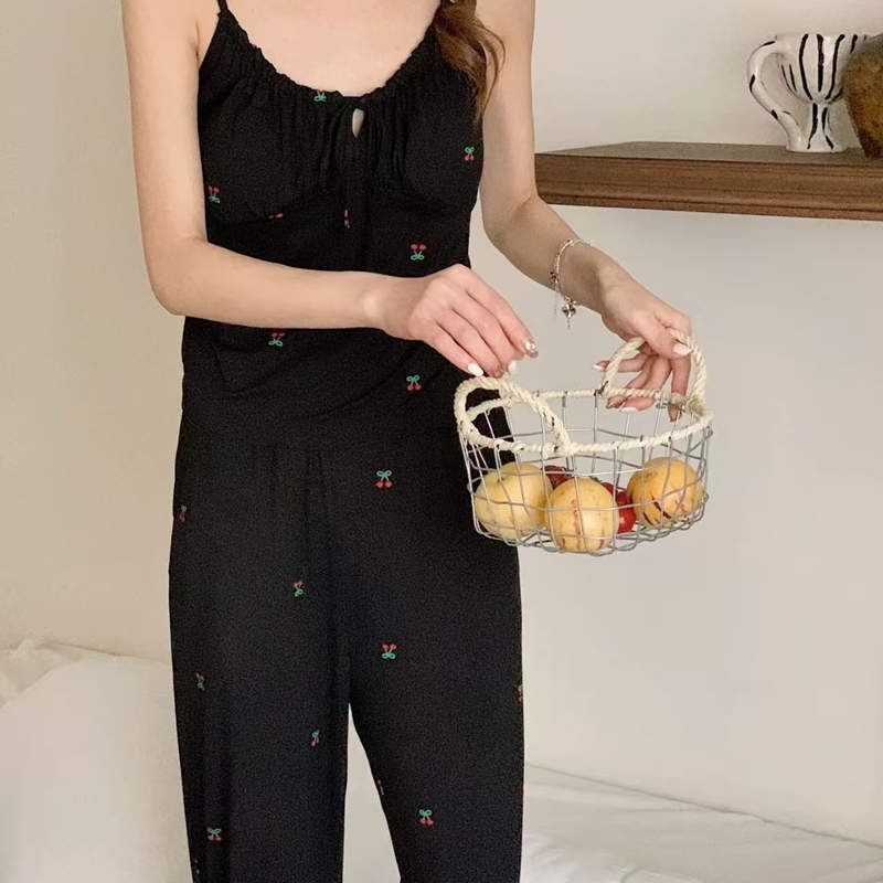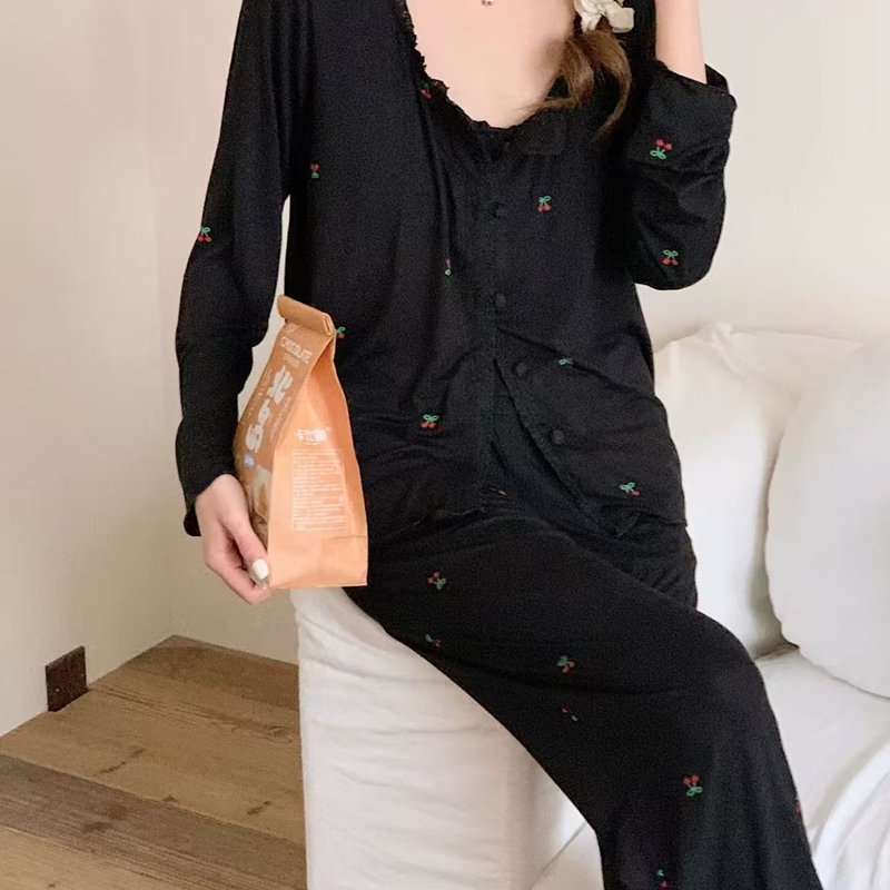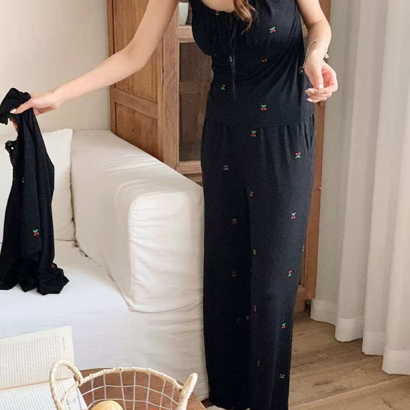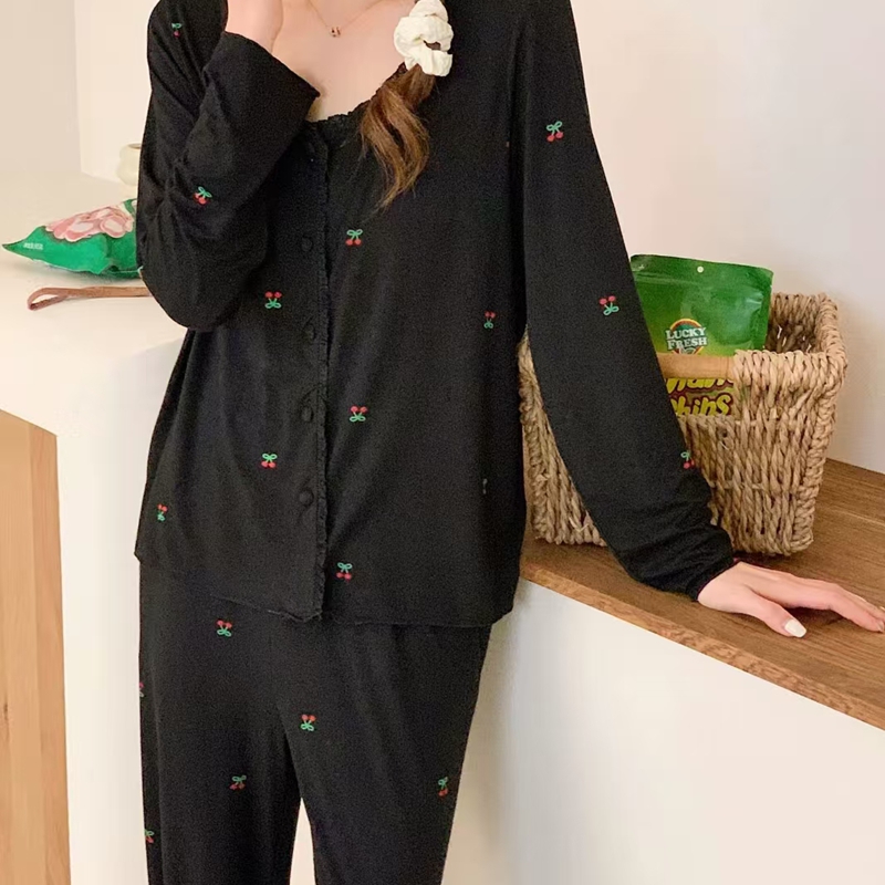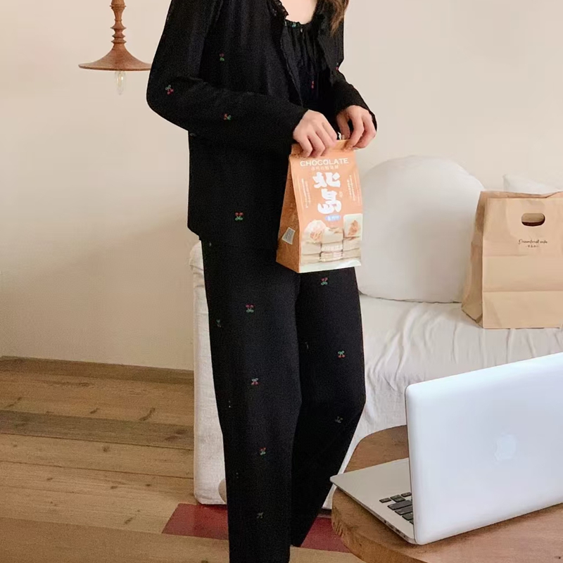 洛兰沙家居馆【只代发】【只代发】2025新款外贸欧美风淑女风莫代尔睡衣女春夏秋开衫短袖吊带三件套长裤家居服 三件套黑色
