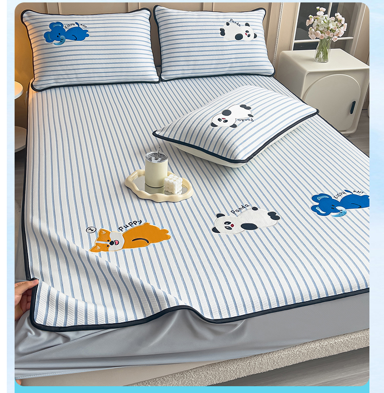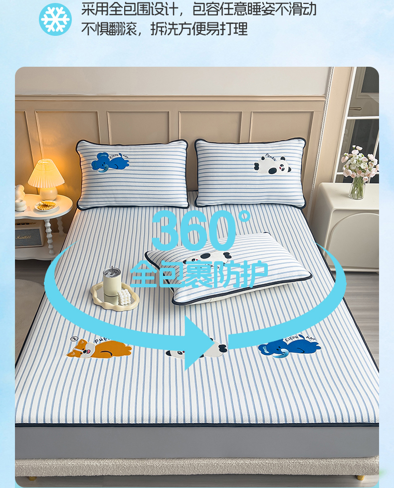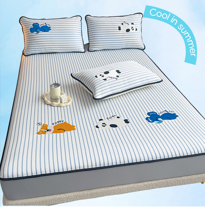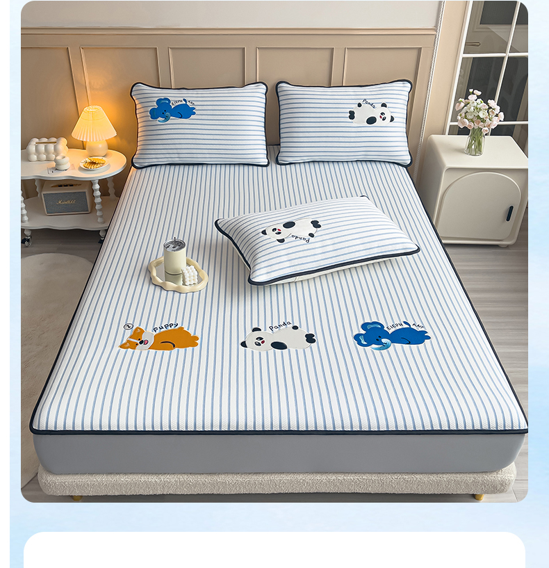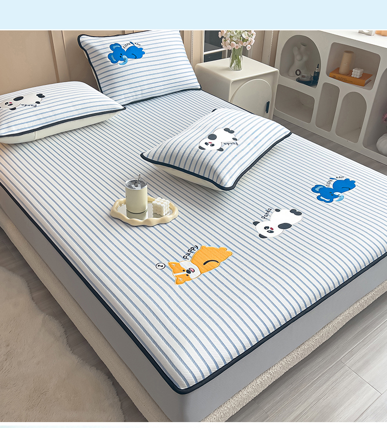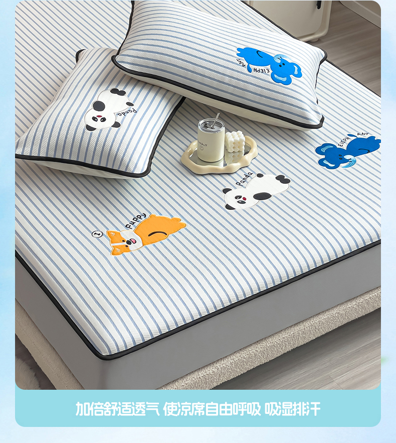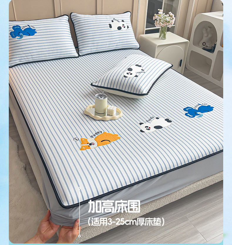 炫拼 2025新款A类凉豆豆提花条纹卡通刺绣床笠席三件套 趴趴睡
