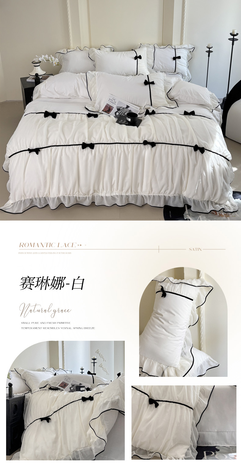 商品名称:梧桐家居 2025新款法式高定蝴蝶结赛琳娜雪纺花边四件套 赛琳娜-白