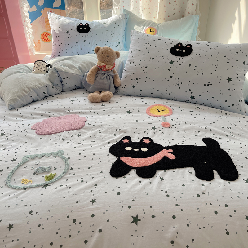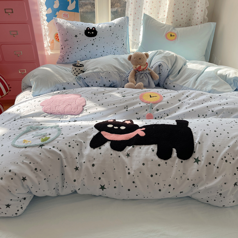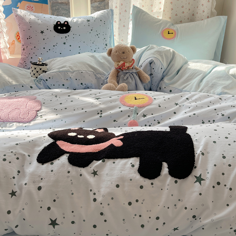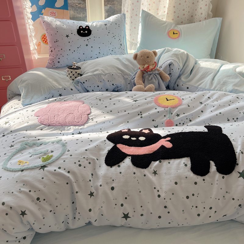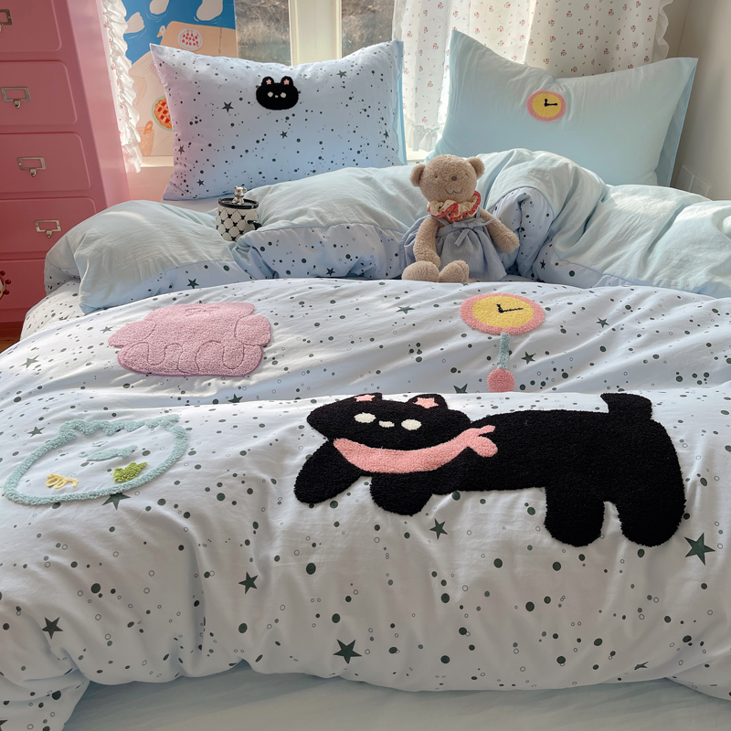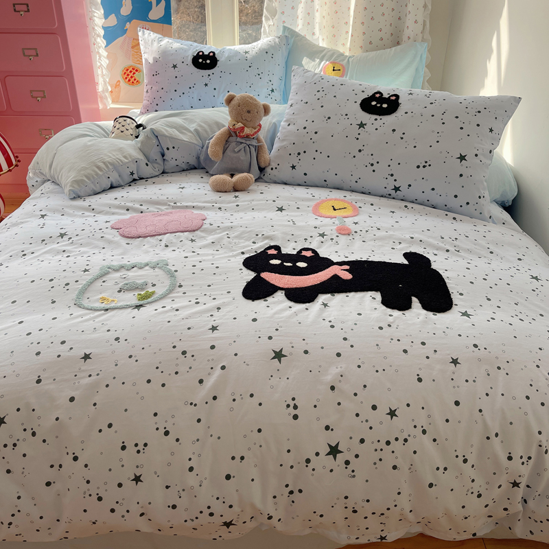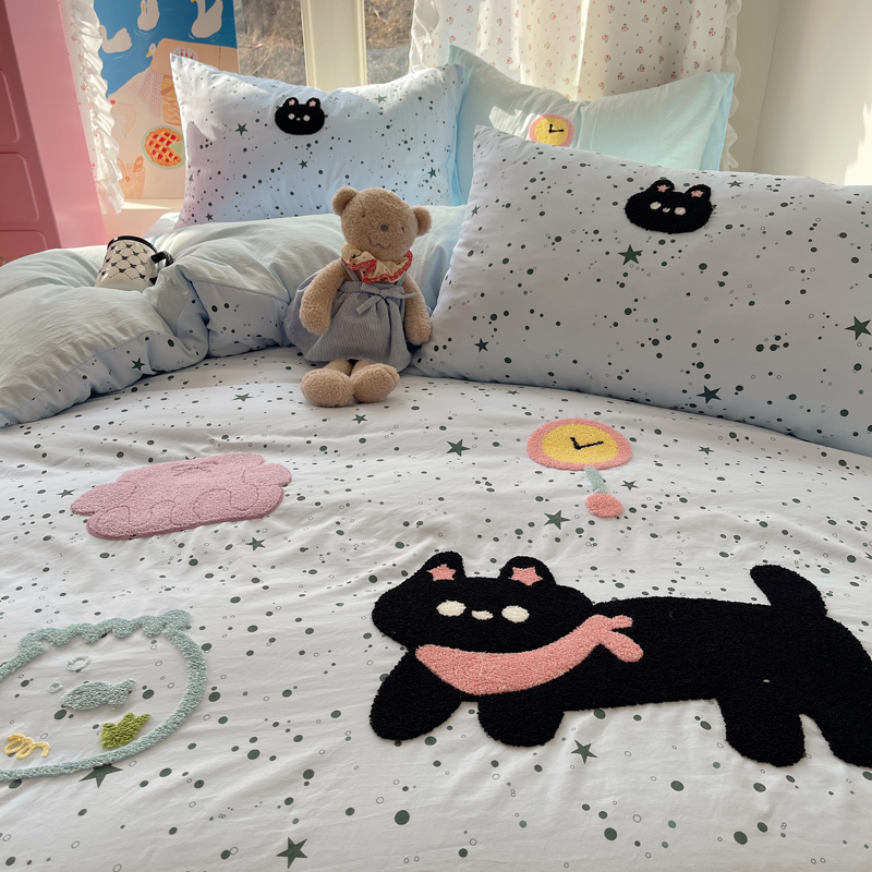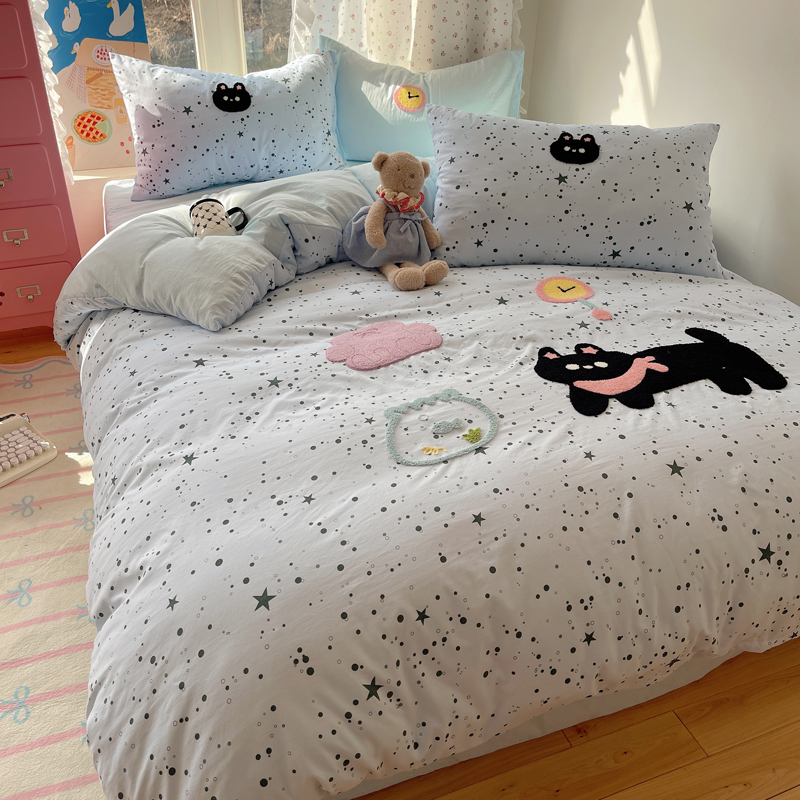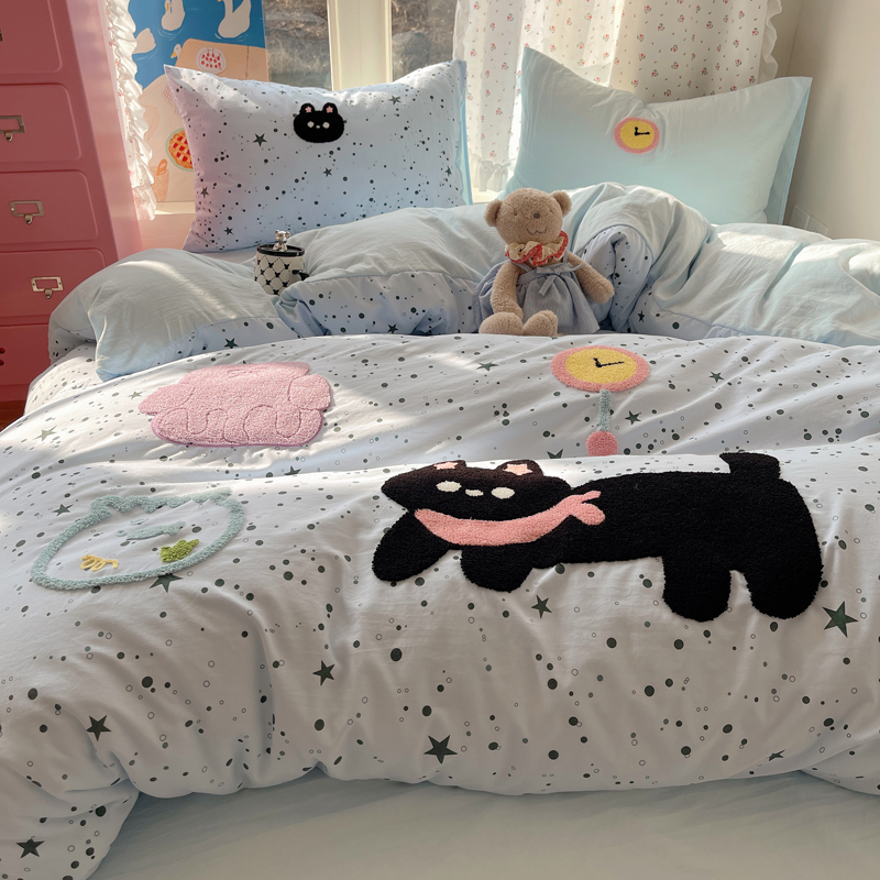 商品名称:顾里家纺 2025新款ins韩系童趣毛巾绣云朵棉四件套 泼墨黑猫