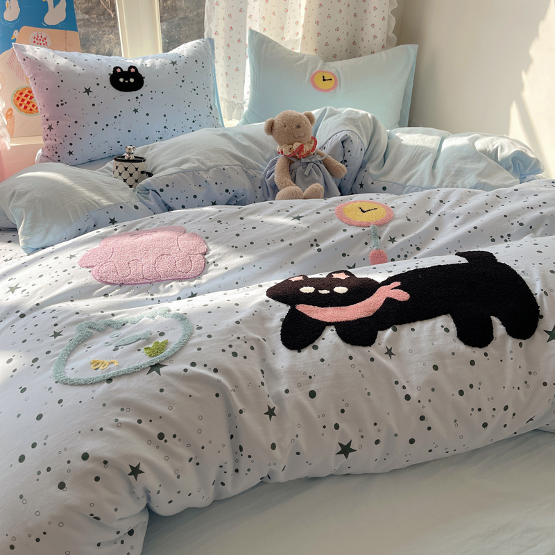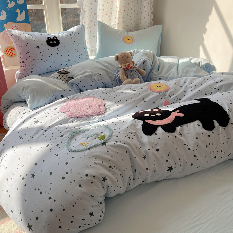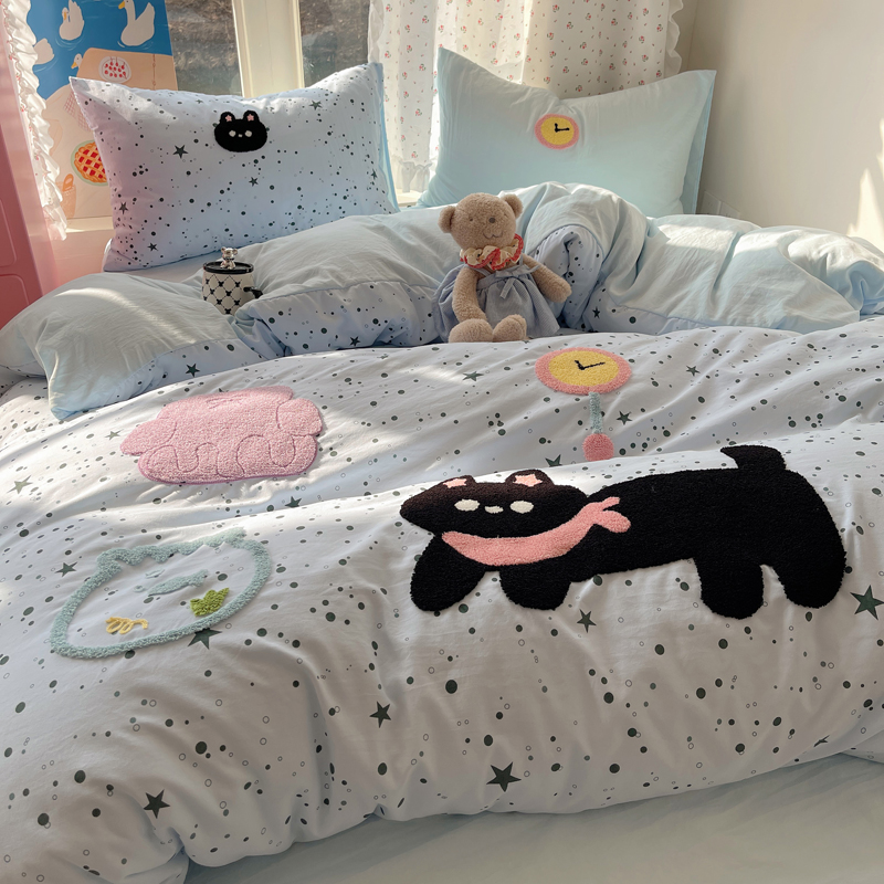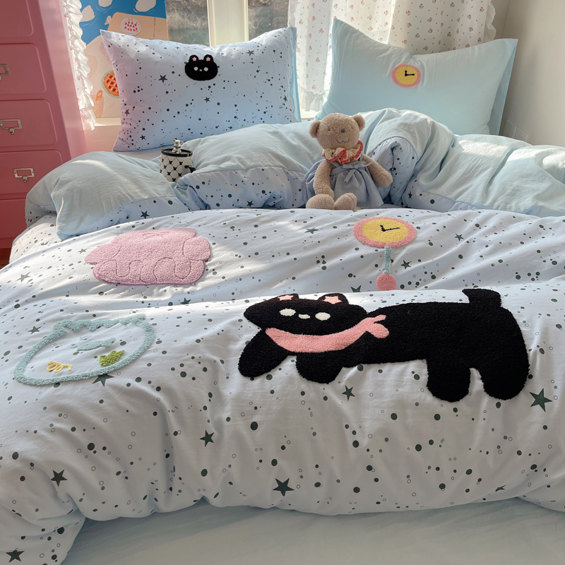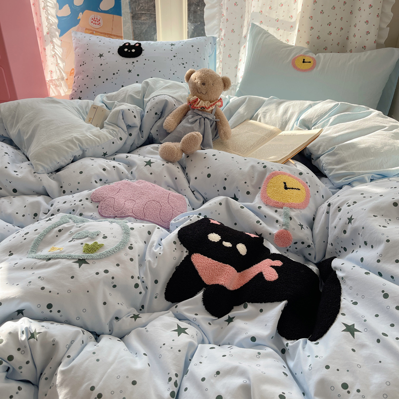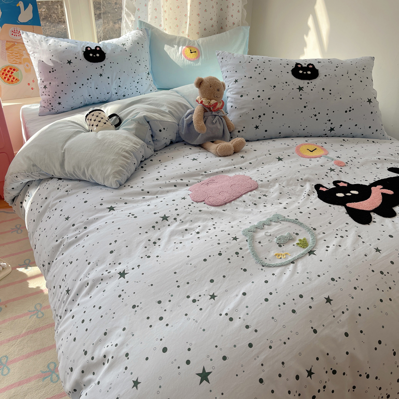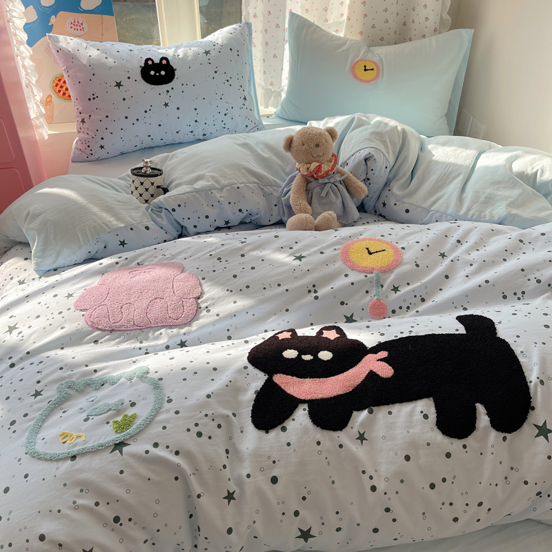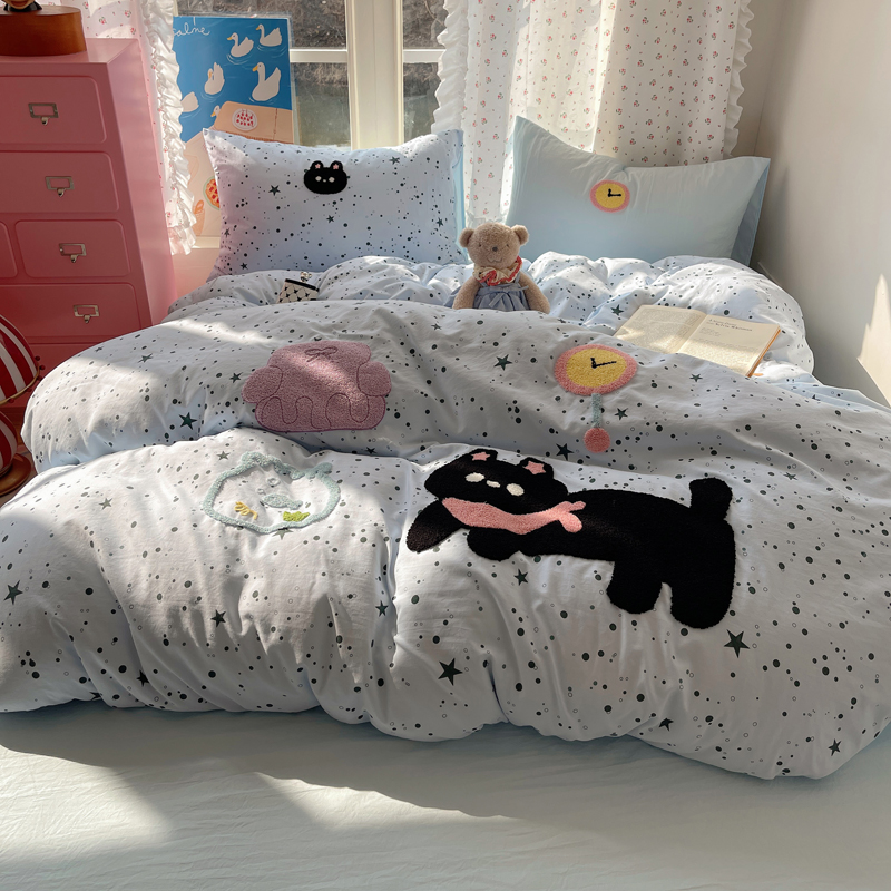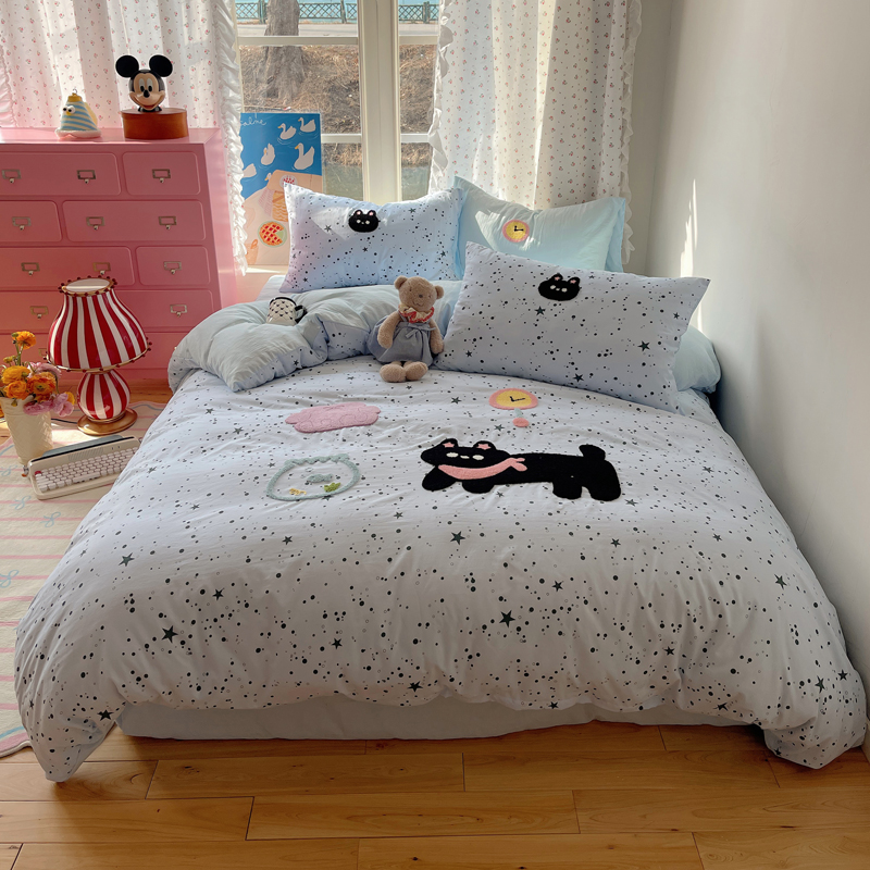 商品名称:顾里家纺 2025新款ins韩系童趣毛巾绣云朵棉四件套 泼墨黑猫