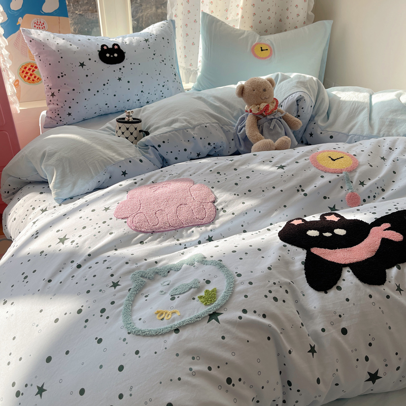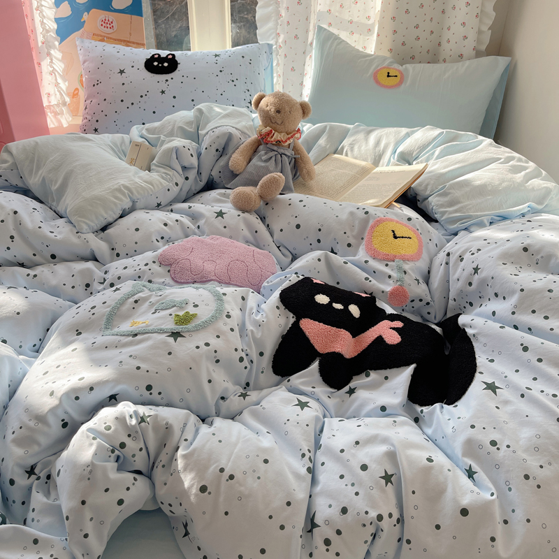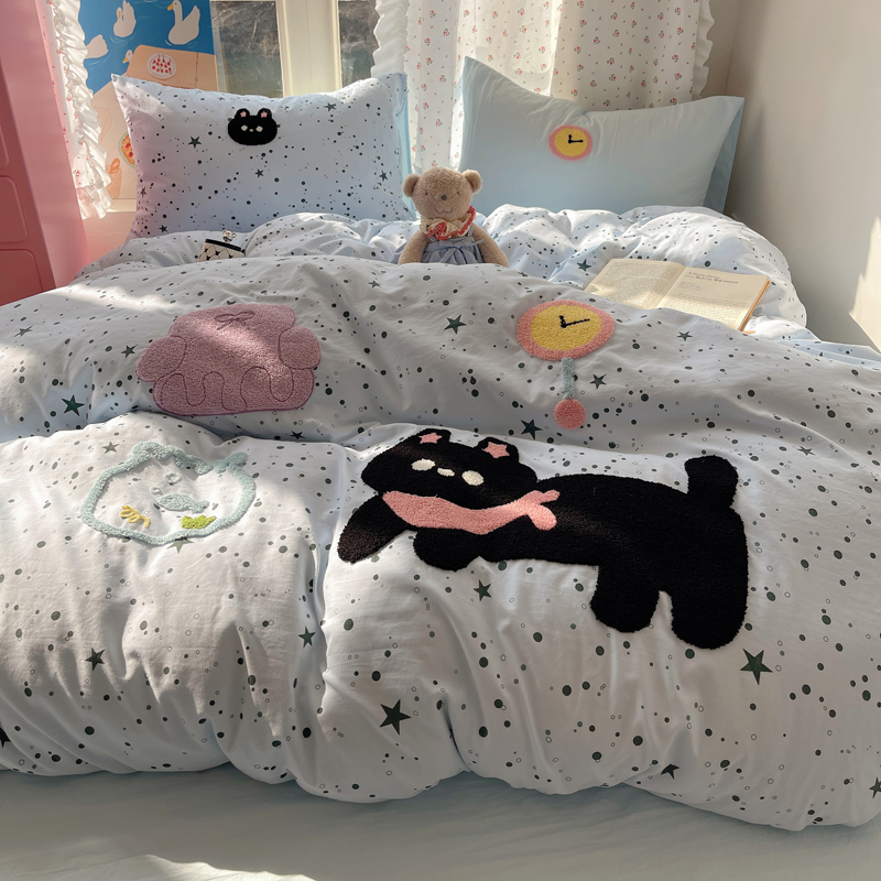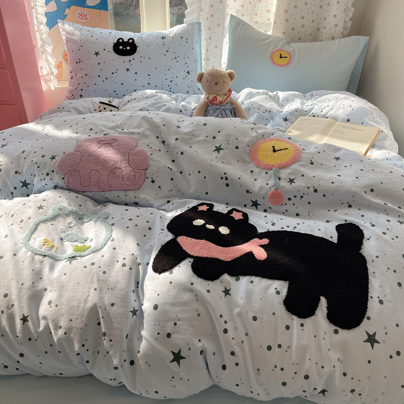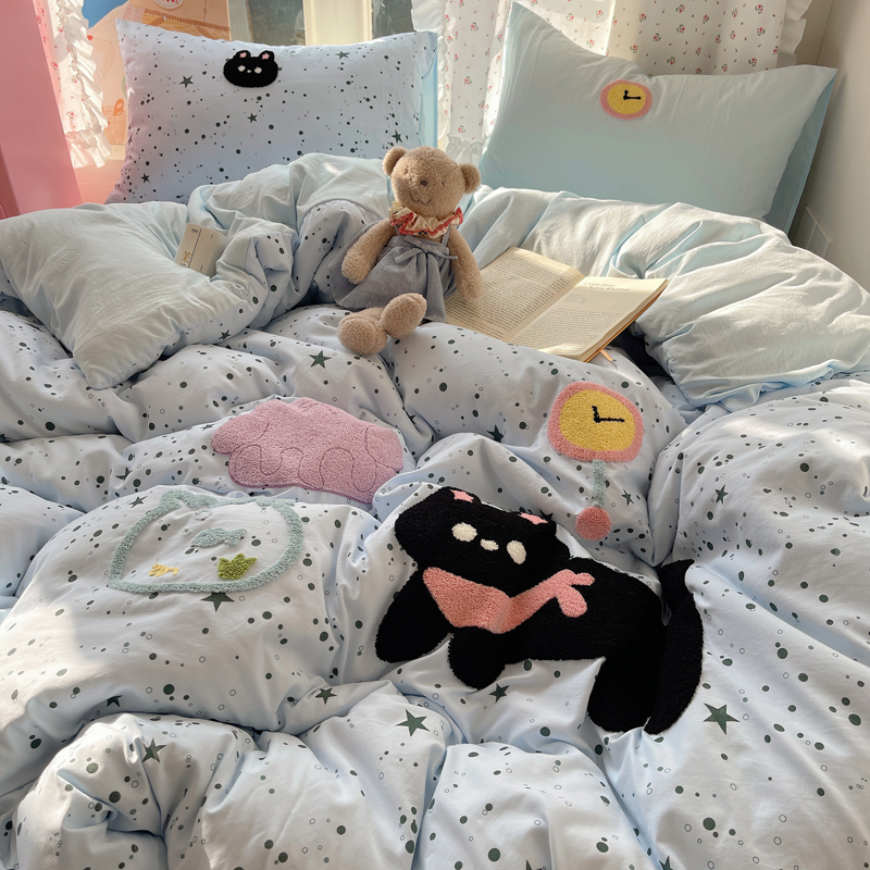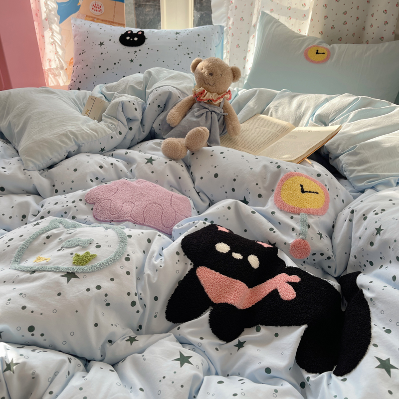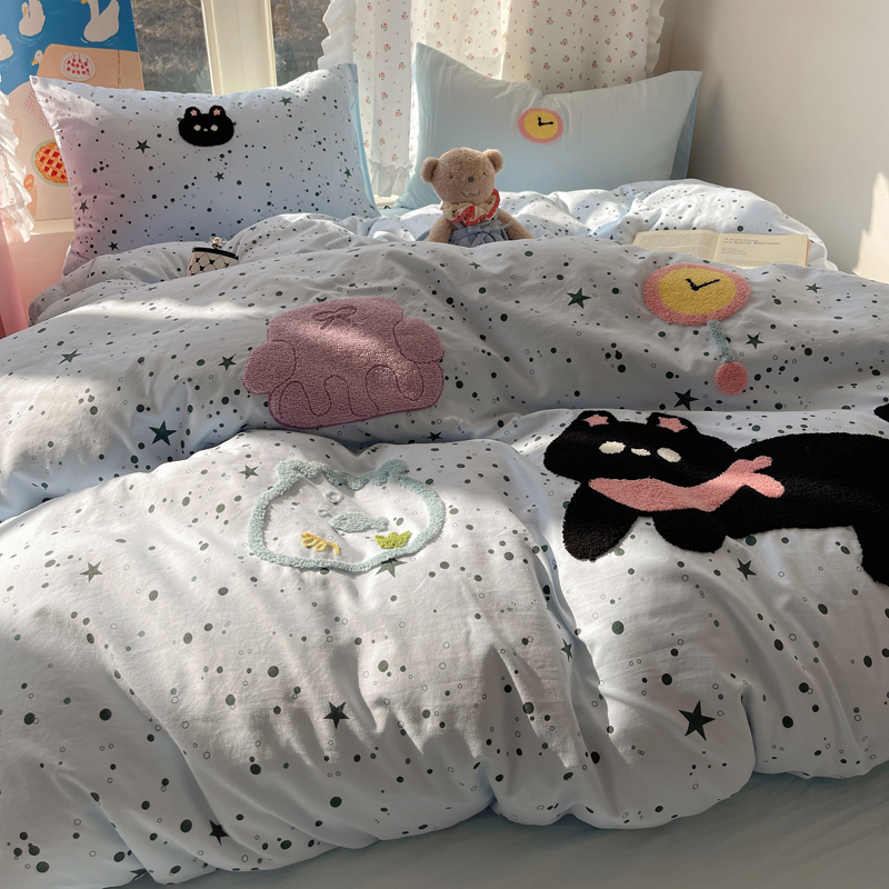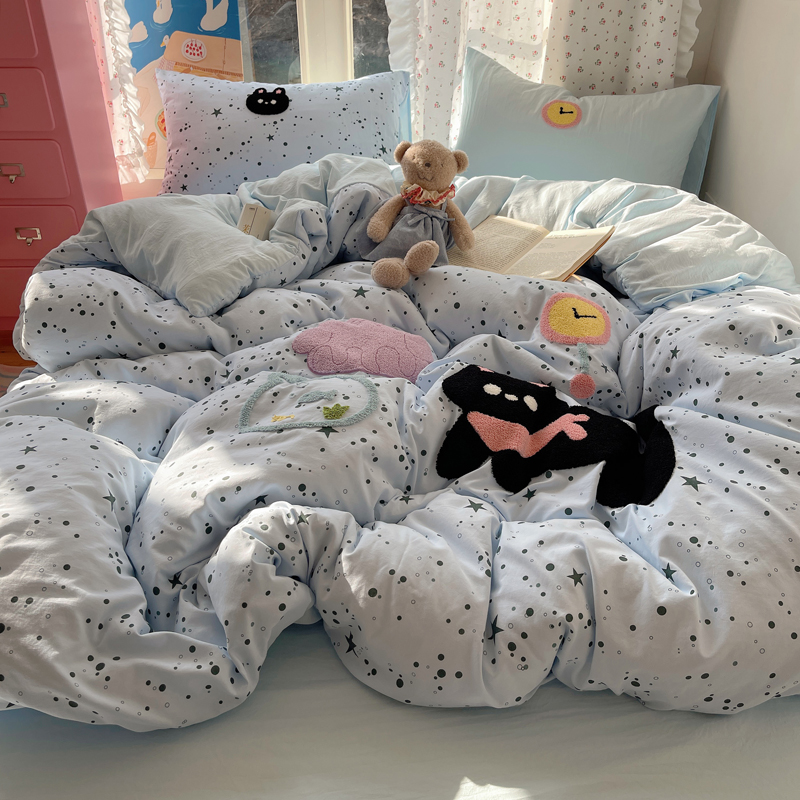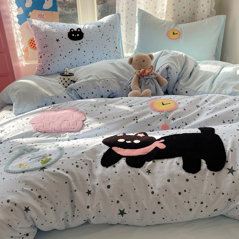 商品名称:顾里家纺 2025新款ins韩系童趣毛巾绣云朵棉四件套 泼墨黑猫