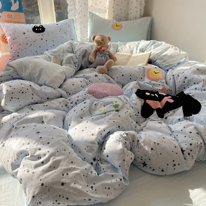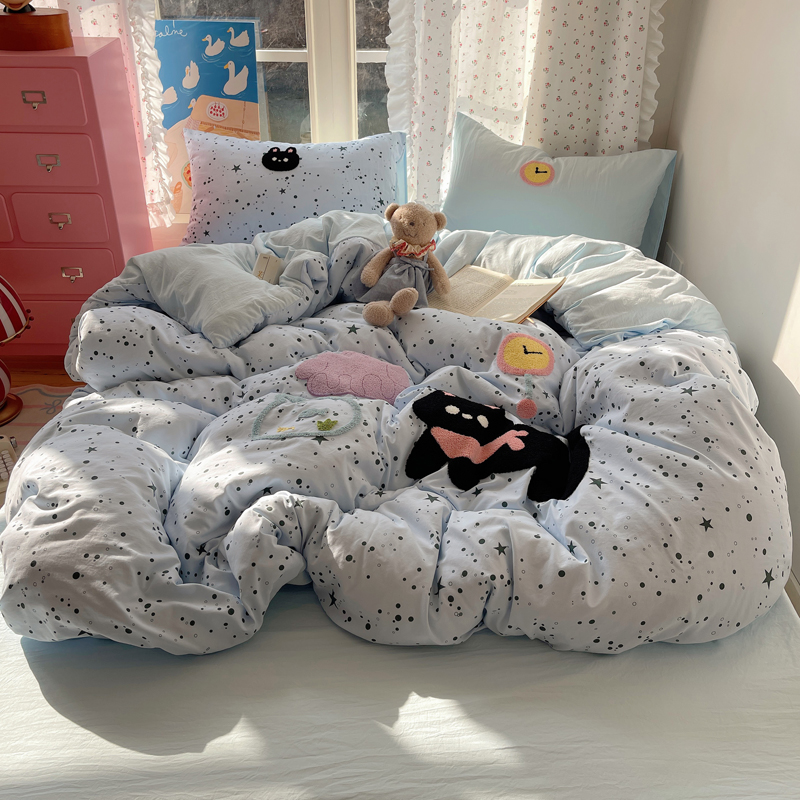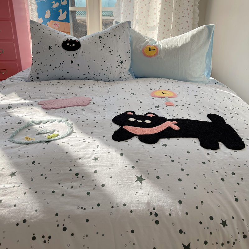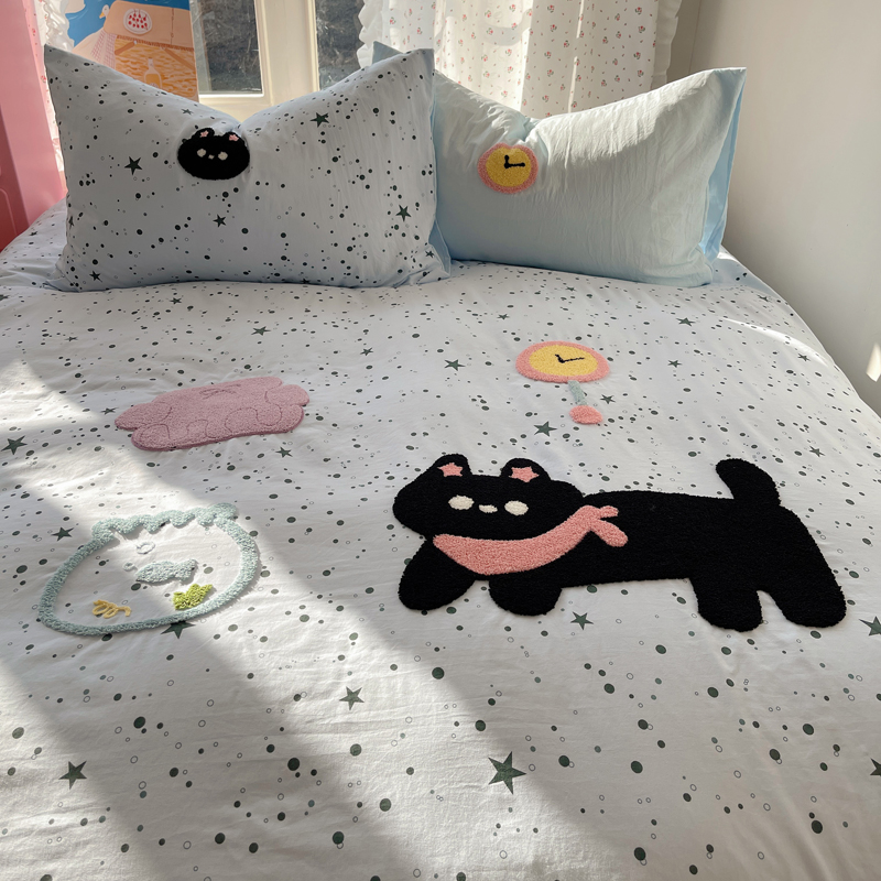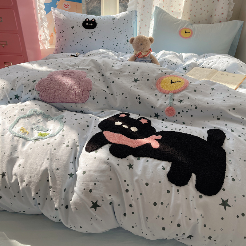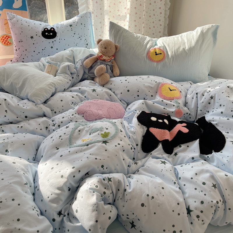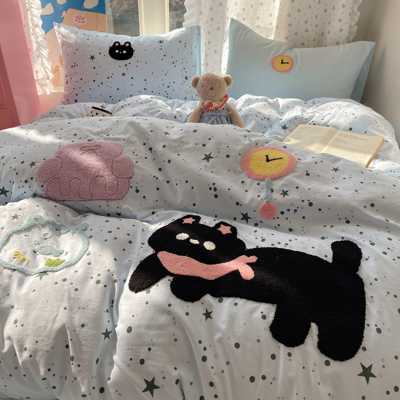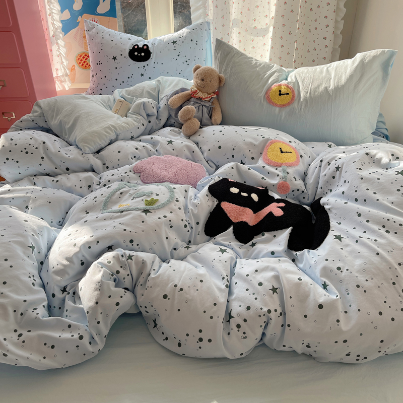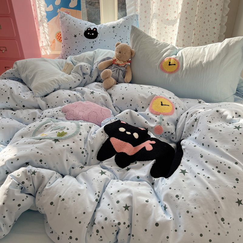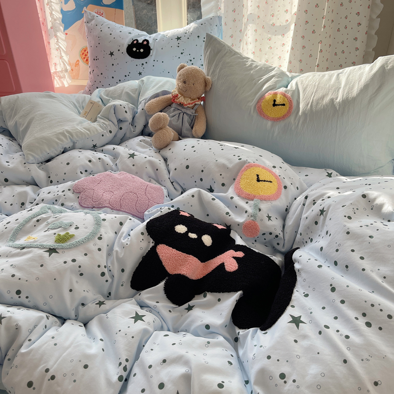 商品名称:顾里家纺 2025新款ins韩系童趣毛巾绣云朵棉四件套 泼墨黑猫