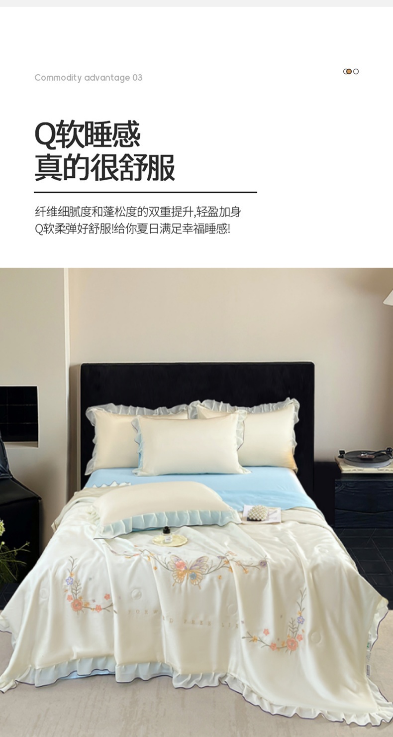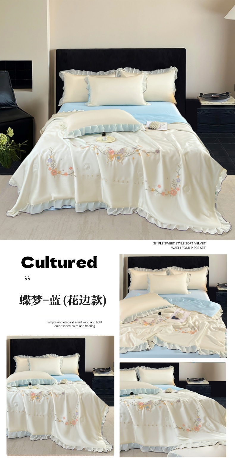 当前位置: 91家纺网 > 商品网购 > 床品套件 > 四件套 > 其它四件套 > 梦舒羽 2025新款刺绣水洗真丝花边夏被四件套宿舍夏凉被床单枕套三件套-蝶梦花边款 蝶梦-蓝 花边款