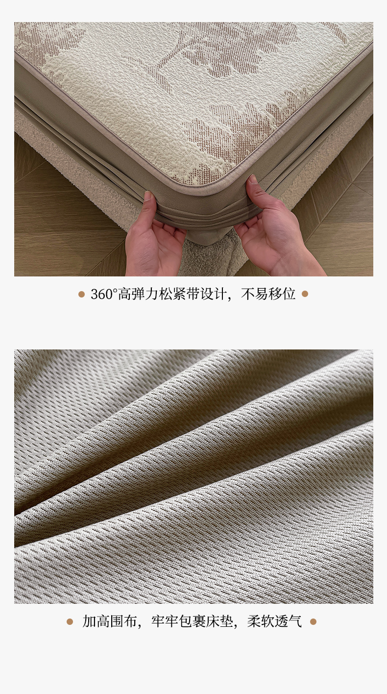 当前位置: 91家纺网 > 商品网购 > 床上用品 > 凉席 > 全季家居 2025新款A类乙纶PE花卉轻奢提花系列凉豆豆席 床笠款-迷雾森林-浅咖