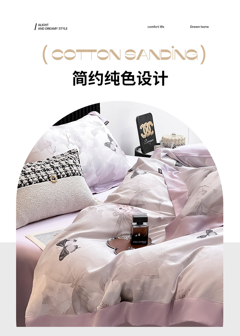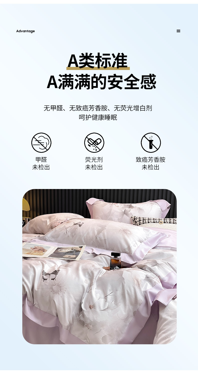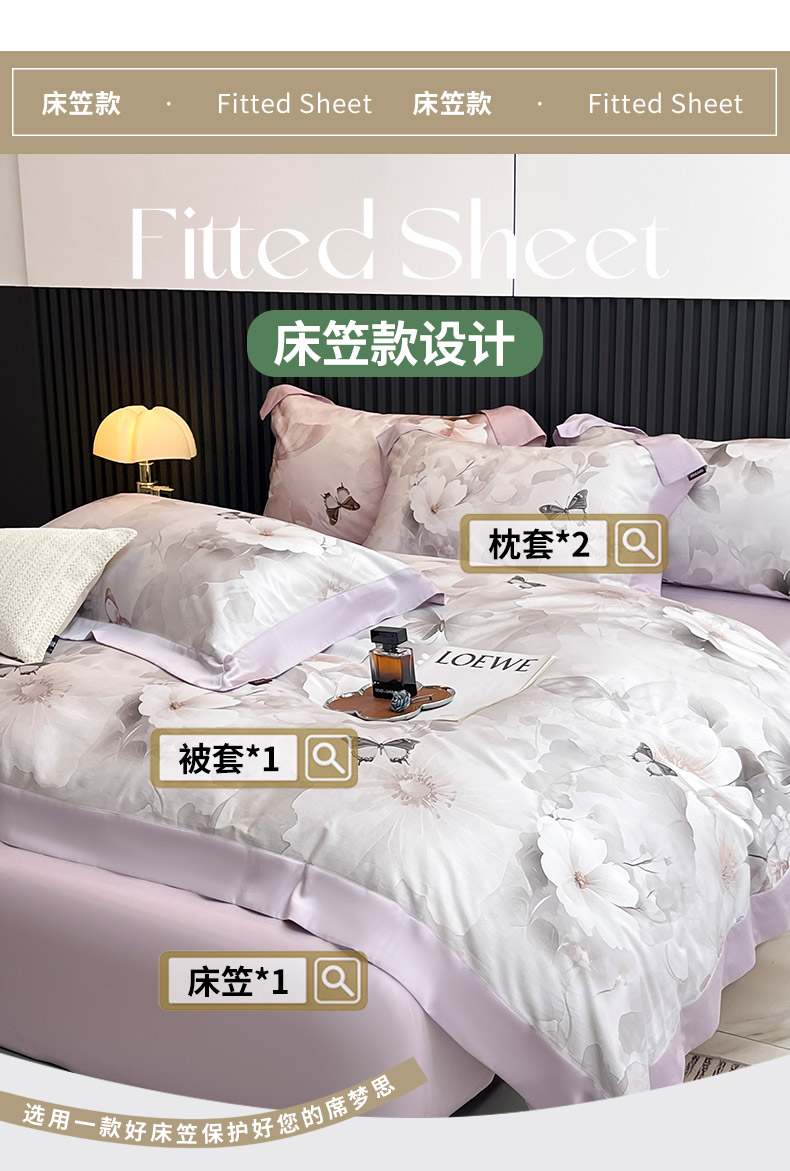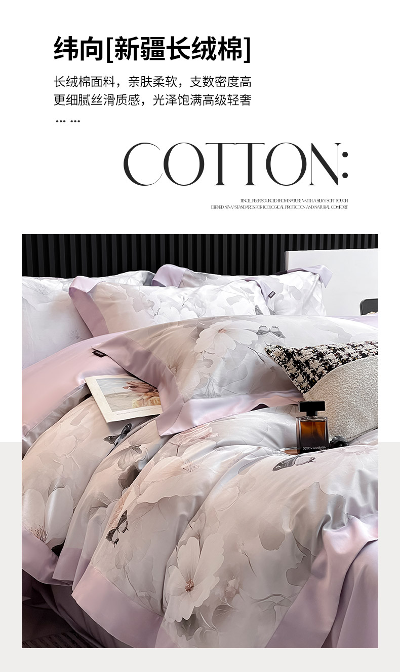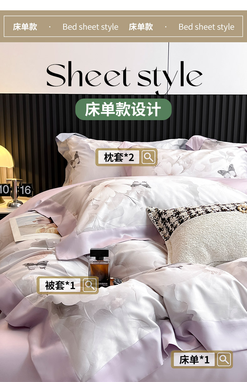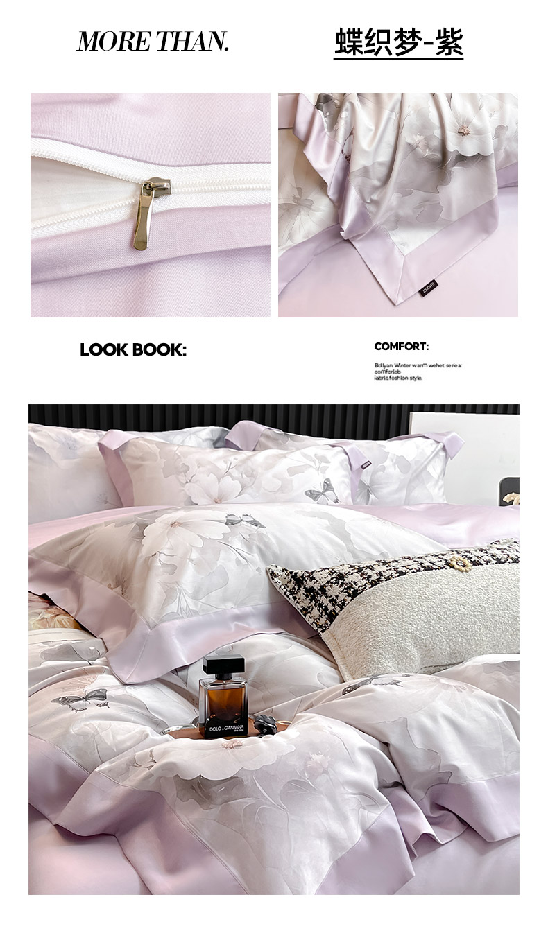 商品名称:2025夏季A类母婴级天丝棉印花四件套纯棉全棉高端数码印花丝滑裸睡长绒棉被套真丝床上用品 蝶织梦-紫