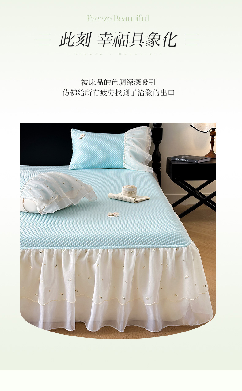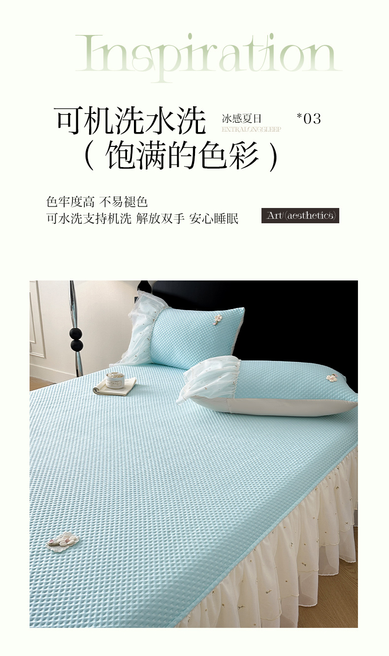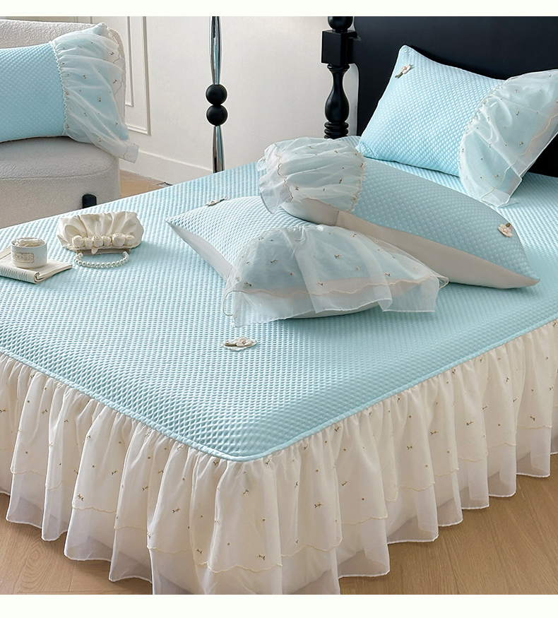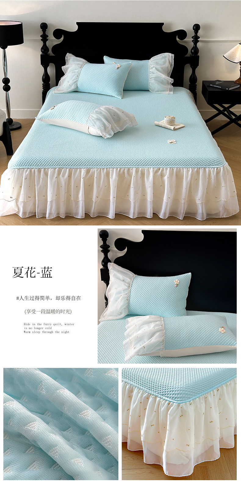 商品名称:蓝邻家纺 2025春夏新款PE提花雪纺+绣花花边凉席席子-场景二 夏花-蓝