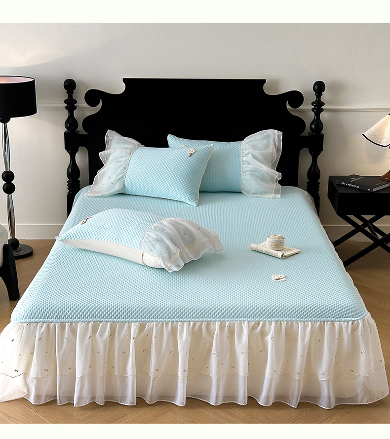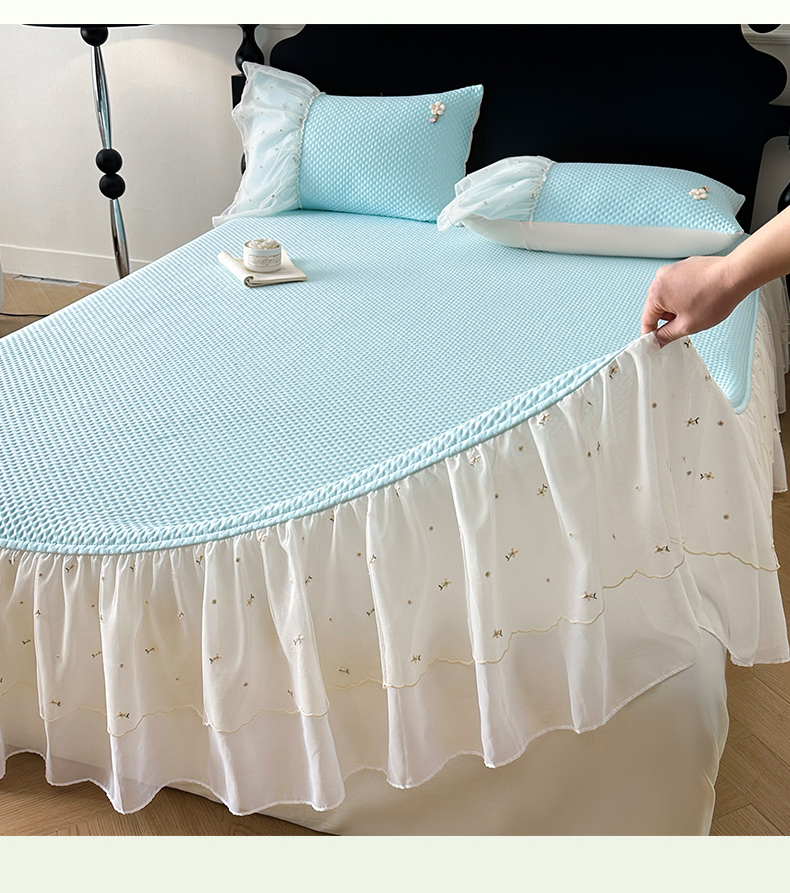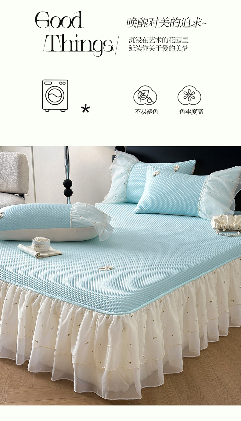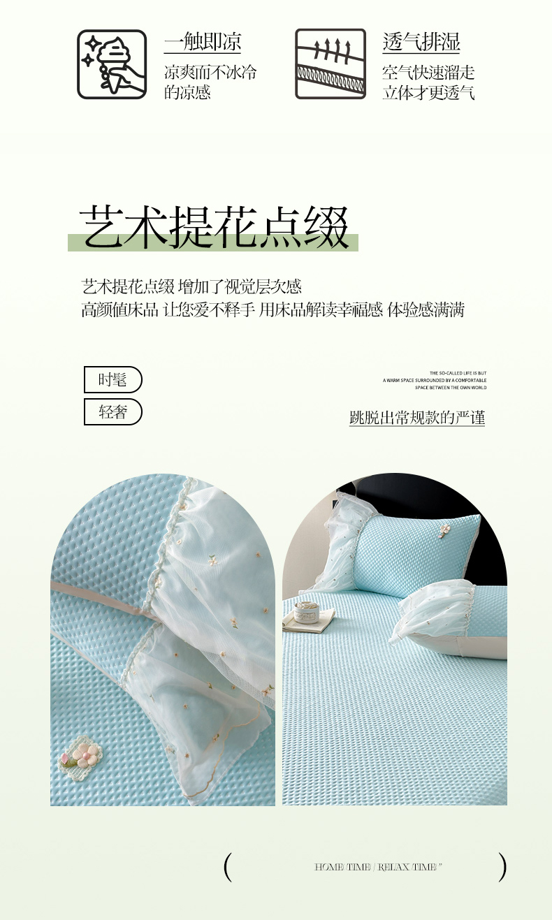 商品名称:蓝邻家纺 2025春夏新款PE提花雪纺+绣花花边凉席席子-场景二 夏花-蓝