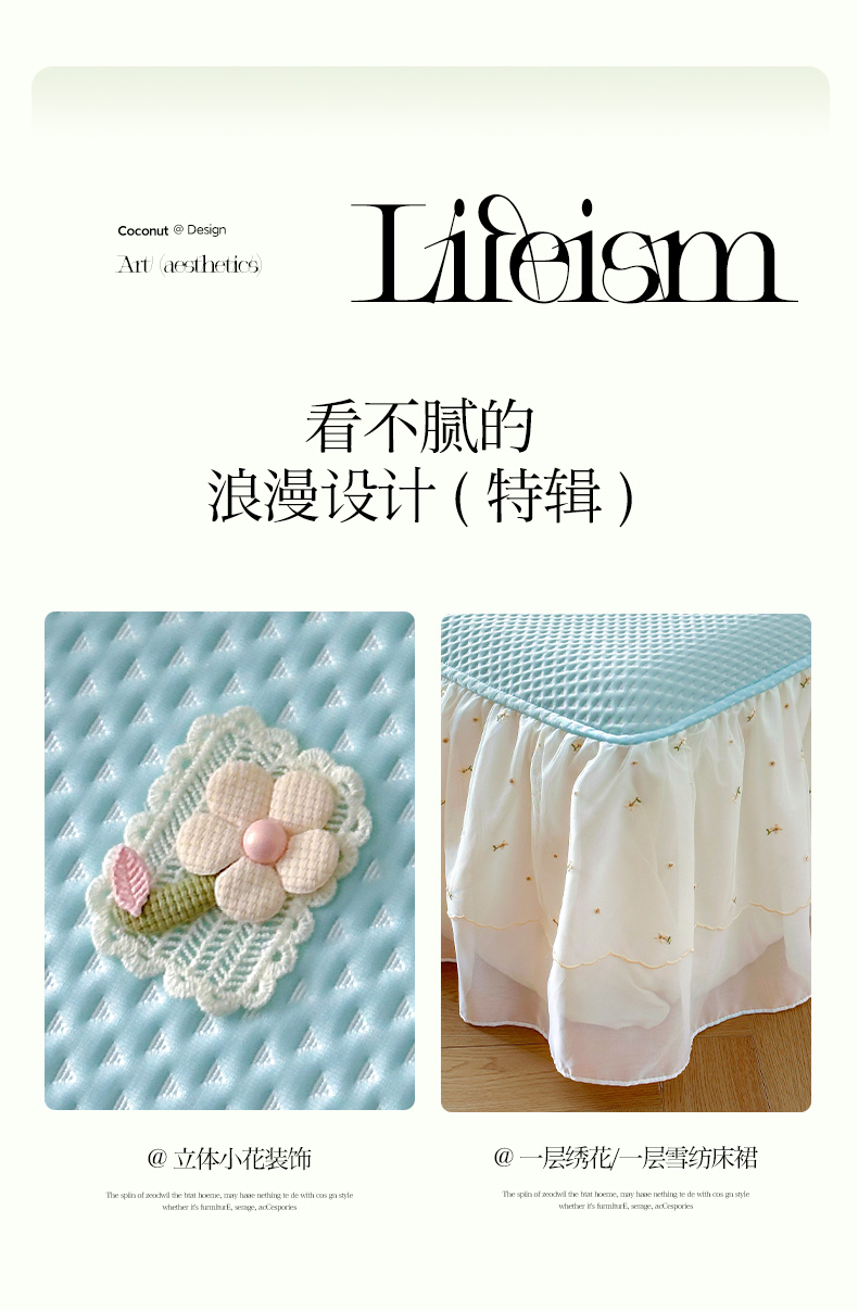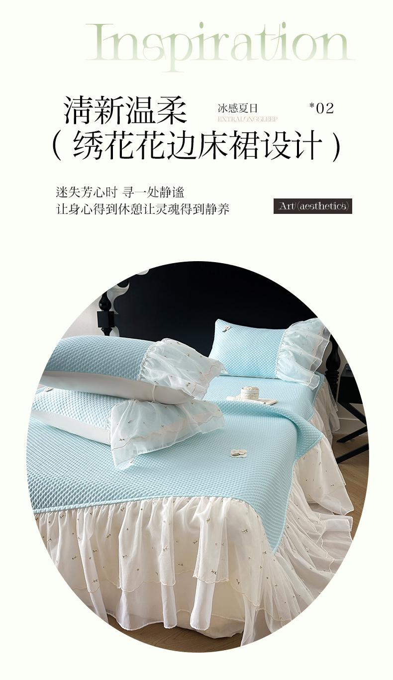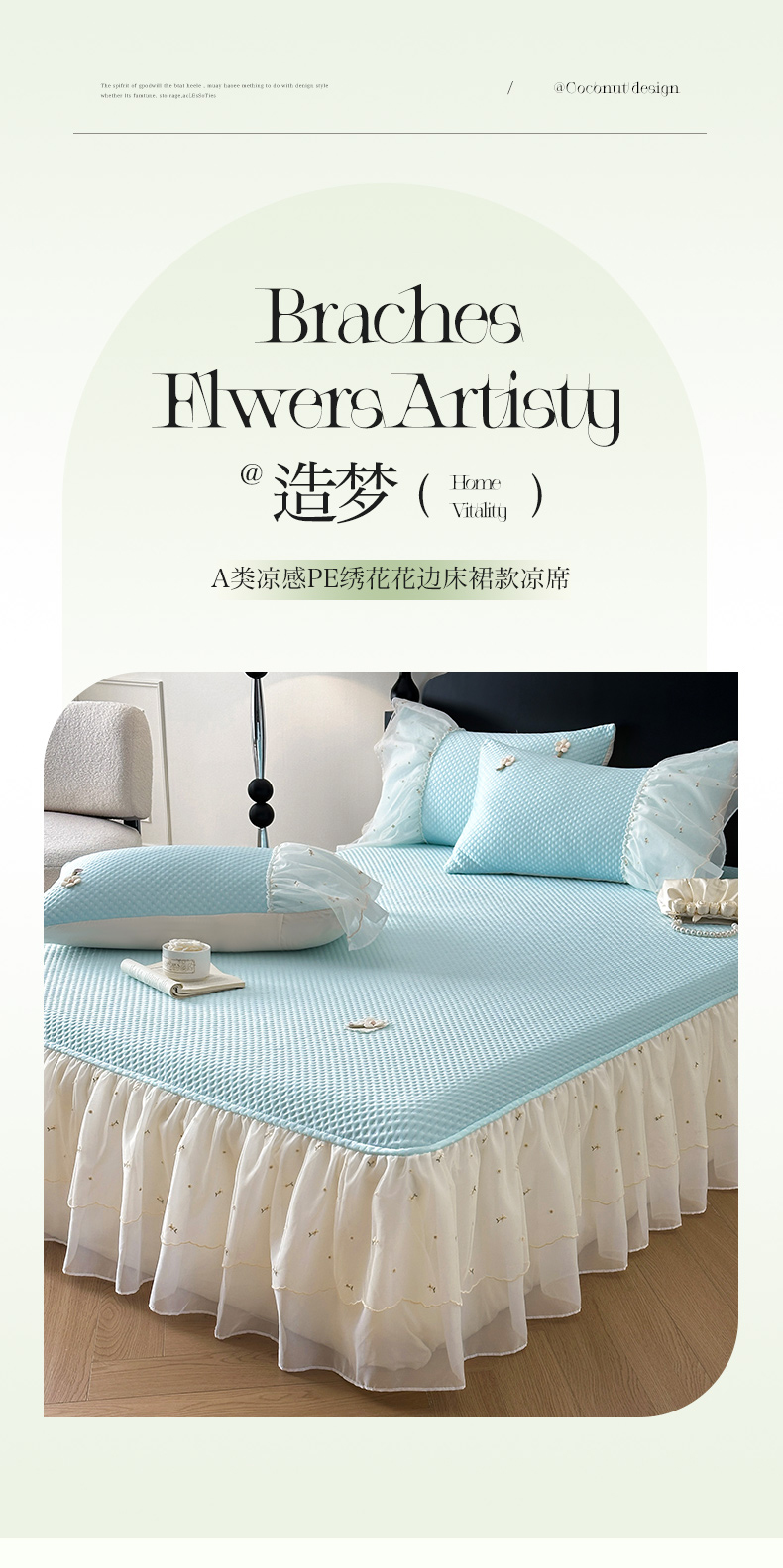蓝邻家纺 2025春夏新款PE提花雪纺+绣花花边凉席席子-场景二 夏花-蓝