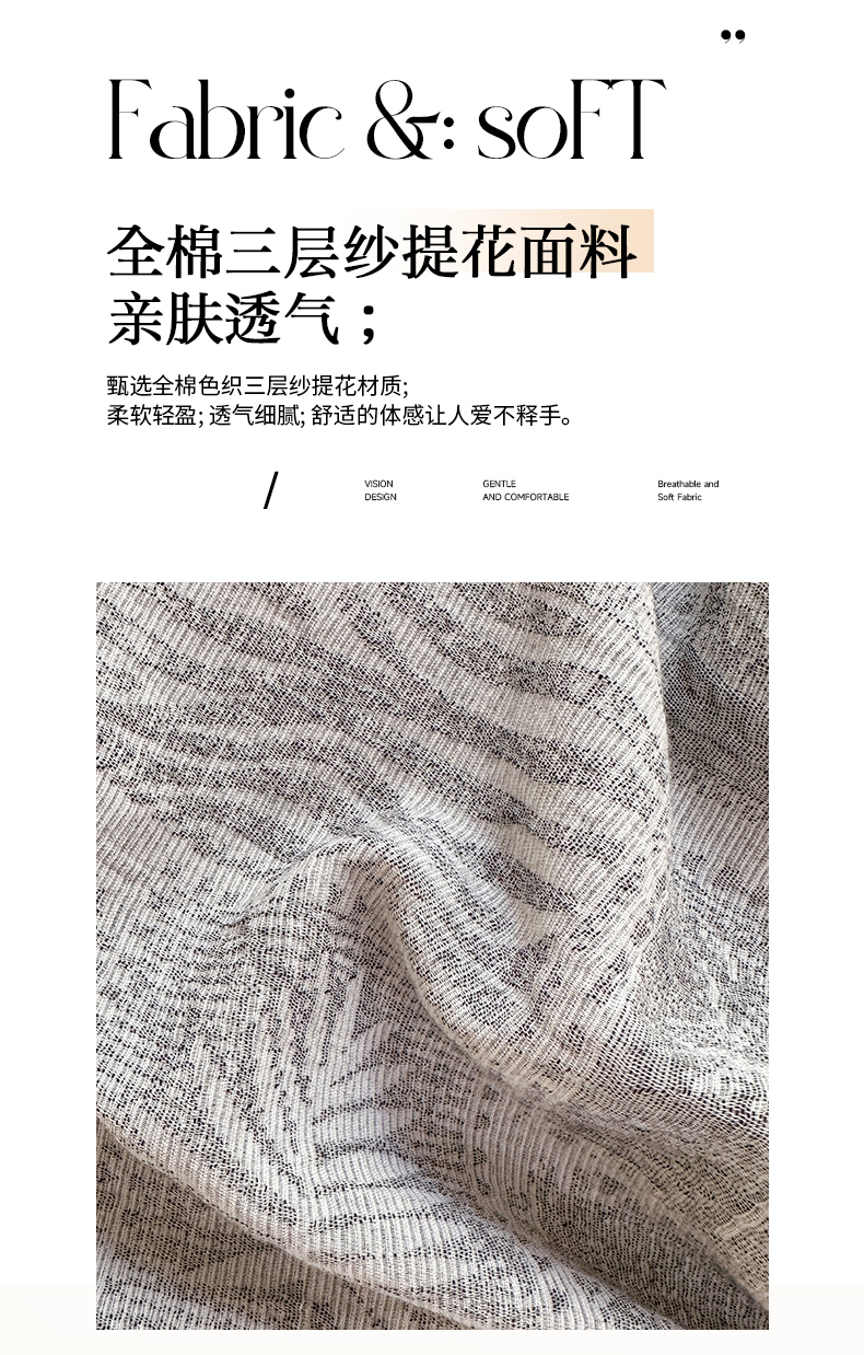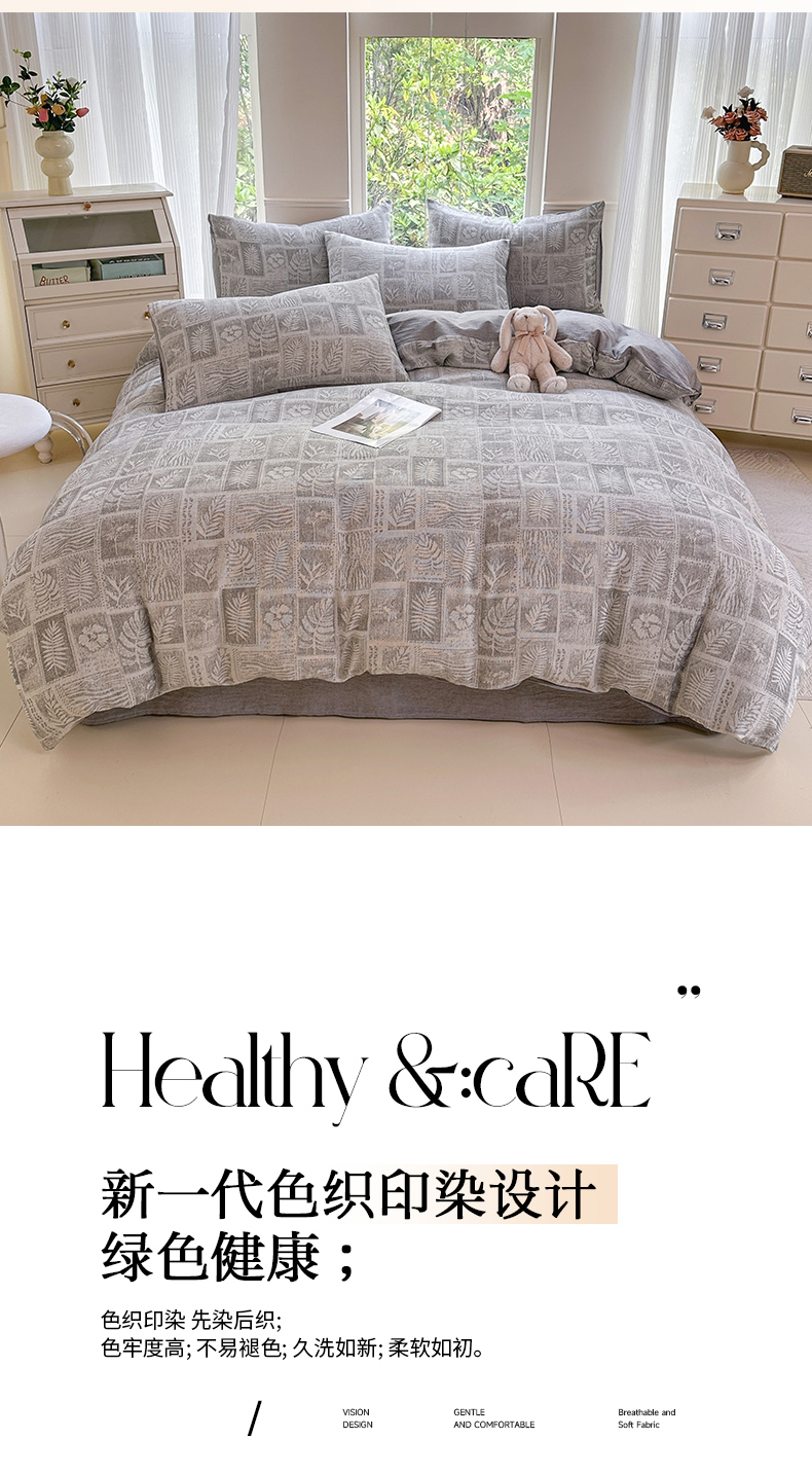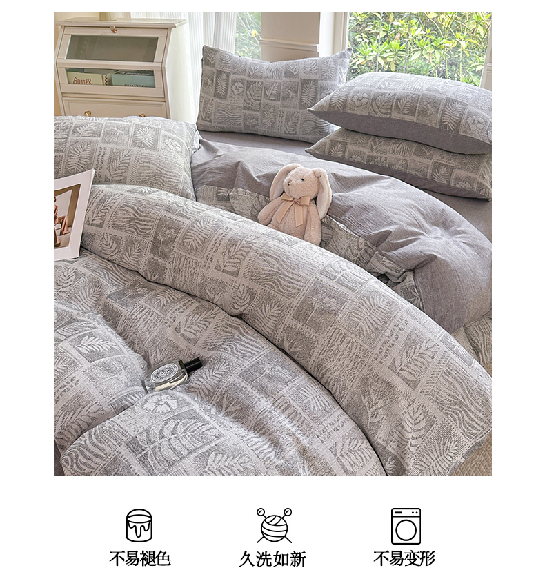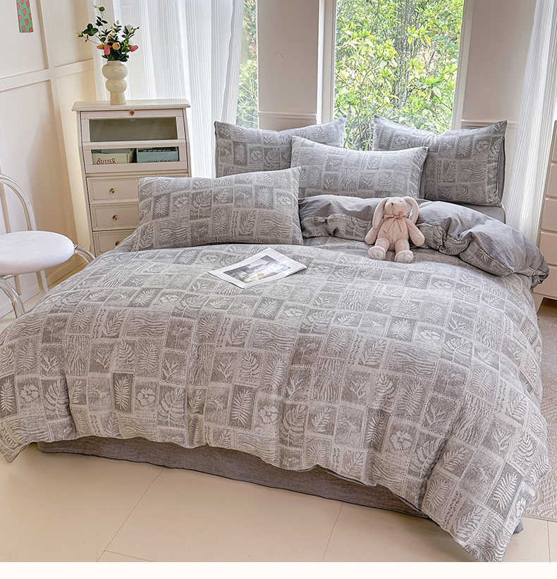 当前位置: 91家纺网 > 商品网购 > 床品套件 > 四件套 > 色织四件套 > 菡宝 2025新款a类母婴级纯棉全棉纯棉色织三层纱提花系列四件套 叶之美-灰
