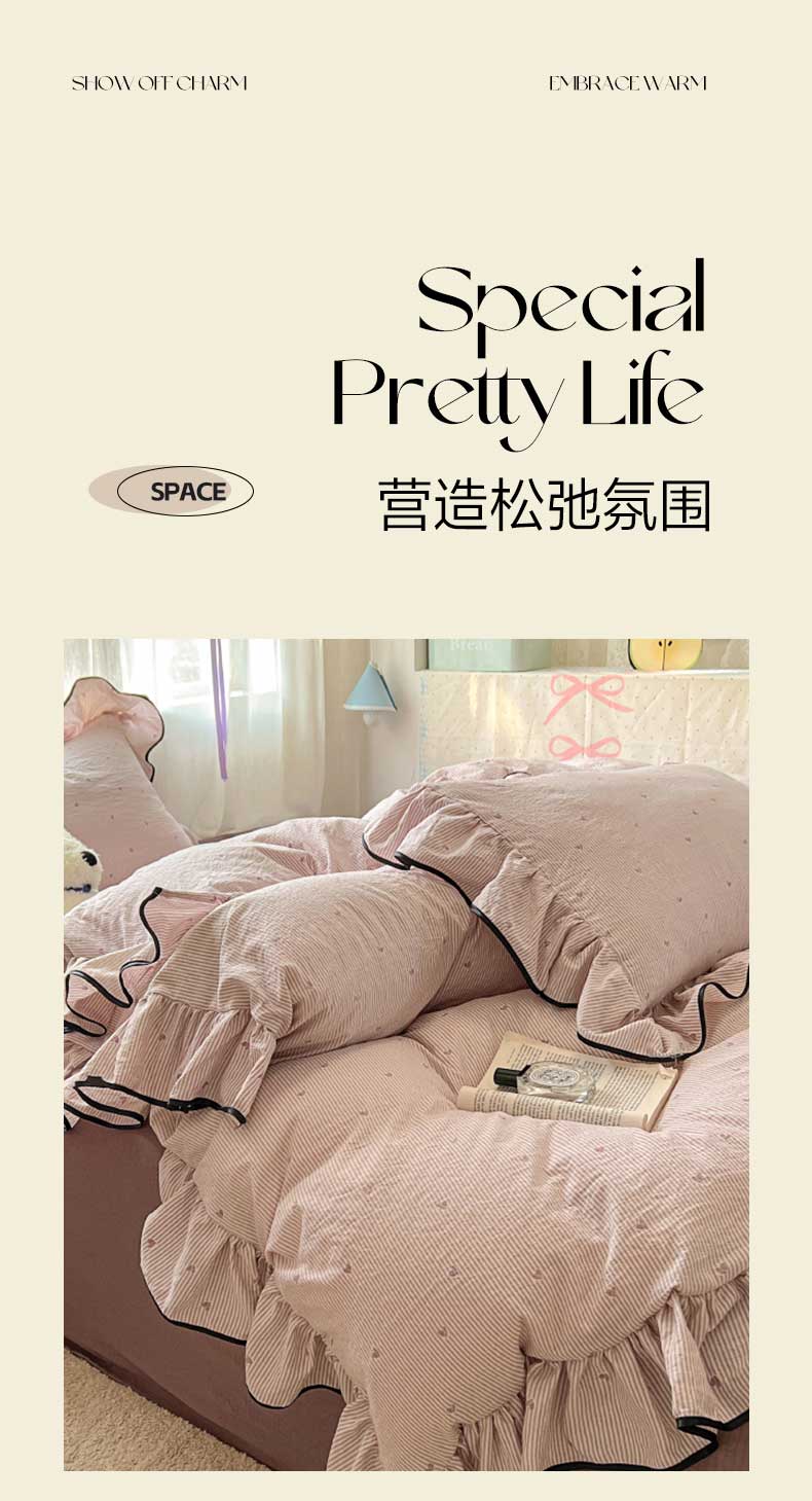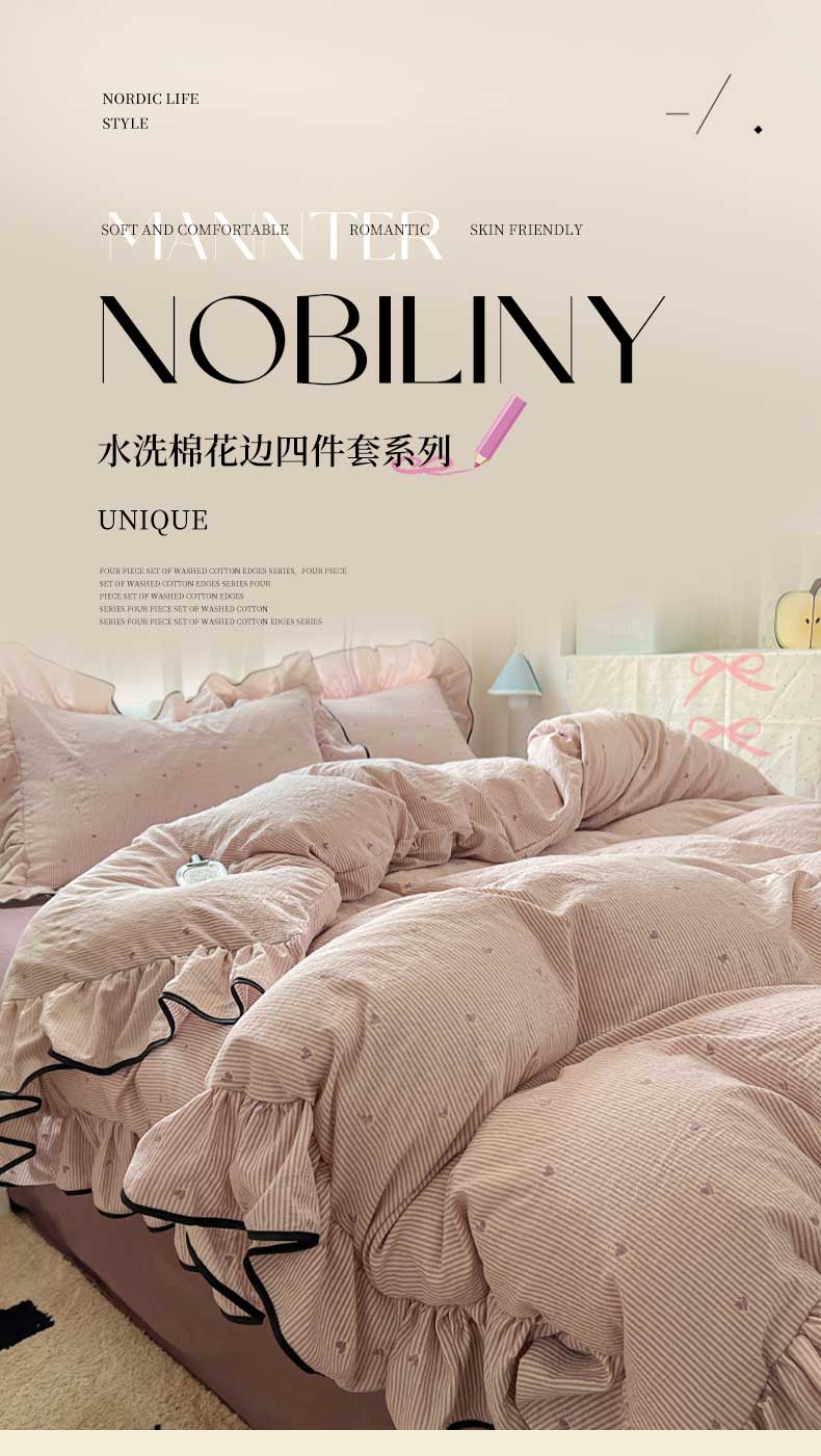 当前位置: 91家纺网 > 商品网购 > 床品套件 > 四件套 > 水洗棉四件套 > 繁花家居 2025春夏新款学生季韩式云感针织棉大花边木耳边四件套 一见倾心