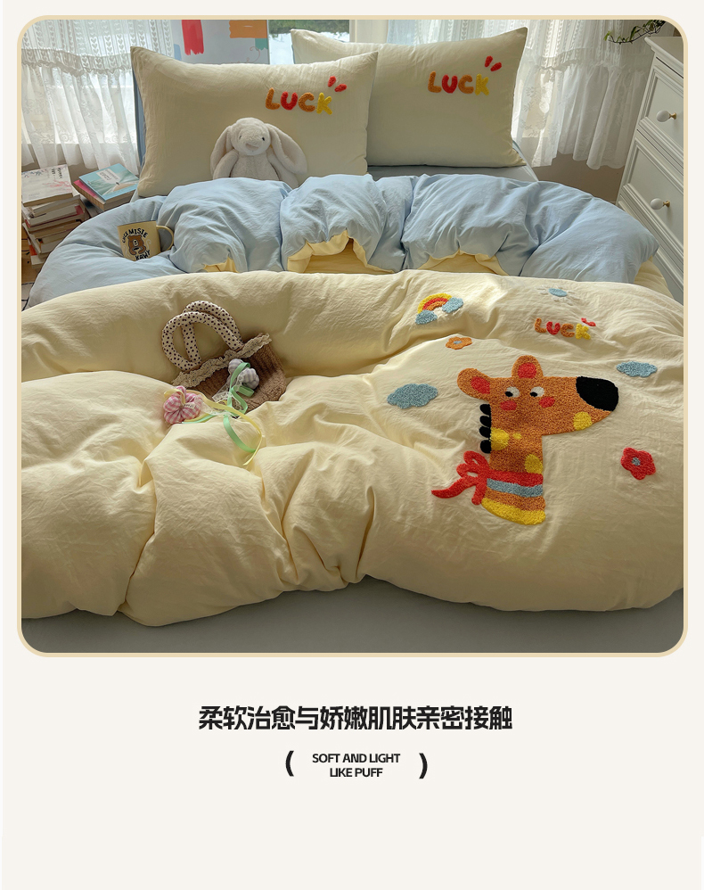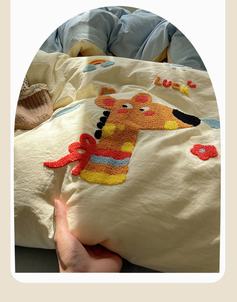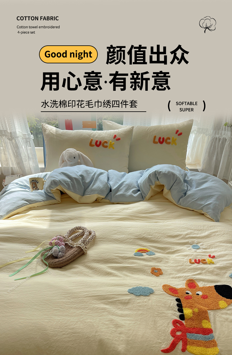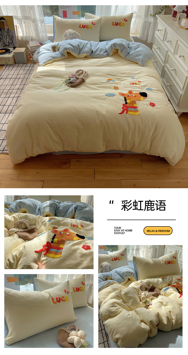 当前位置: 91家纺网 > 商品网购 > 床品套件 > 四件套 > 化纤活性四件套 > 优兰朵 2025新款爆款宿舍可爱水洗棉毛巾绣四件套 彩虹鹿语