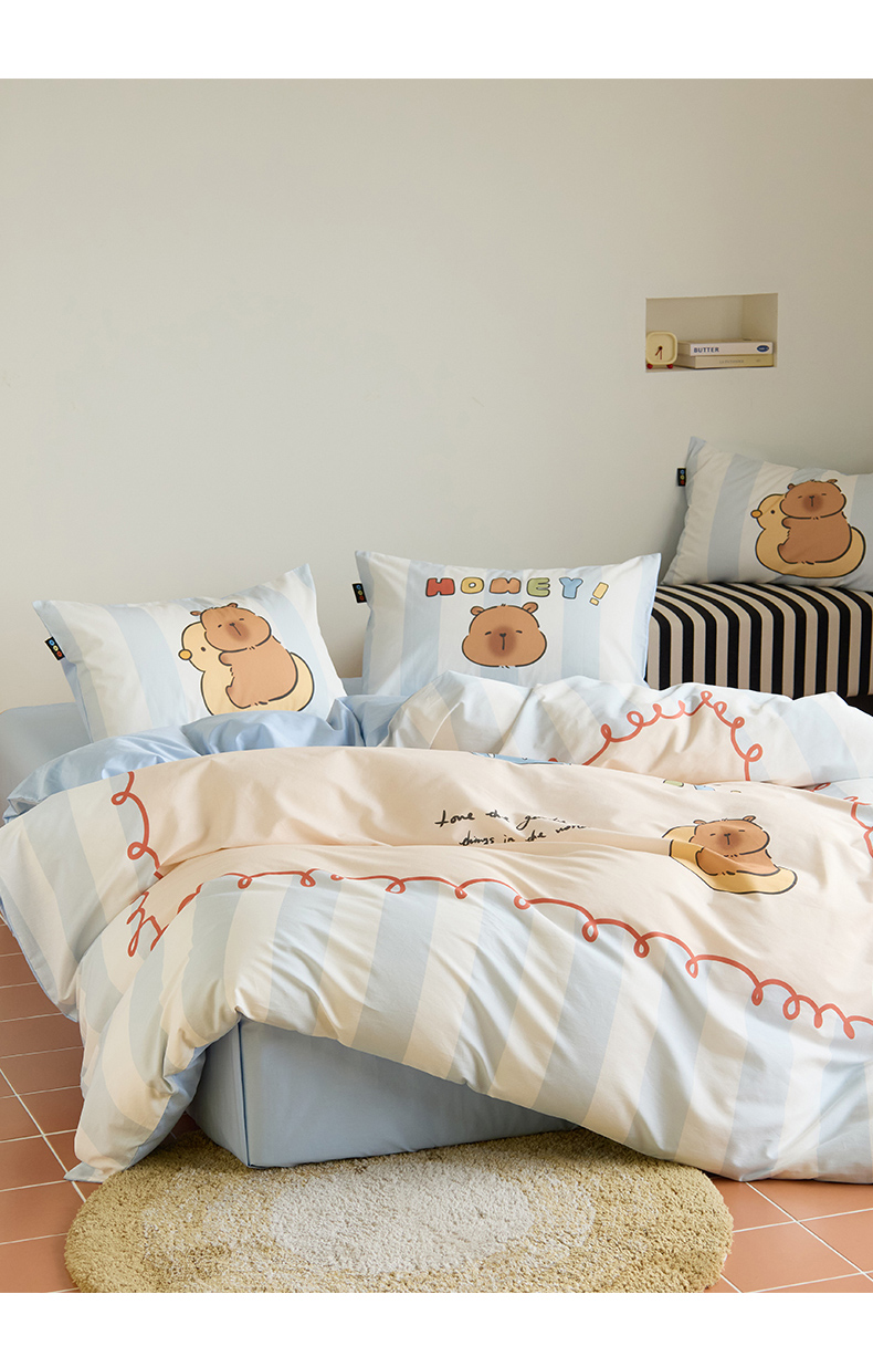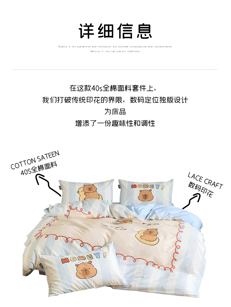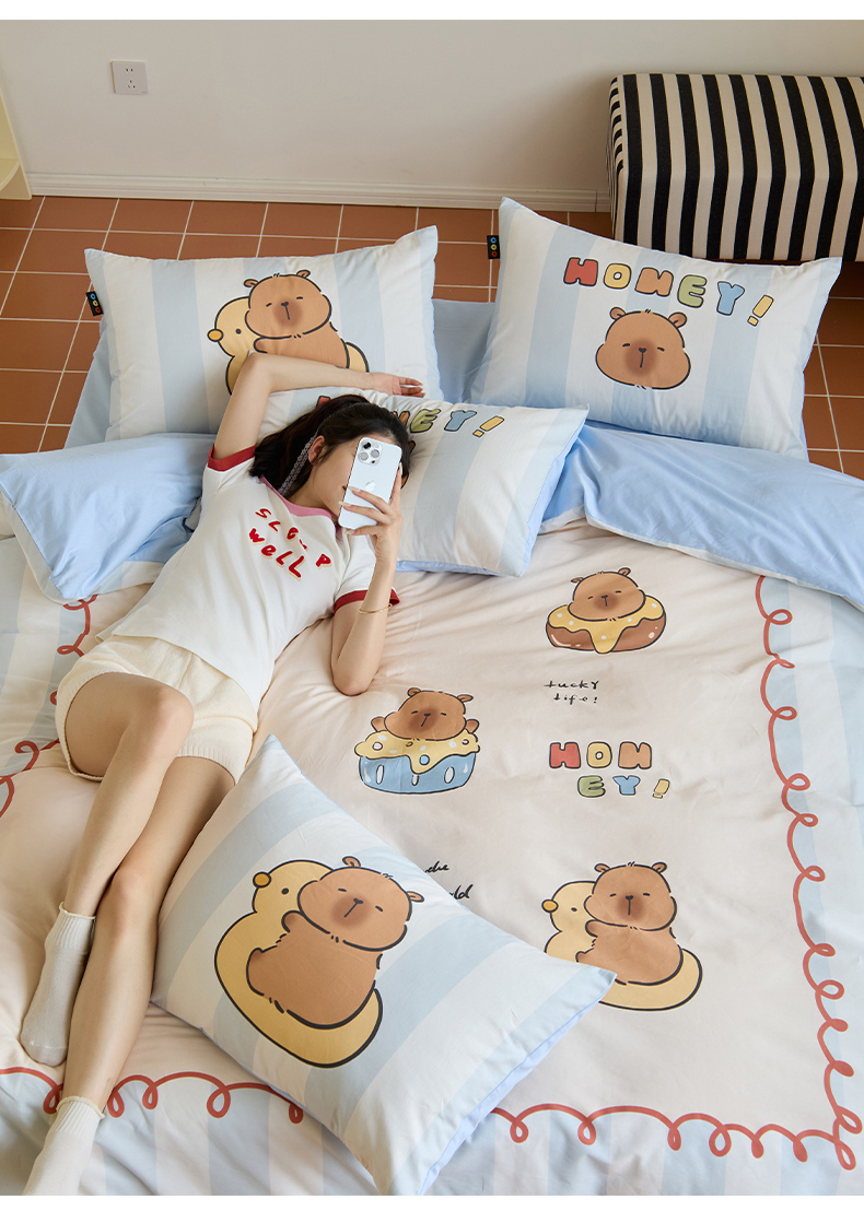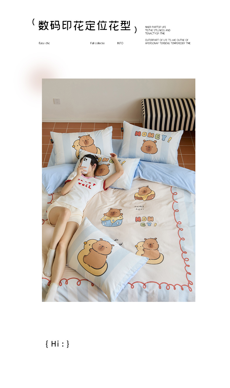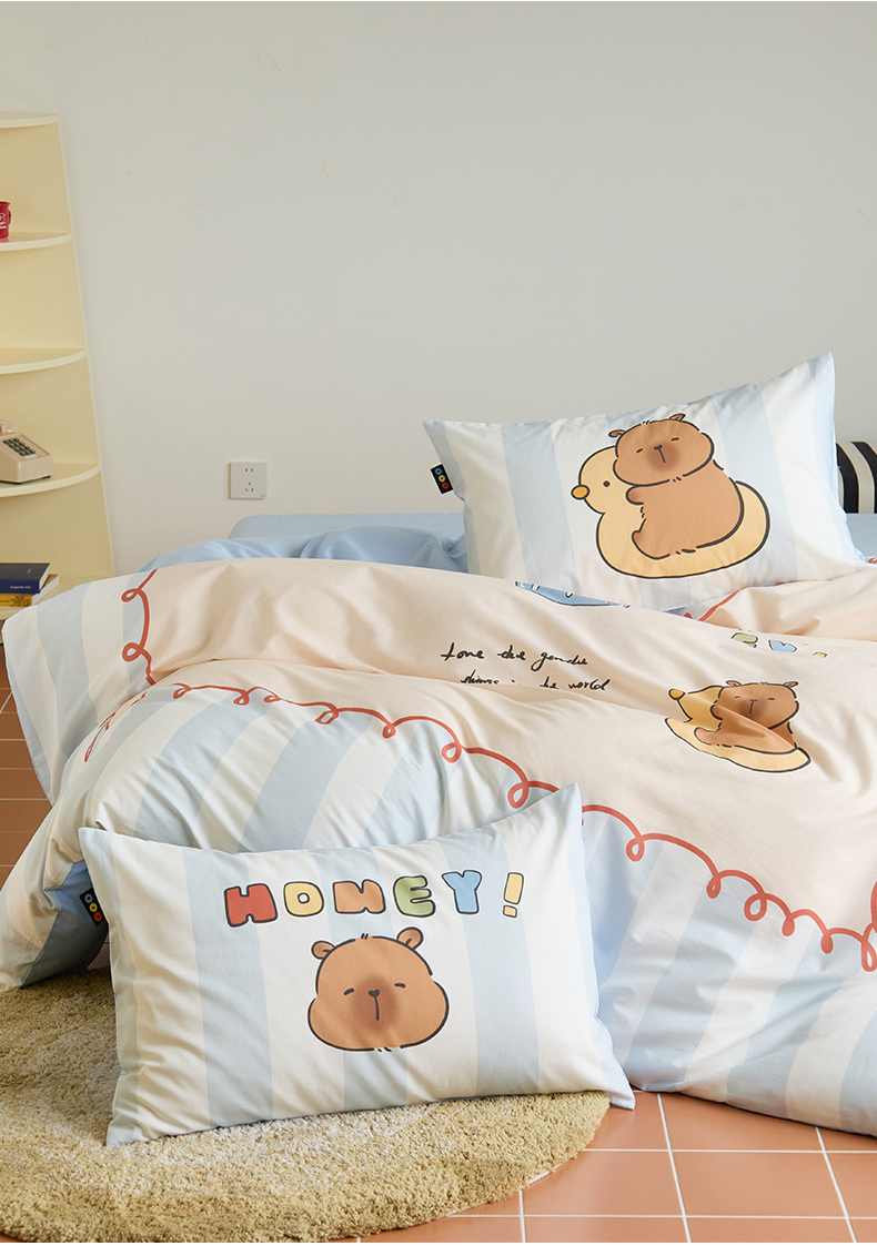 商品名称:RYB红黄兰 开学季2025新款ins设计师原创13372大版卡通数码印花40s全棉纯棉三件套四件套 蛋糕卡皮巴拉