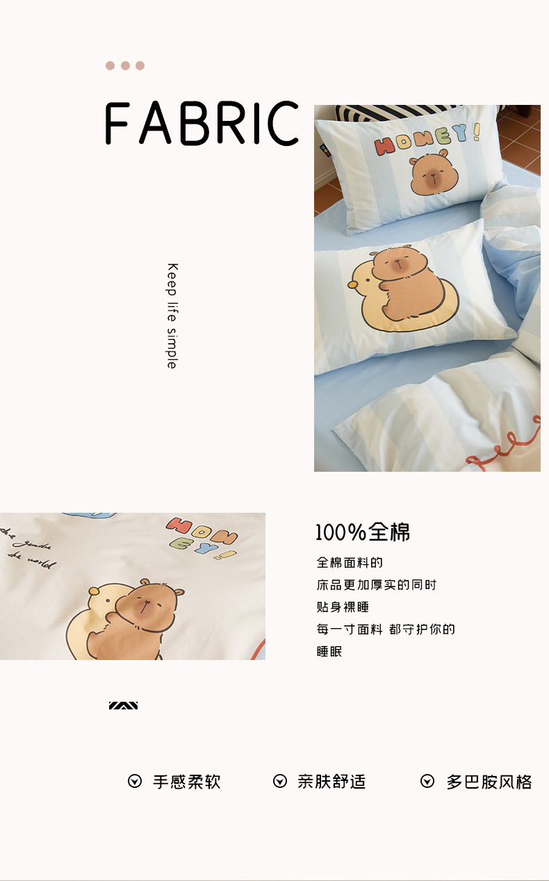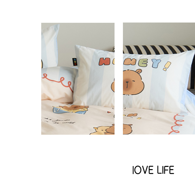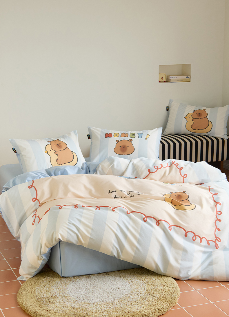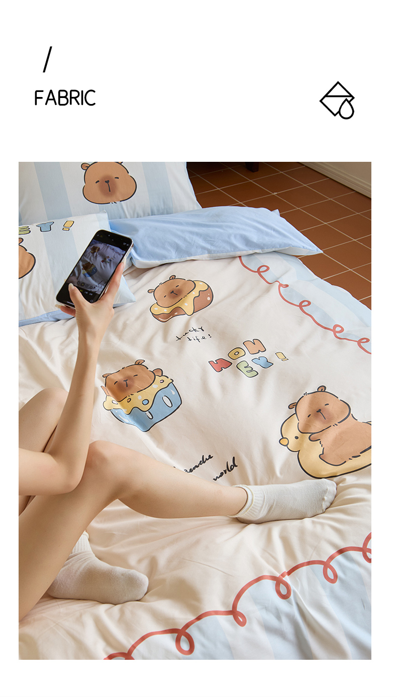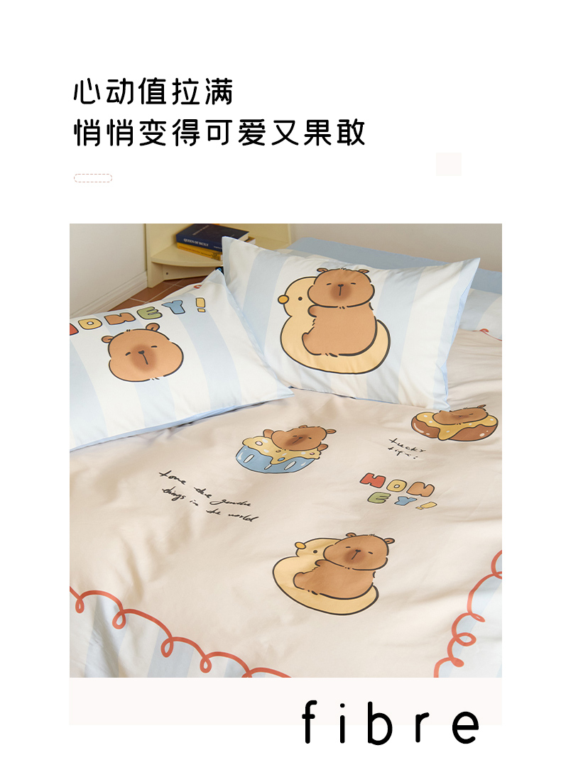 商品名称:RYB红黄兰 开学季2025新款ins设计师原创13372大版卡通数码印花40s全棉纯棉三件套四件套 蛋糕卡皮巴拉