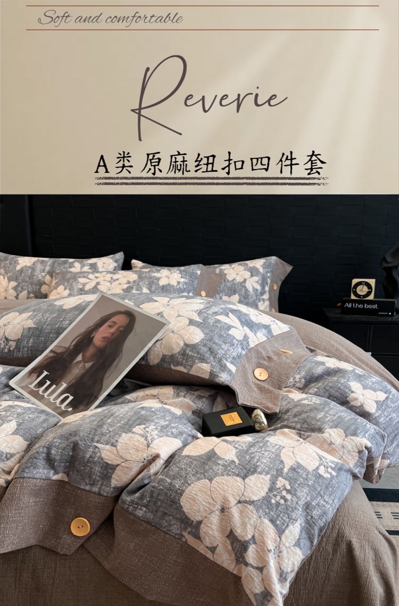 商品名称:圣比熊 2025新款原麻纽扣四件套加厚被套床单宿舍双人床仿亚麻套件 陌上花开-咖