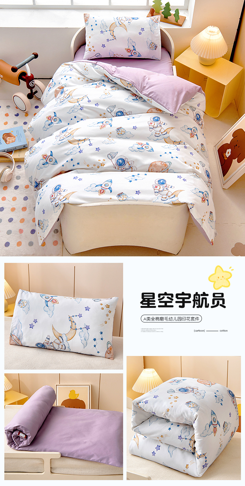 当前位置: 91家纺网 > 商品网购 > 床品套件 > 三件套 > 梵赫 2025新款纯棉A类50*50数码卡通小版婴童套件幼儿园三件套 星空宇航员