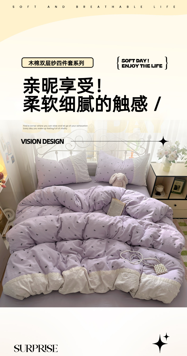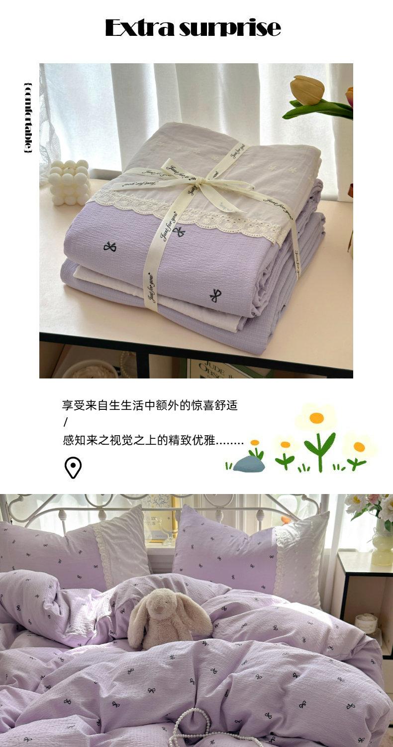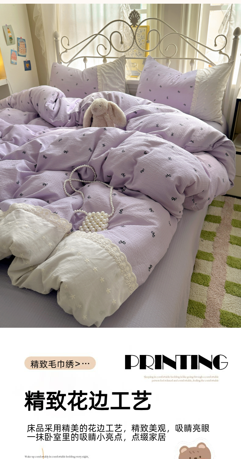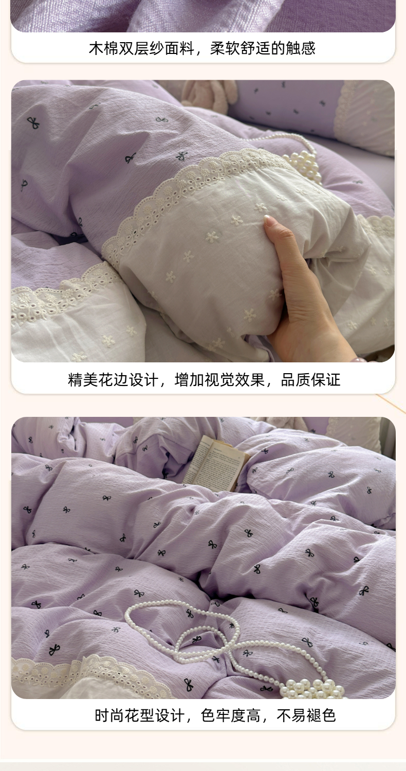 当前位置: 91家纺网 > 商品网购 > 床品套件 > 四件套 > 双层纱四件套 > 思诺羽床笠 2025新款A类法式小清新皱皱纱花边蕾丝水洗棉床上四件套宿舍床笠三件套 紫色浪漫