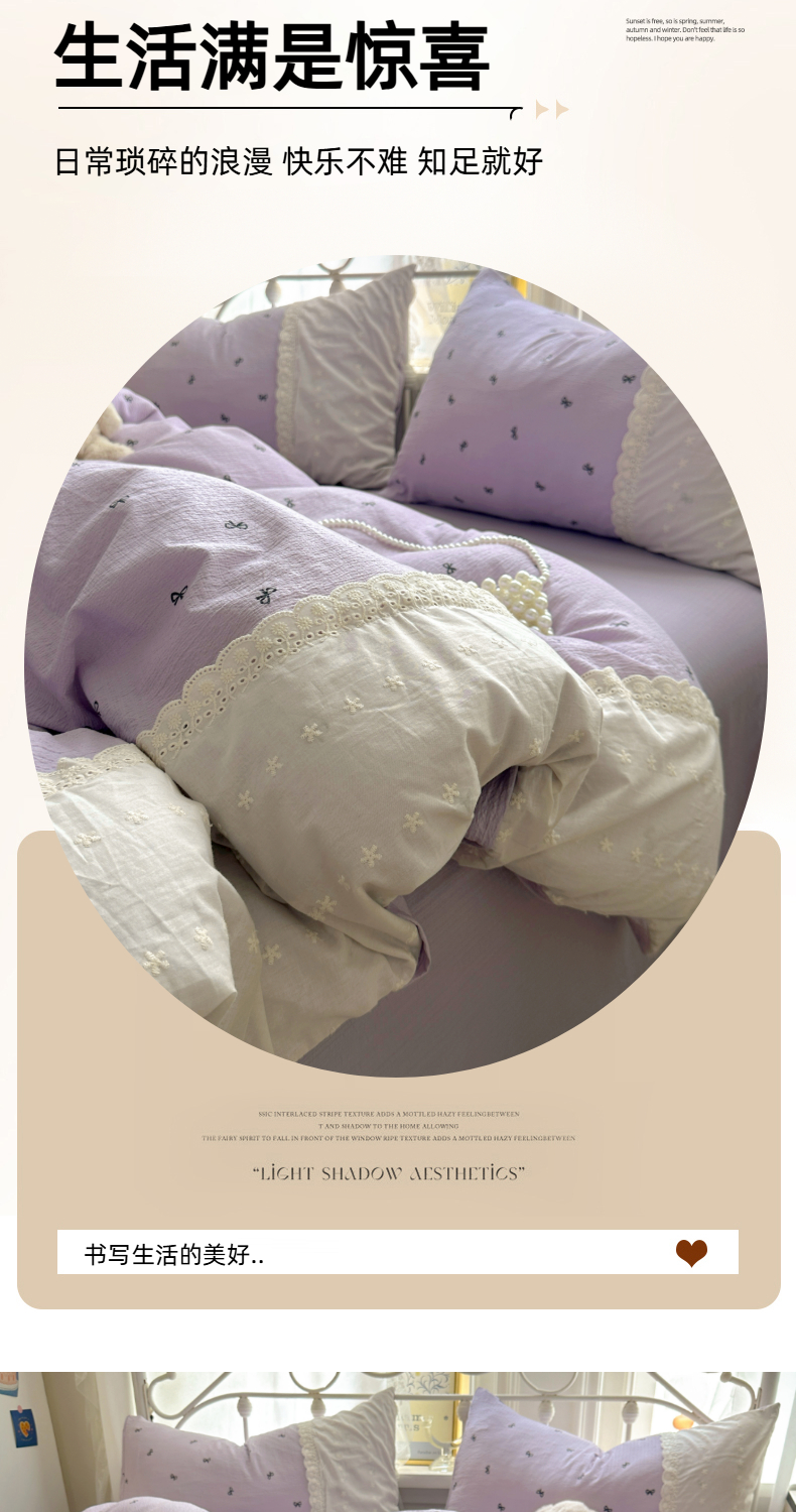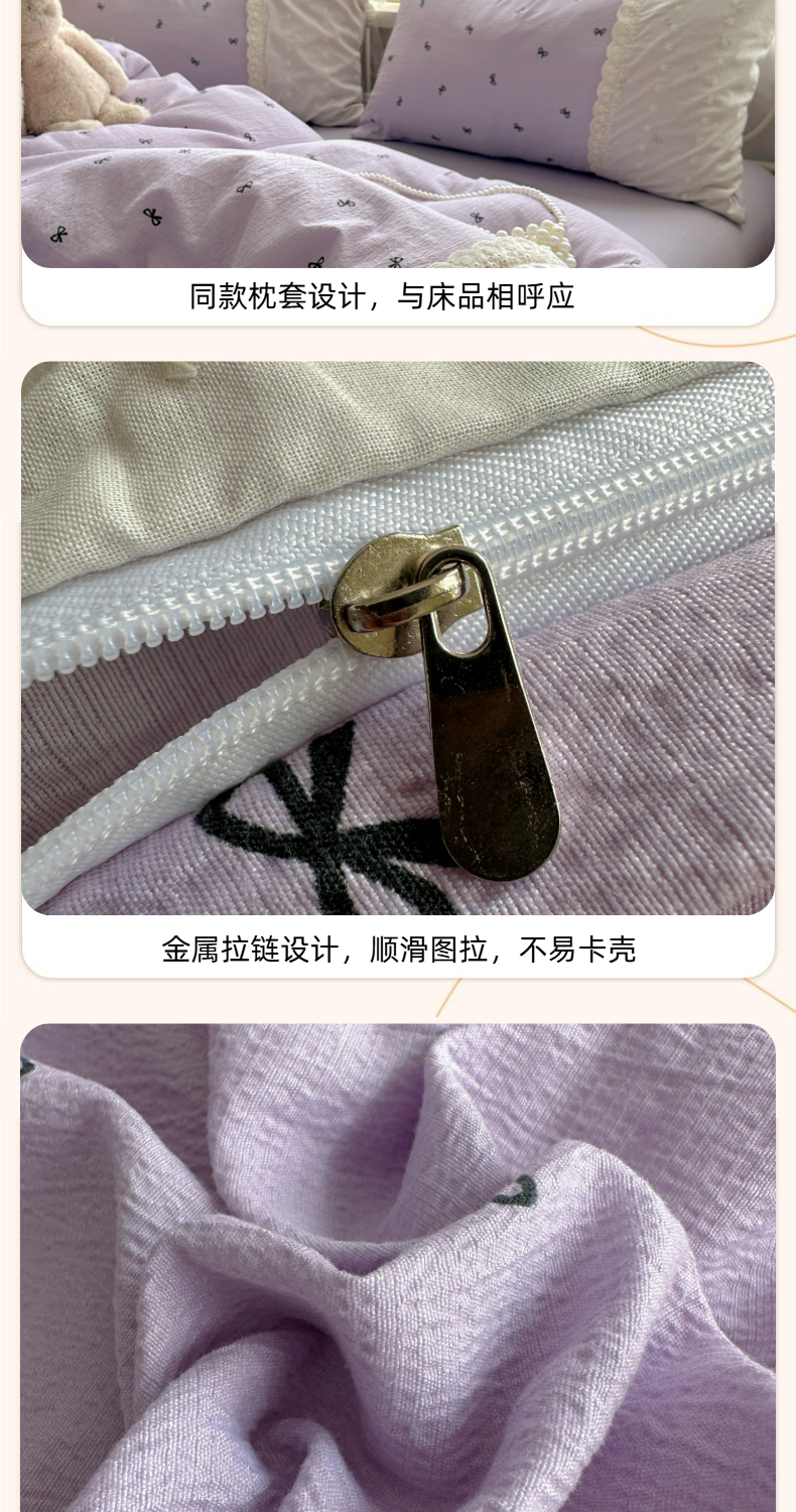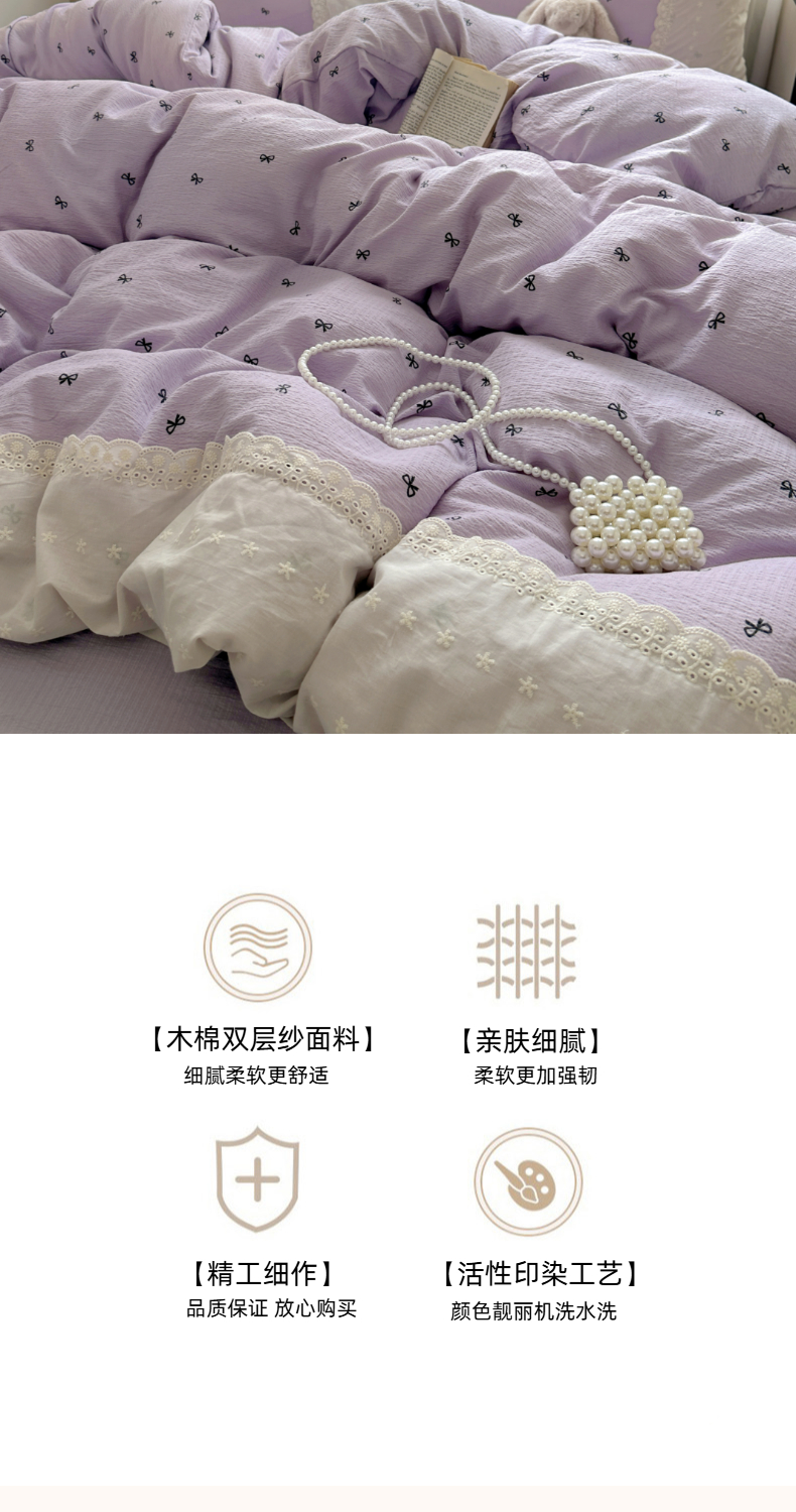 当前位置: 91家纺网 > 商品网购 > 床品套件 > 四件套 > 双层纱四件套 > 思诺羽床笠 2025新款A类法式小清新皱皱纱花边蕾丝水洗棉床上四件套宿舍床笠三件套 紫色浪漫