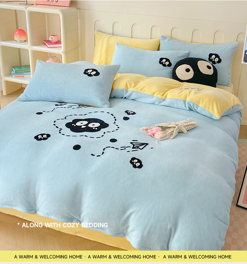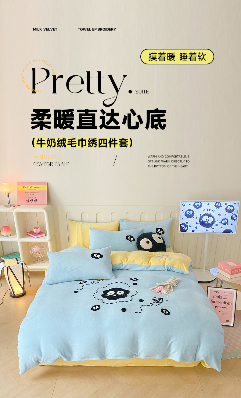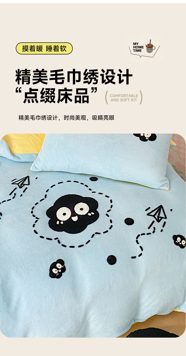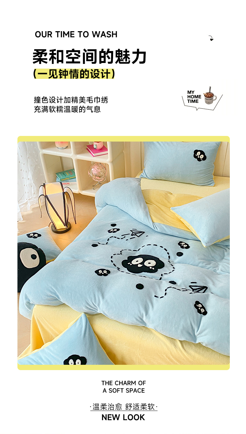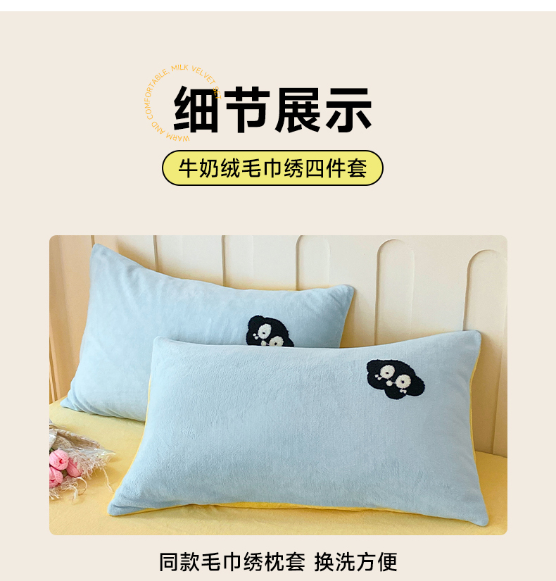 N先生+V 13814689556 发大图/买家秀 2025秋冬新款小清新牛奶绒毛巾绣四件套-小煤球 蓝黄
