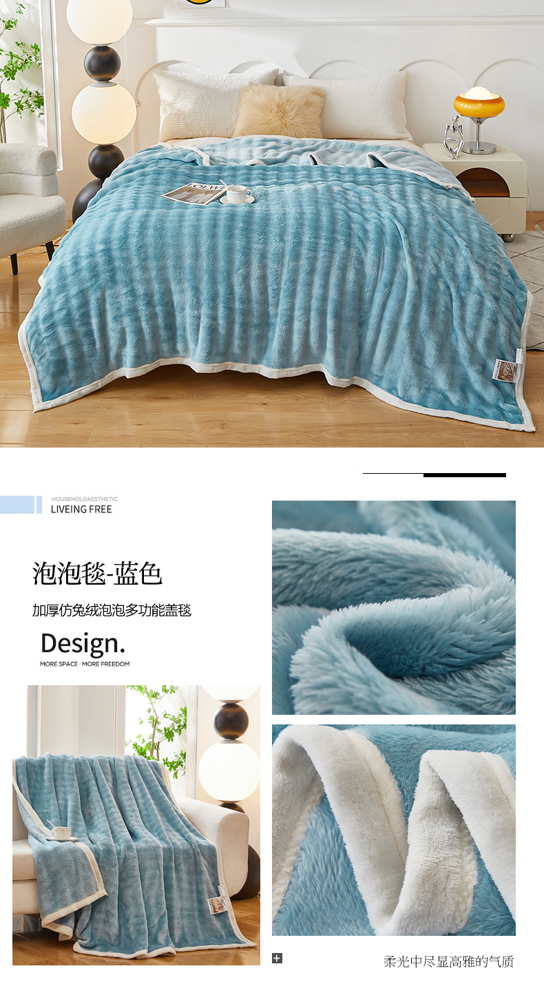 商品名称:七里香 2025新款A类跨境外贸托卡斯兔毛绒牛奶绒毛毯泡泡毯多功能盖毯 泡泡毯-蓝色