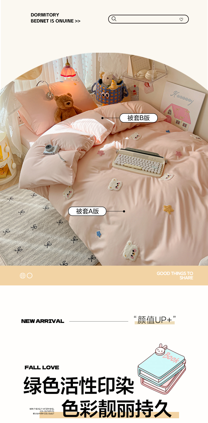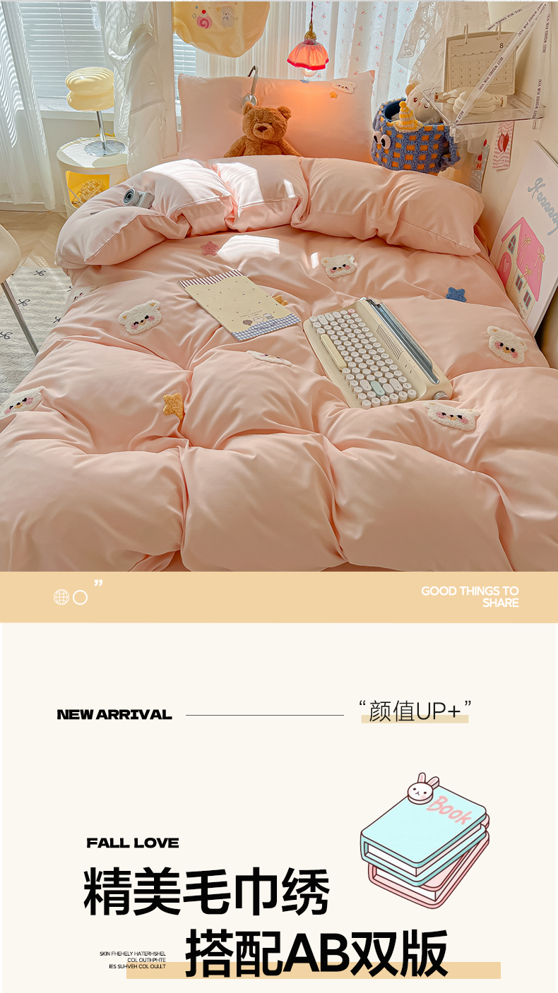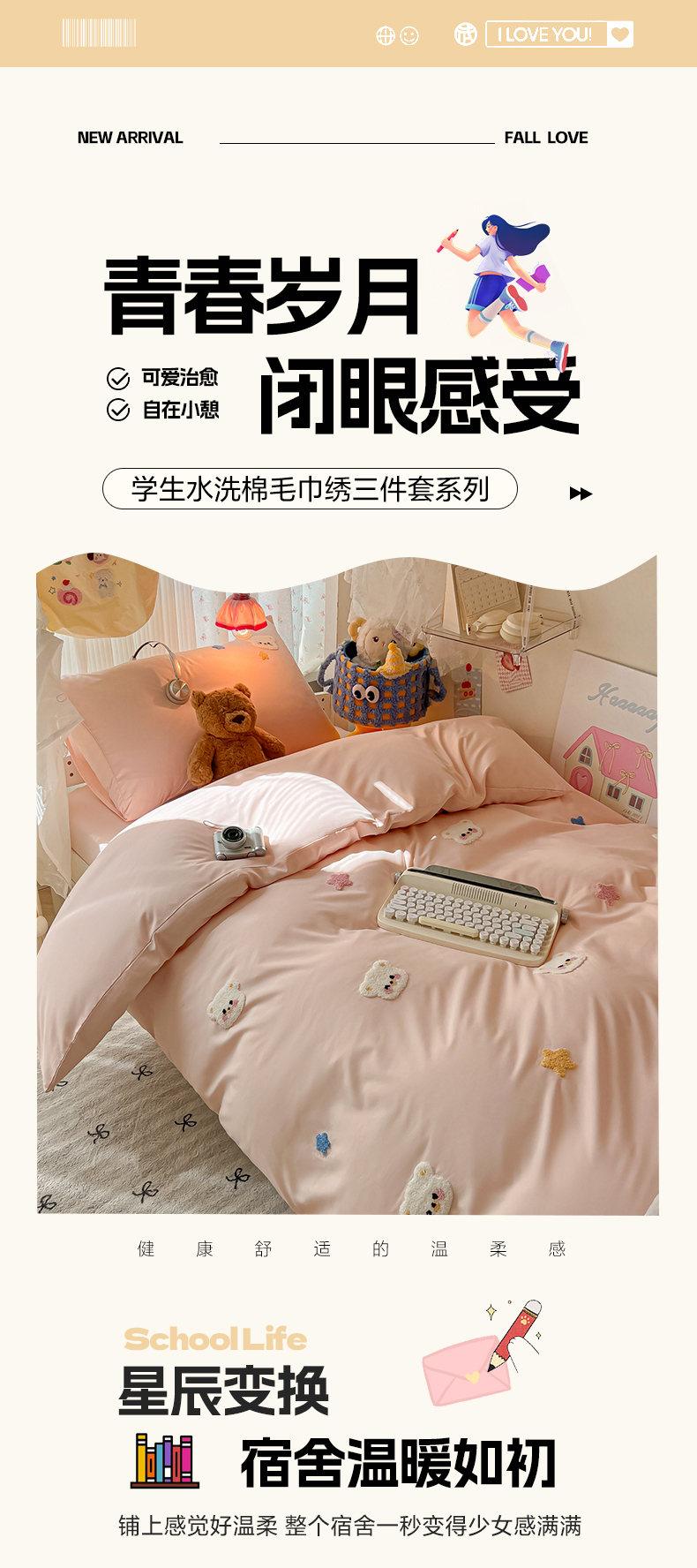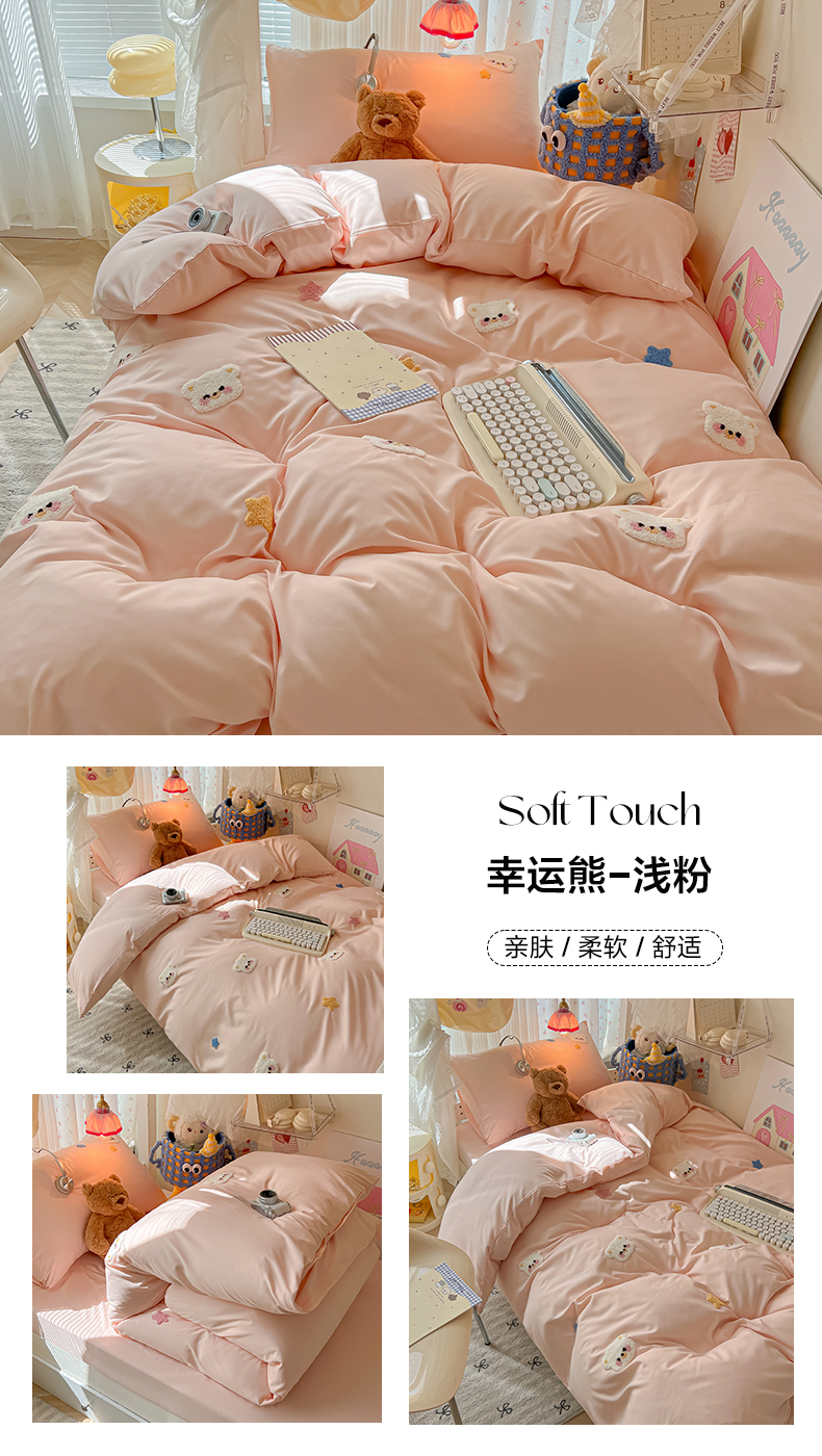 当前位置: 91家纺网 > 商品网购 > 床品套件 > 三件套 > 韩巢家纺 2025新款学生宿舍寝室高低床水洗棉毛巾绣学生季被套床单三件套-幸运熊 幸运熊浅粉
