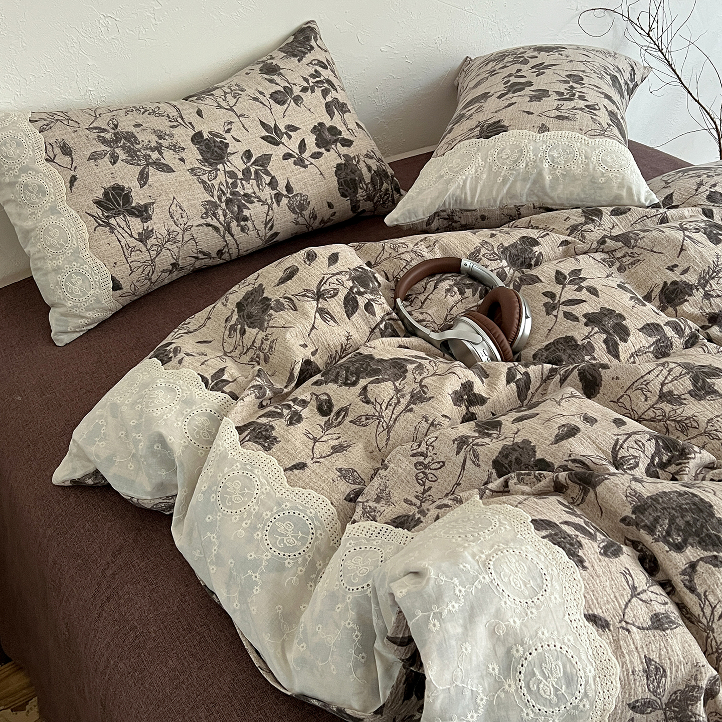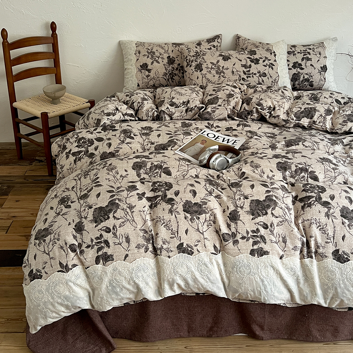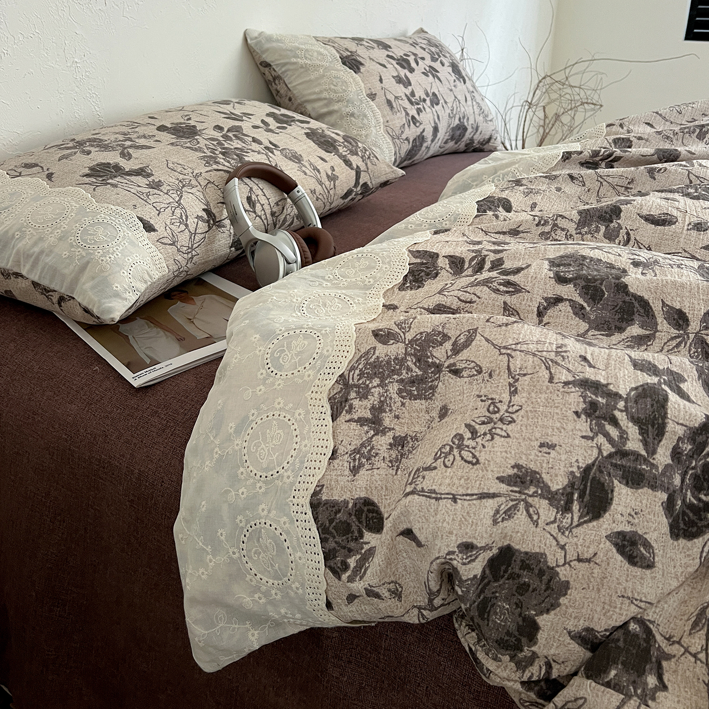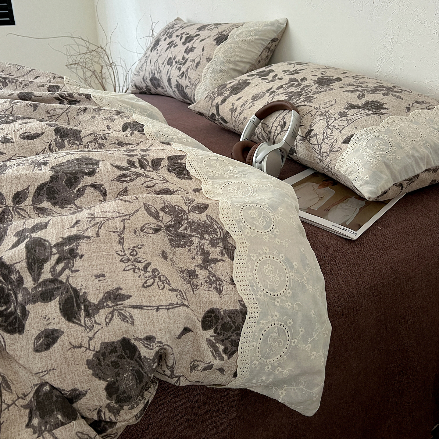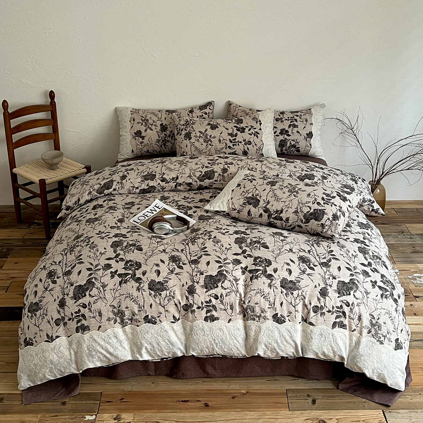 商品名称:一比一家纺 2025秋冬新品高克重原麻复古全棉花边棉麻侘寂风原麻四件套 (控价99元)茶野