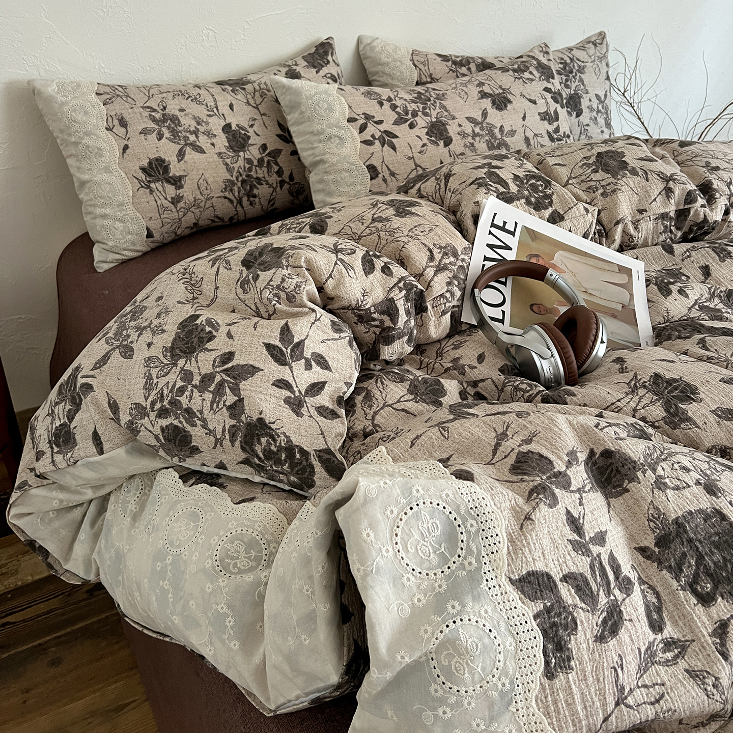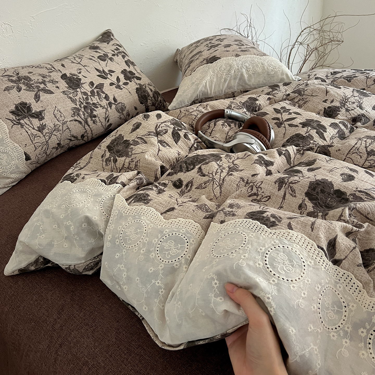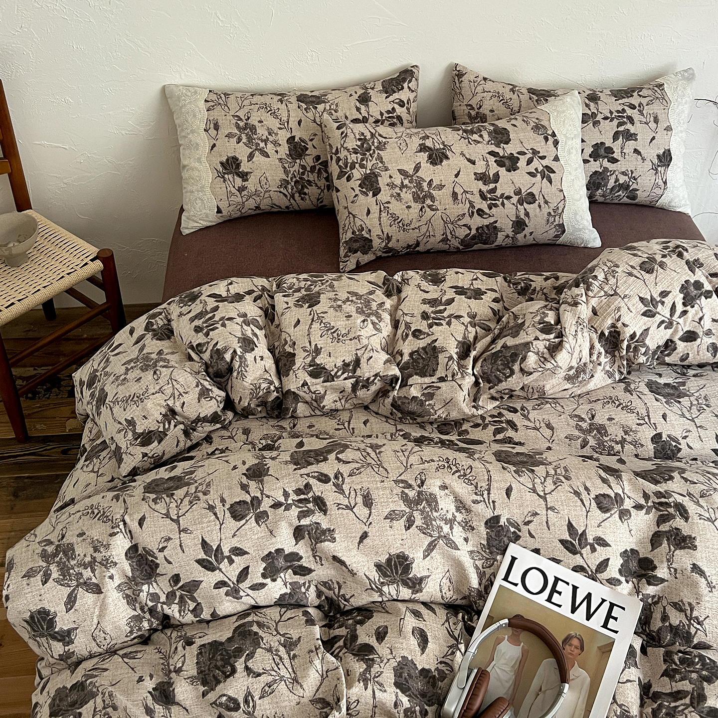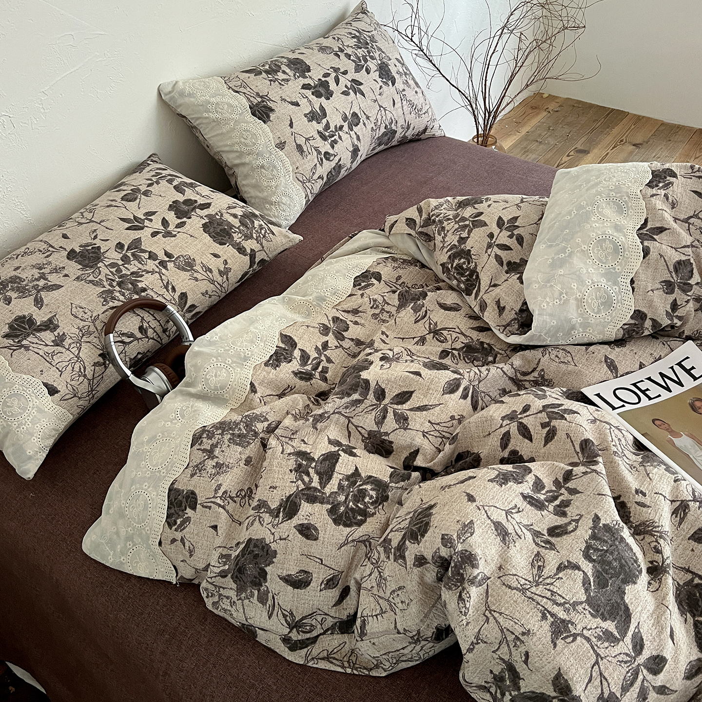 商品名称:一比一家纺 2025秋冬新品高克重原麻复古全棉花边棉麻侘寂风原麻四件套 (控价99元)茶野
