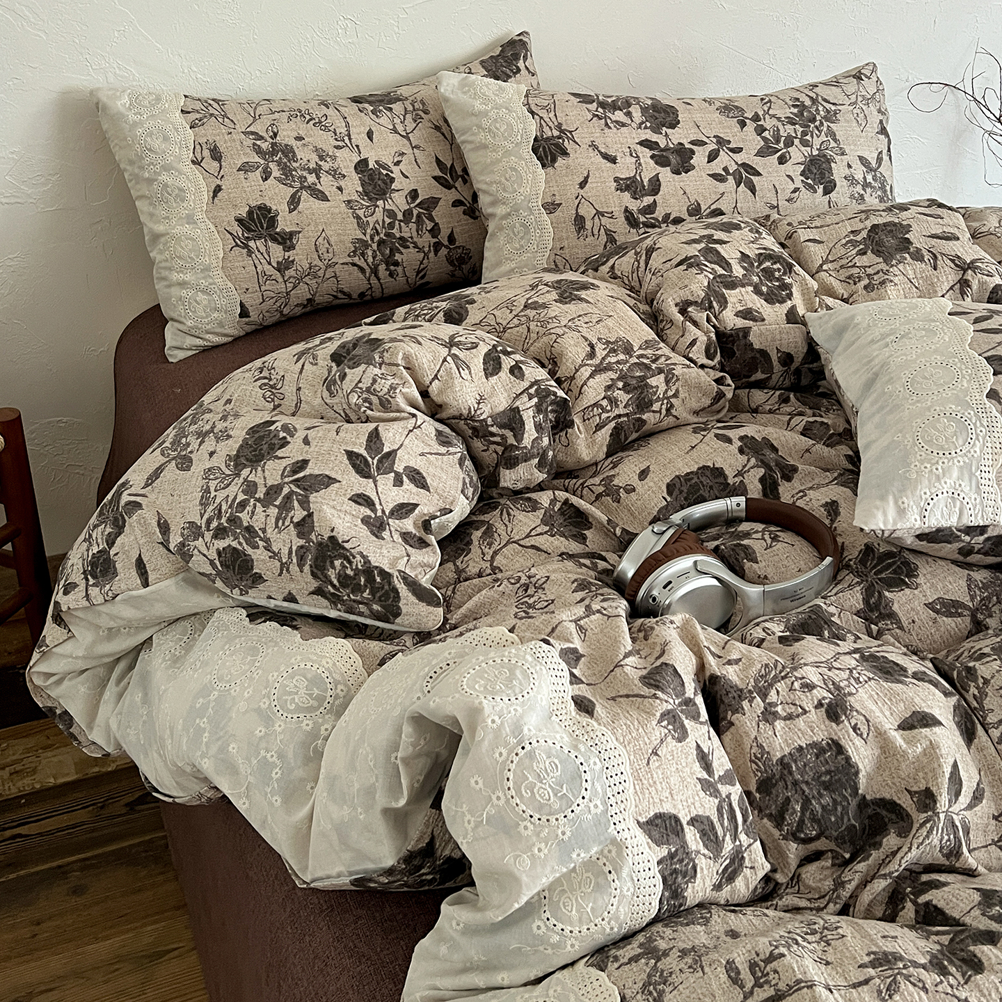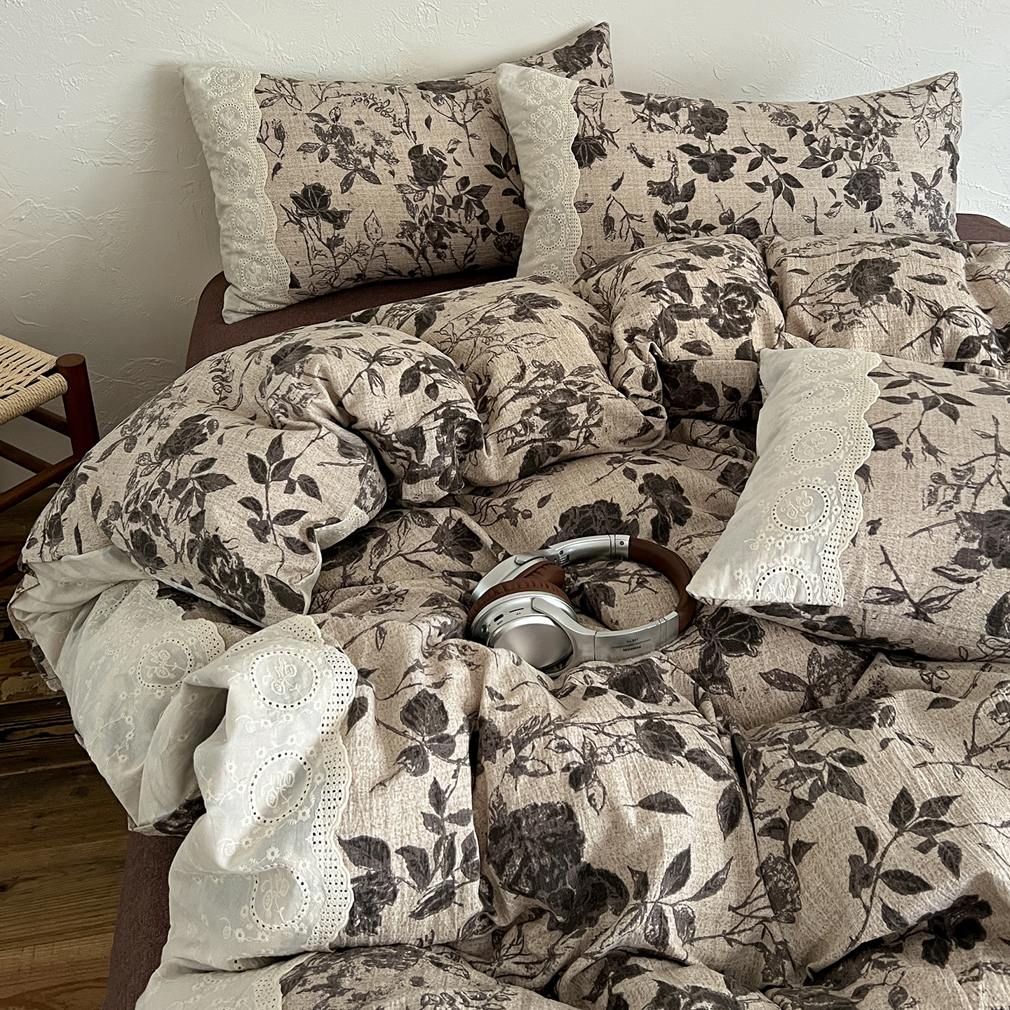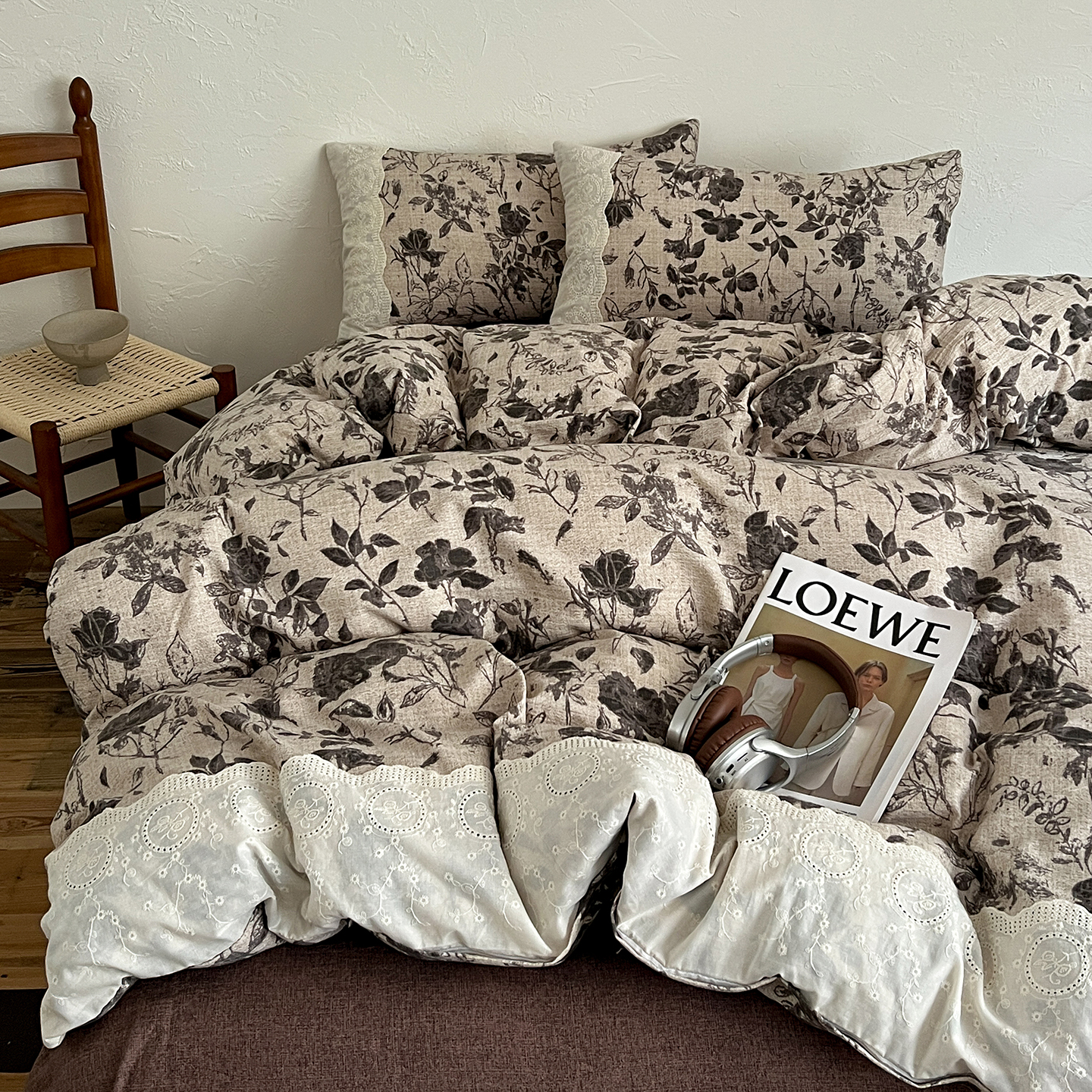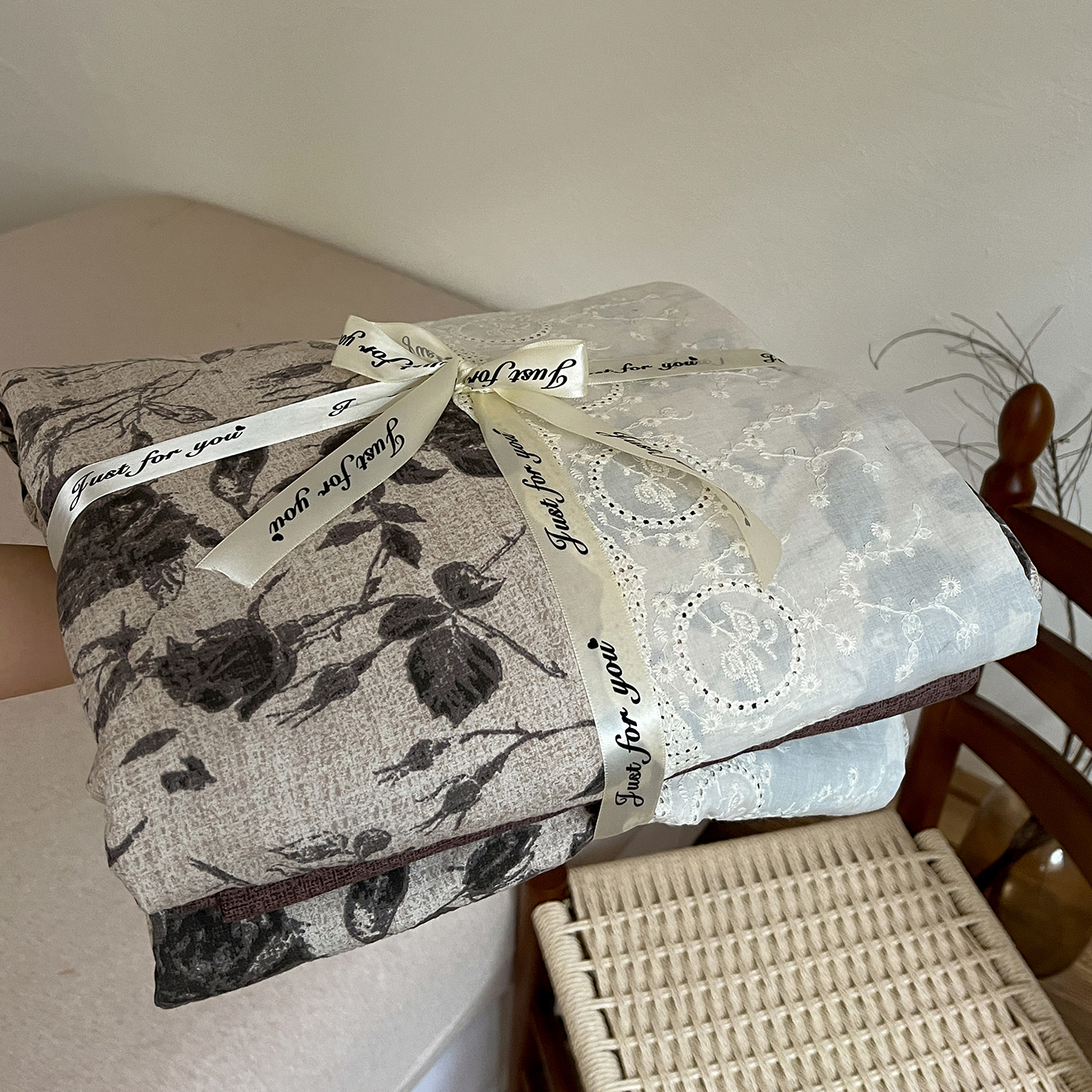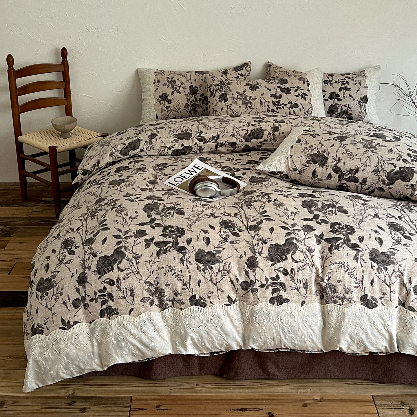 商品名称:一比一家纺 2025秋冬新品高克重原麻复古全棉花边棉麻侘寂风原麻四件套 (控价99元)茶野