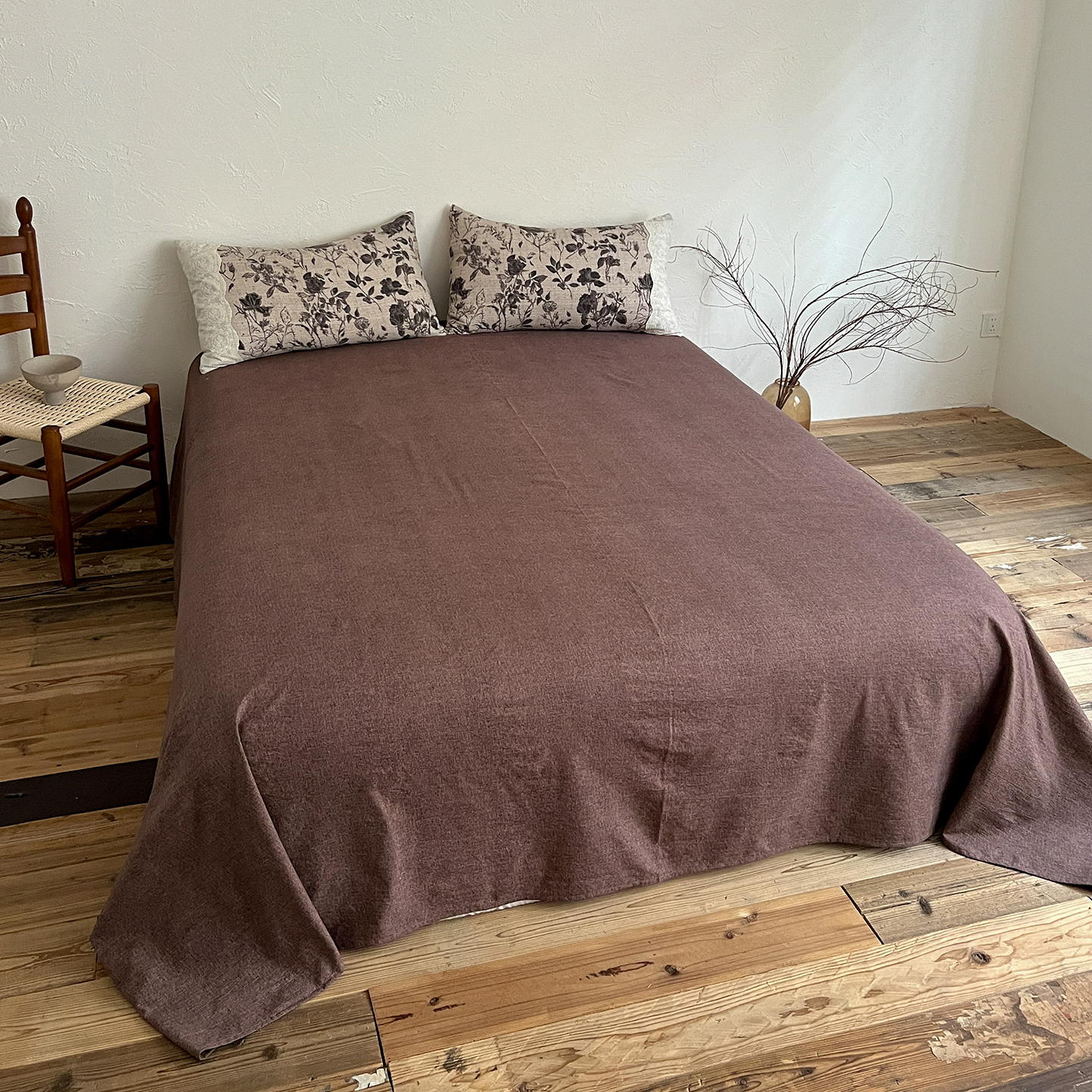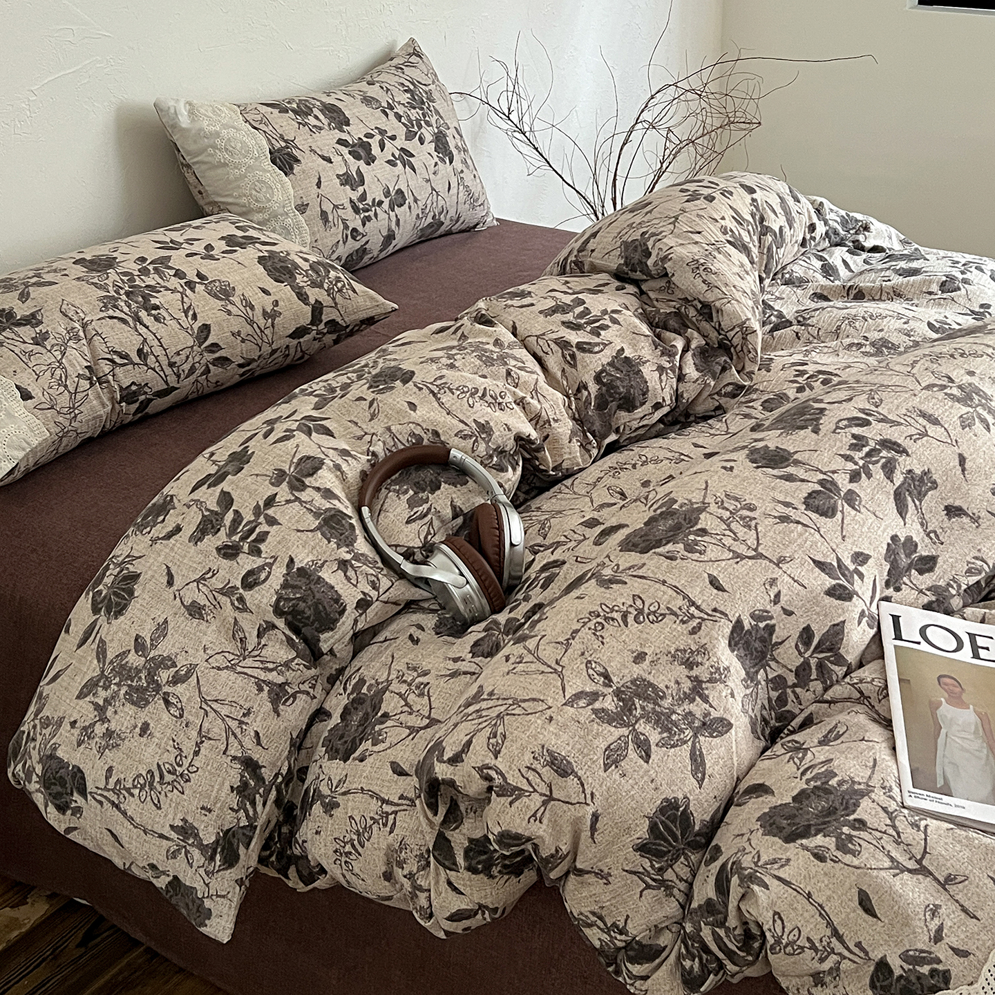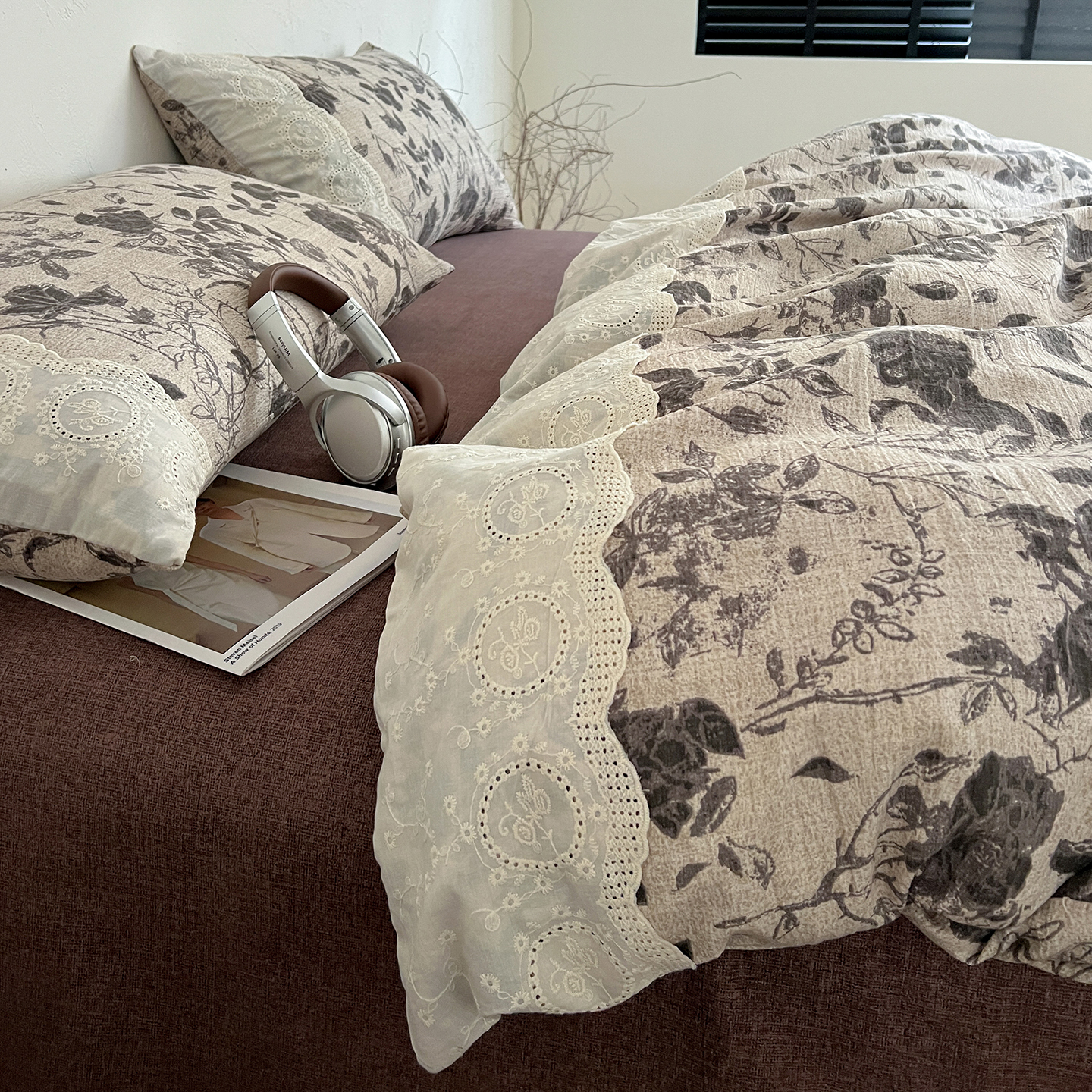 一比一家纺 2025秋冬新品高克重原麻复古全棉花边棉麻侘寂风原麻四件套 (控价99元)茶野