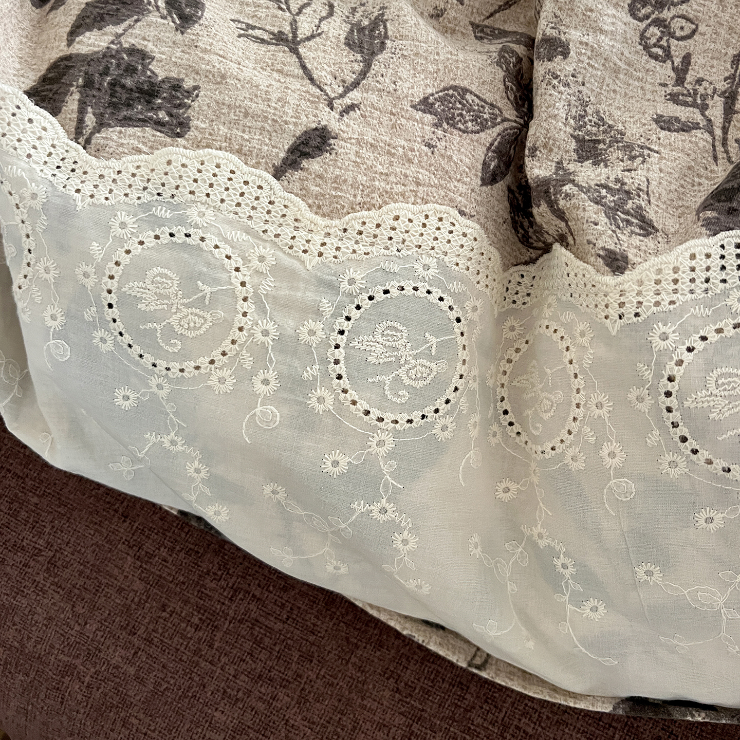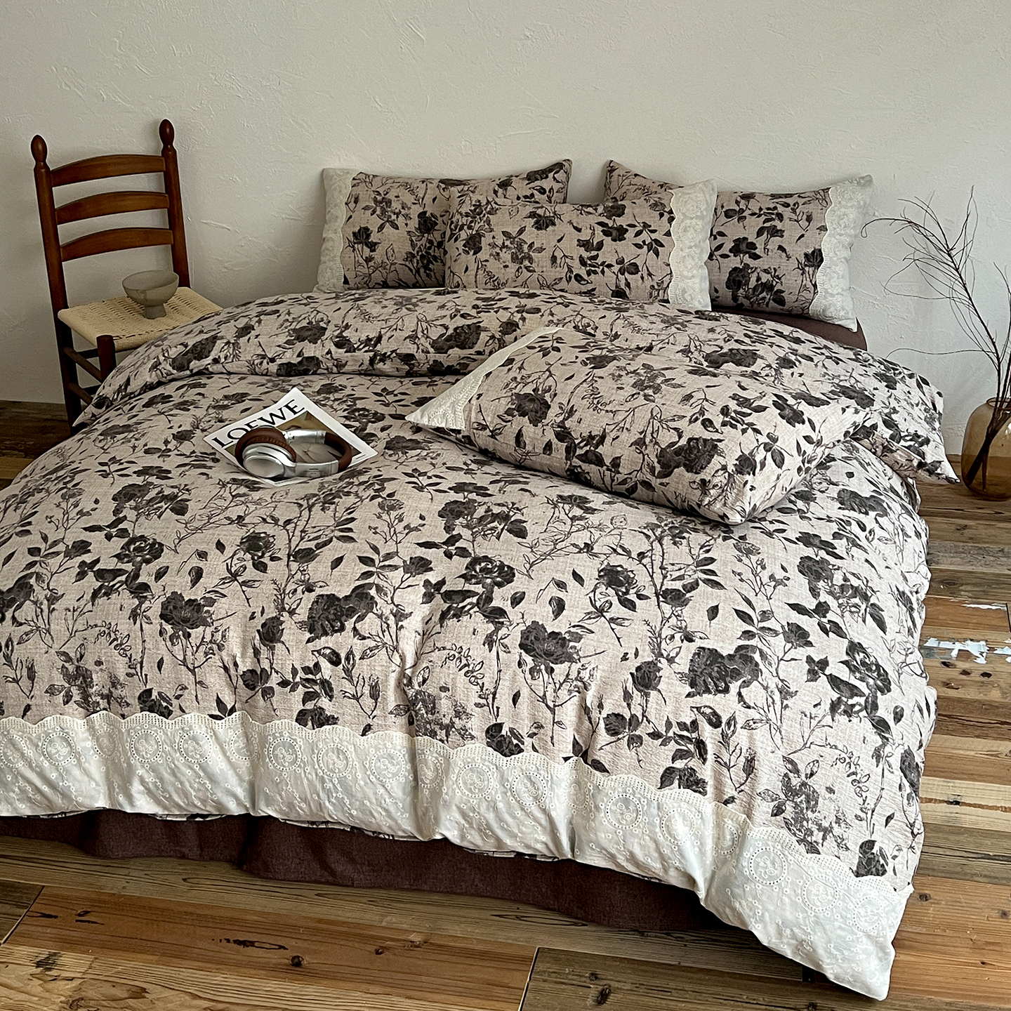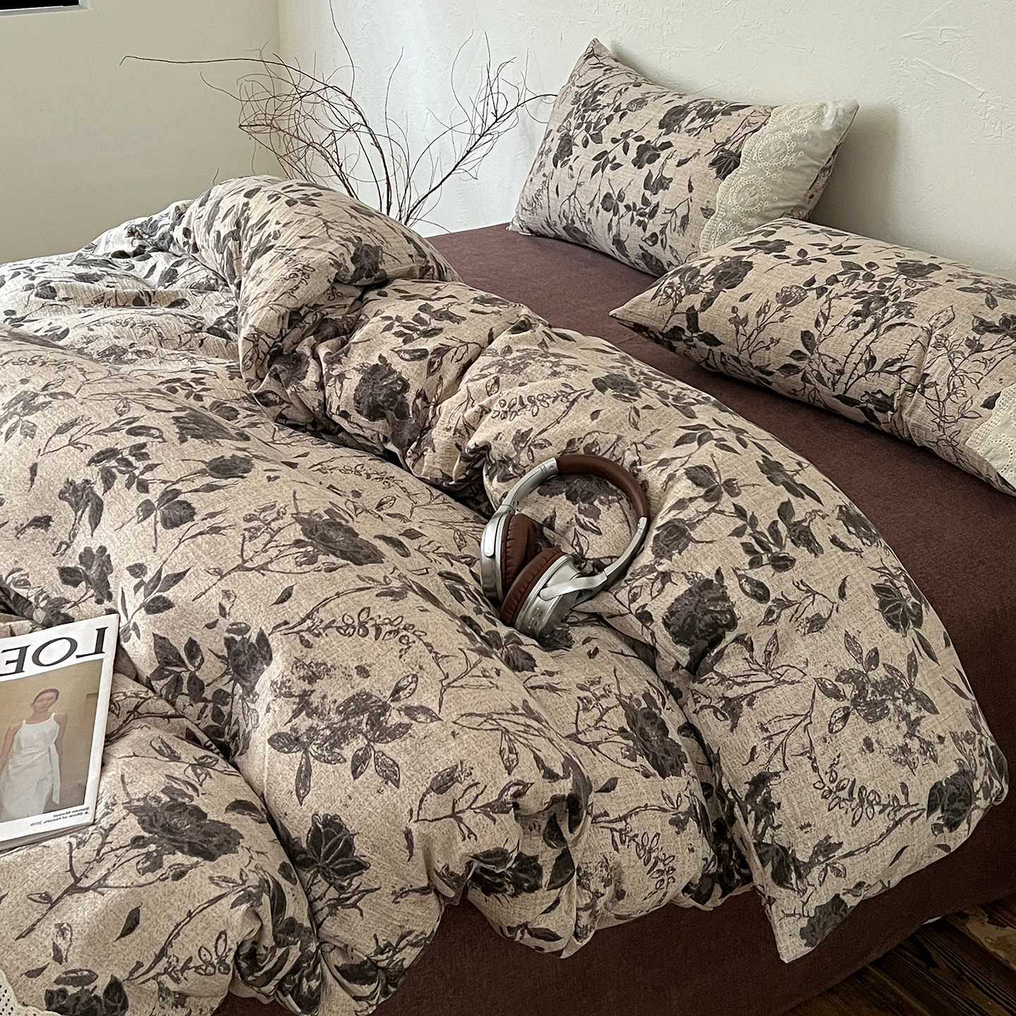 一比一家纺 2025秋冬新品高克重原麻复古全棉花边棉麻侘寂风原麻四件套 (控价99元)茶野