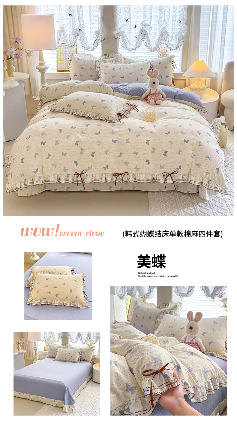 韩约家纺 2025新款1韩式蝴蝶结加厚床单款棉麻四件套 美蝶