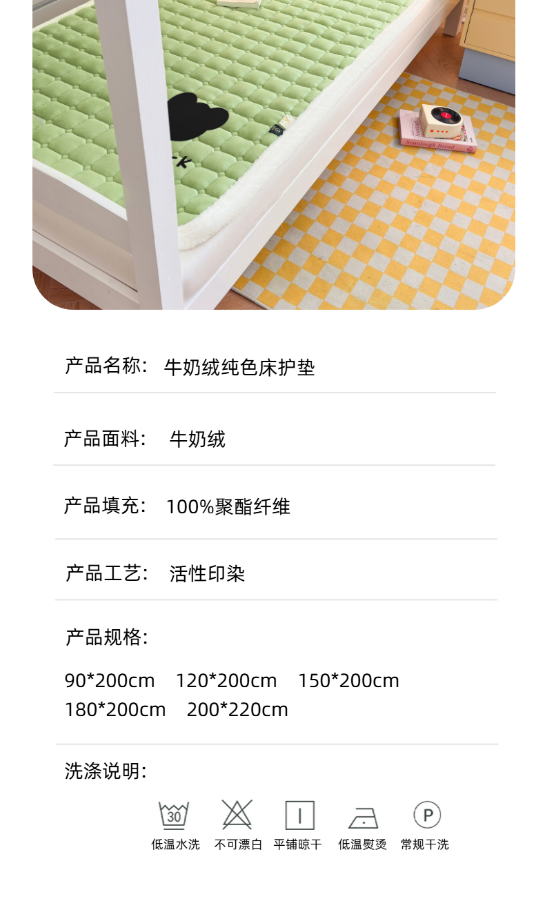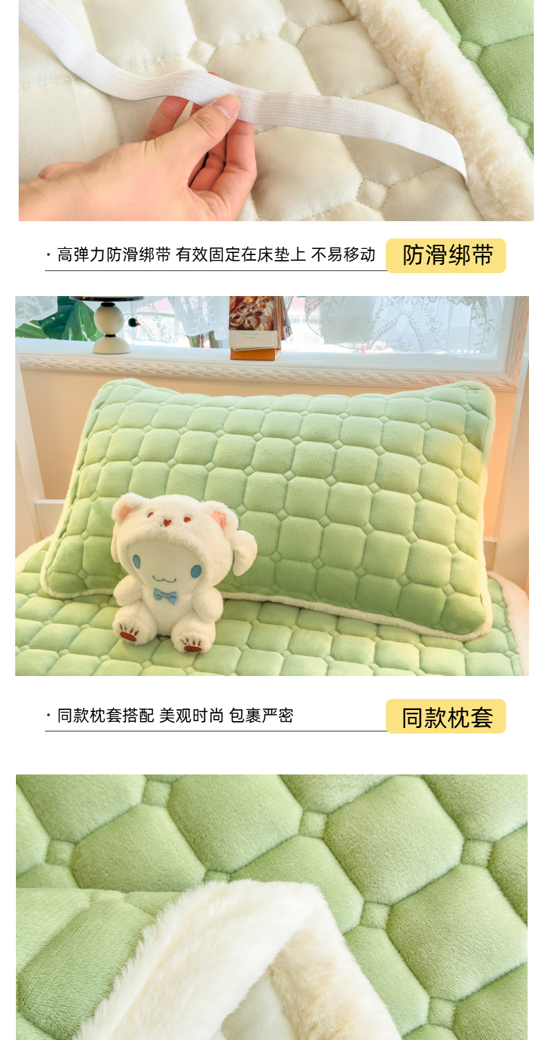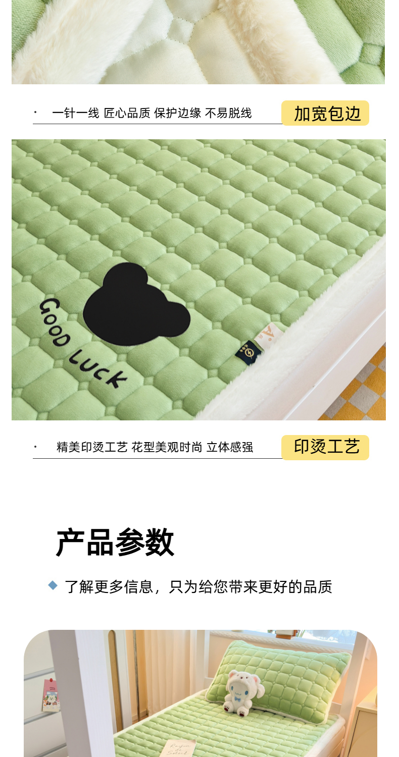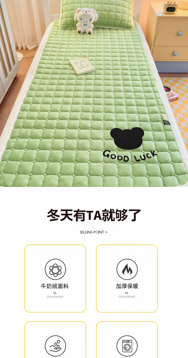 当前位置: 91家纺网 > 商品网购 > 床垫/床褥 > 普通床垫 > 爱屋及屋 2025新款牛奶绒纯色床护垫-好运熊系列 草绿