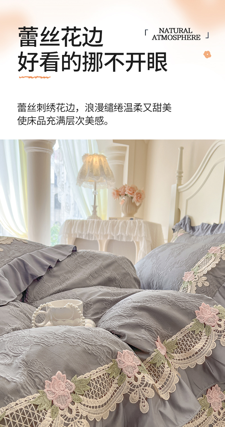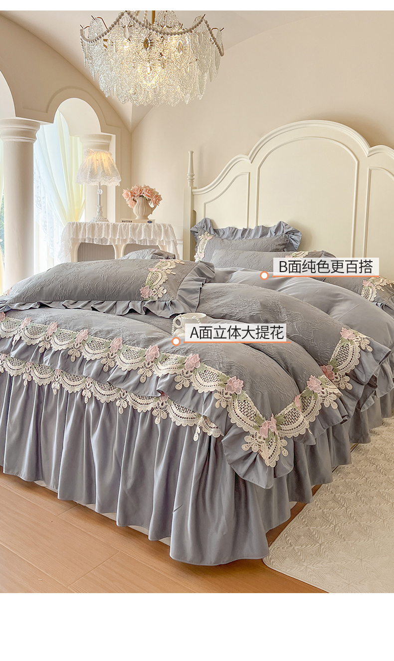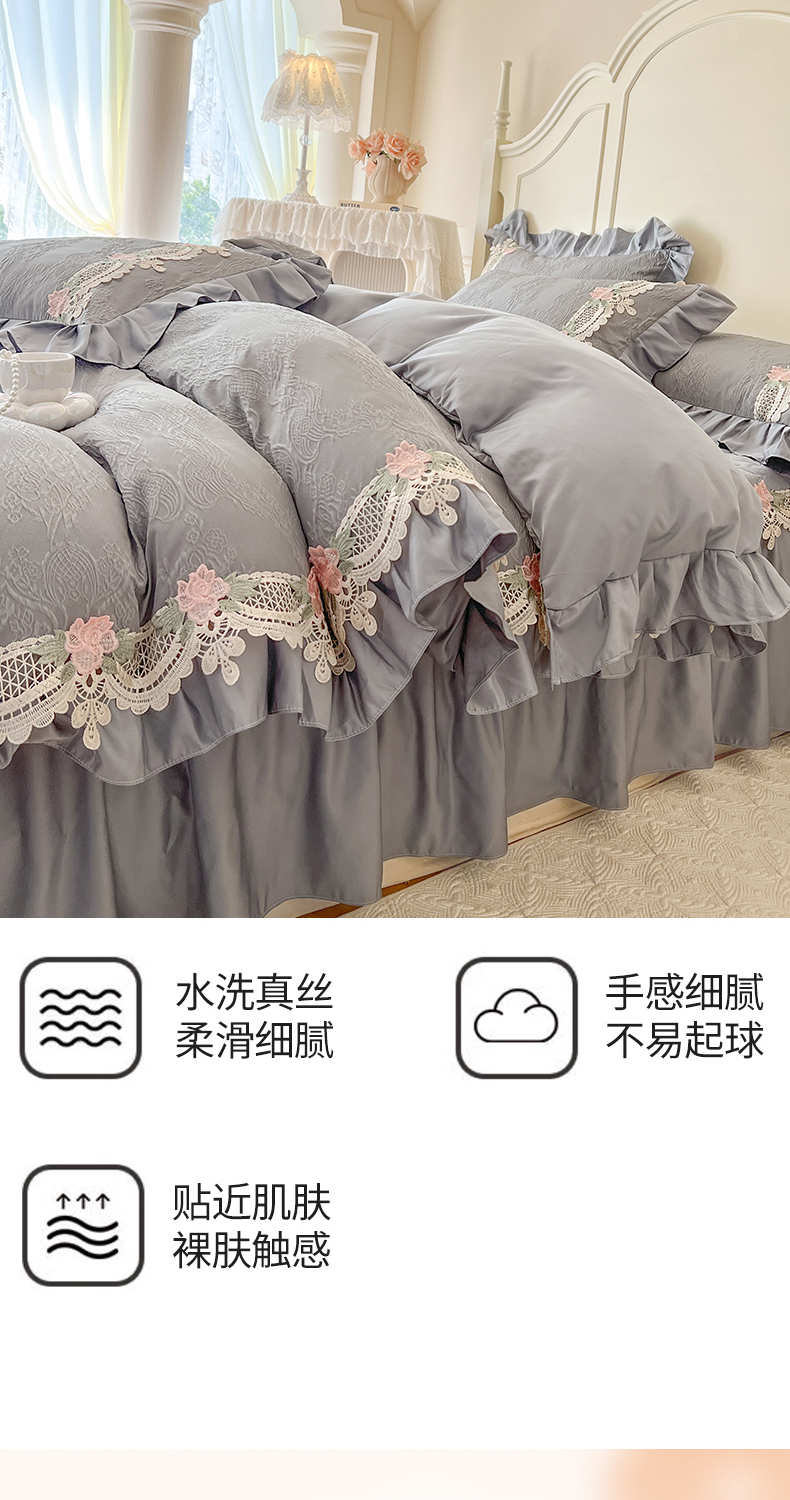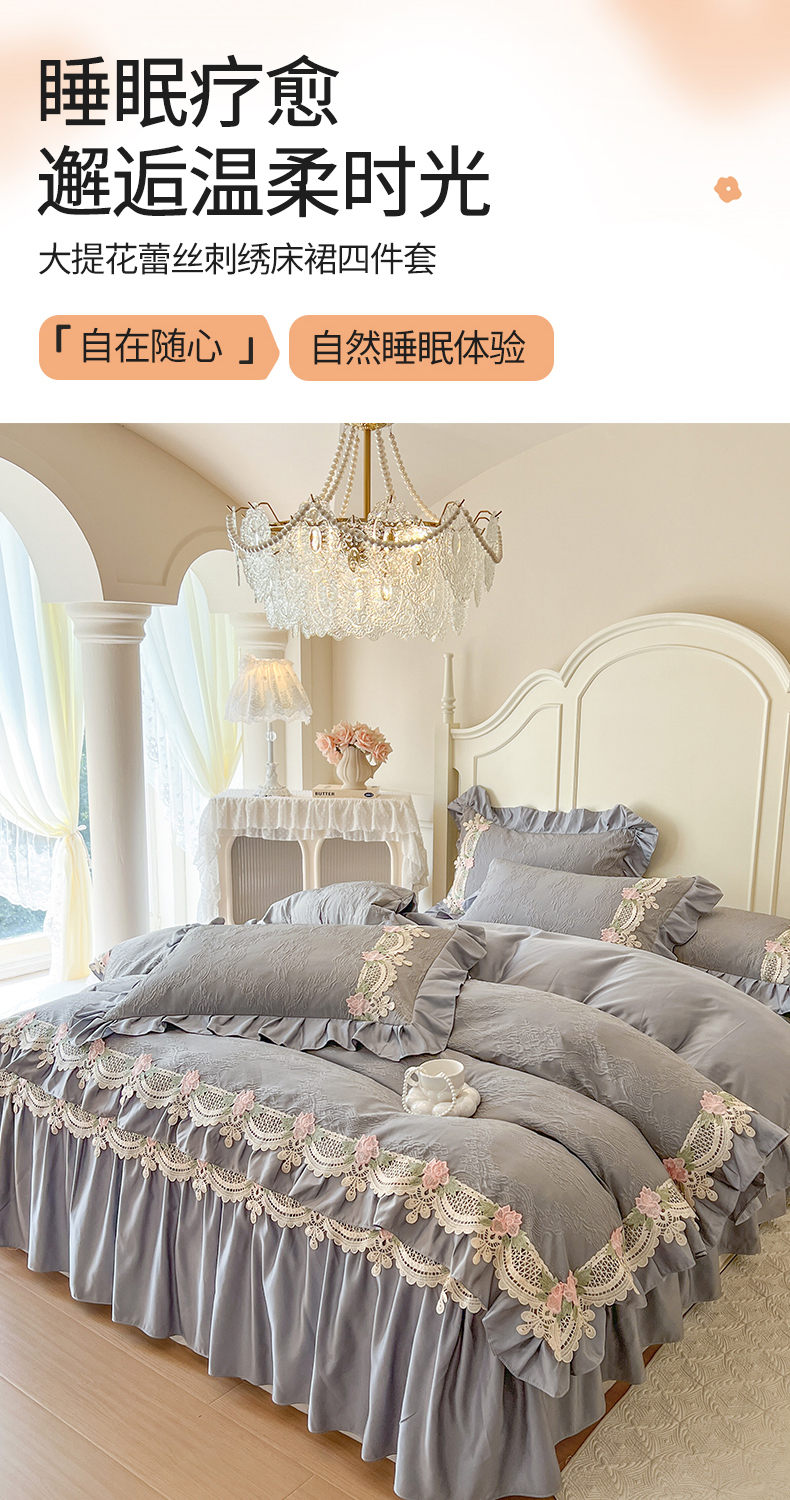 当前位置: 91家纺网 > 商品网购 > 床品套件 > 四件套 > 其它四件套 > 网红馆(ck家纺) 2025新款水洗真丝蕾丝刺绣床裙四件套-慕尚 工装灰