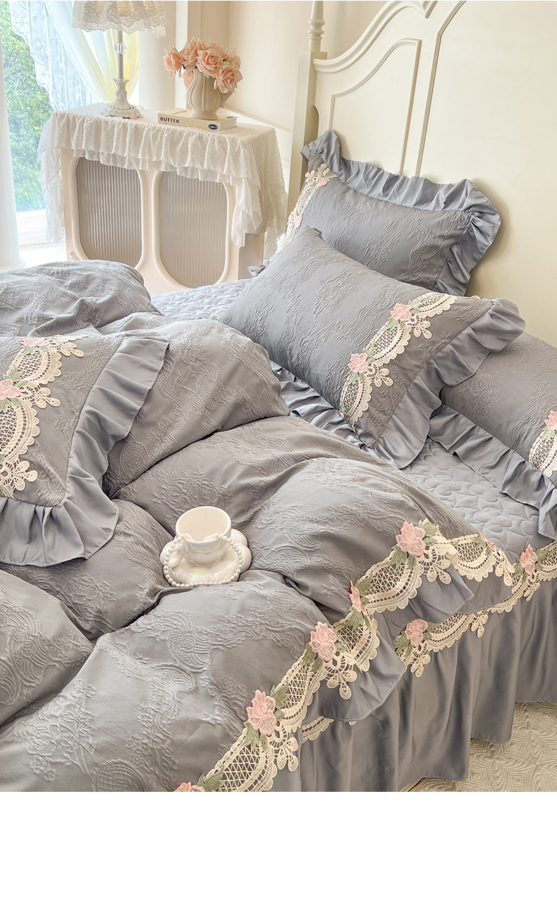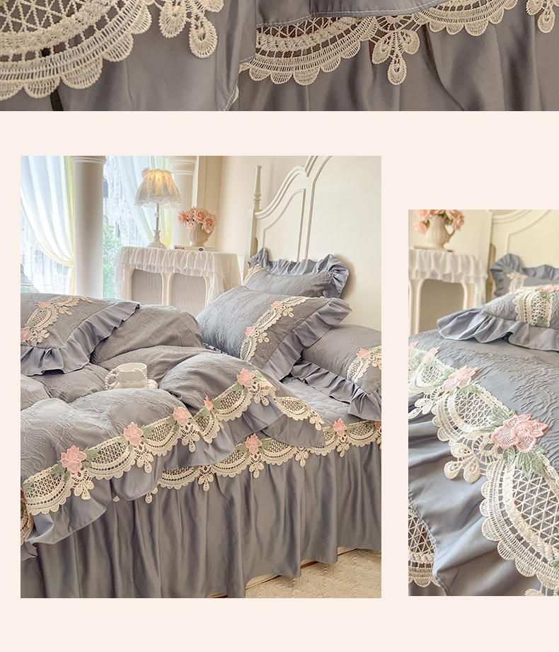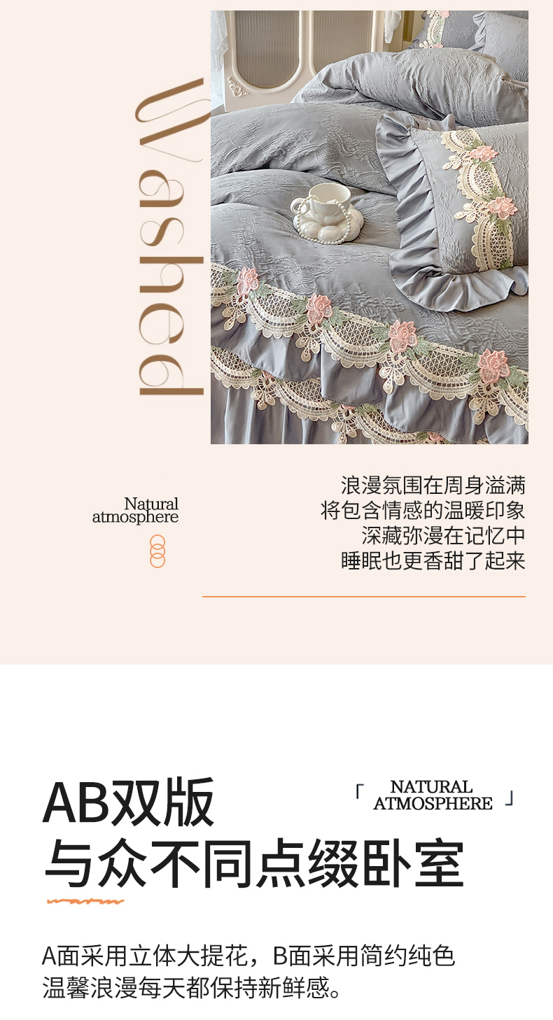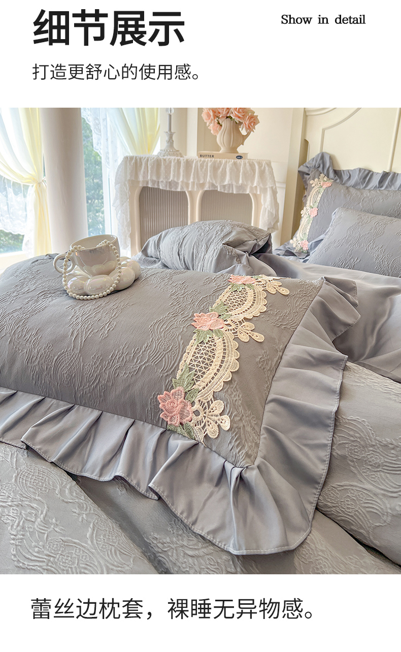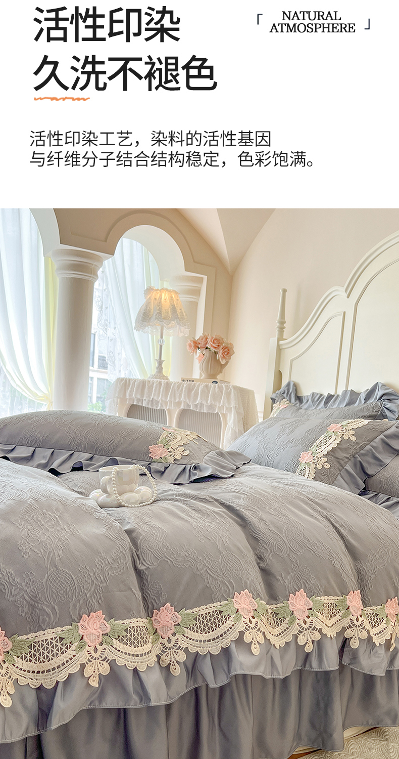 当前位置: 91家纺网 > 商品网购 > 床品套件 > 四件套 > 其它四件套 > 网红馆(ck家纺) 2025新款水洗真丝蕾丝刺绣床裙四件套-慕尚 工装灰